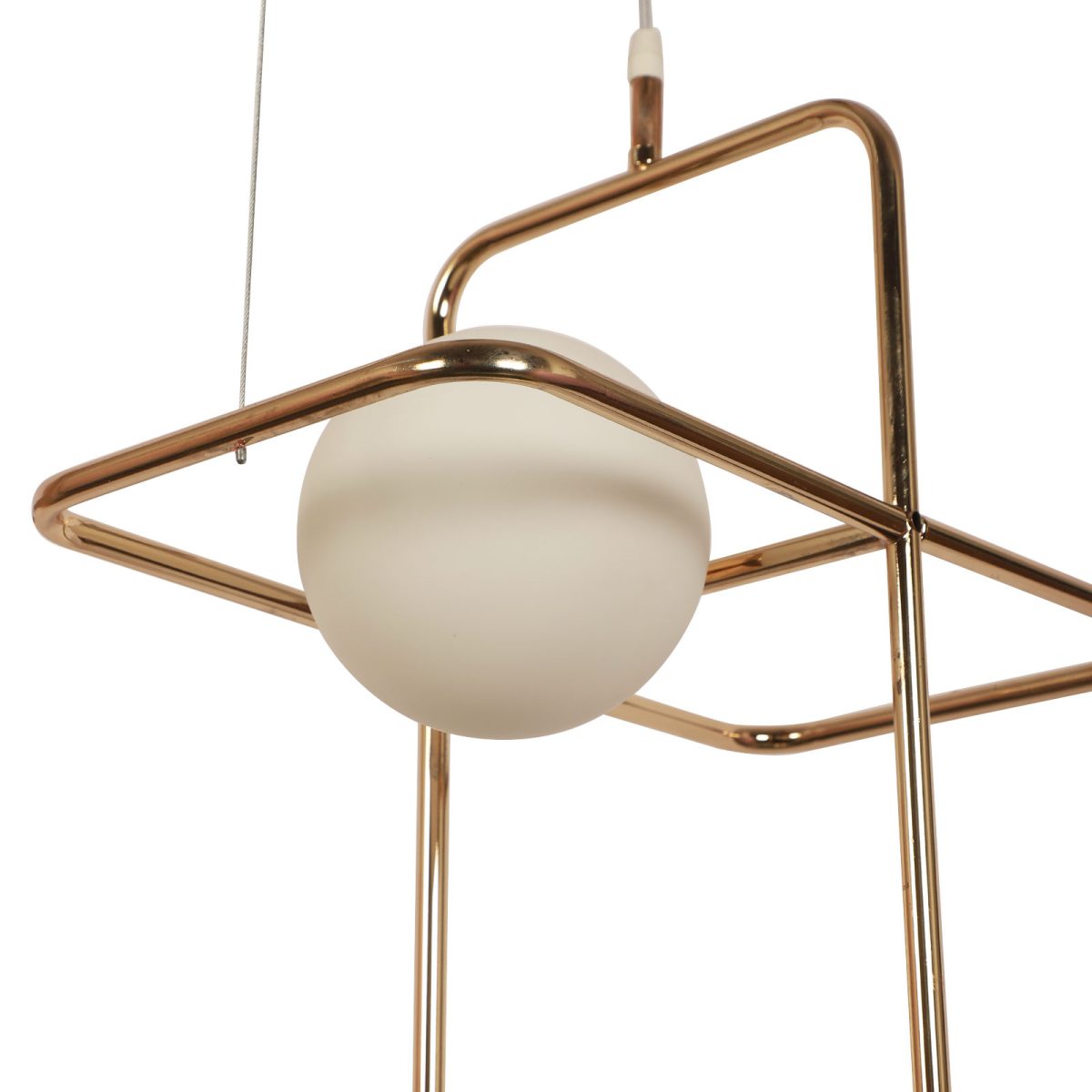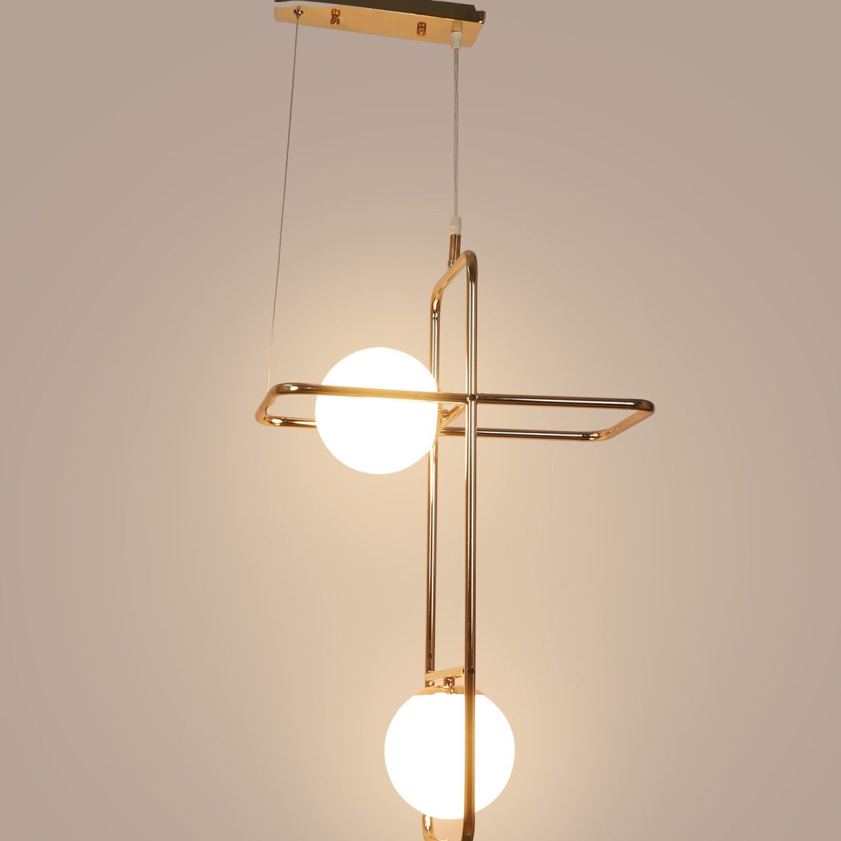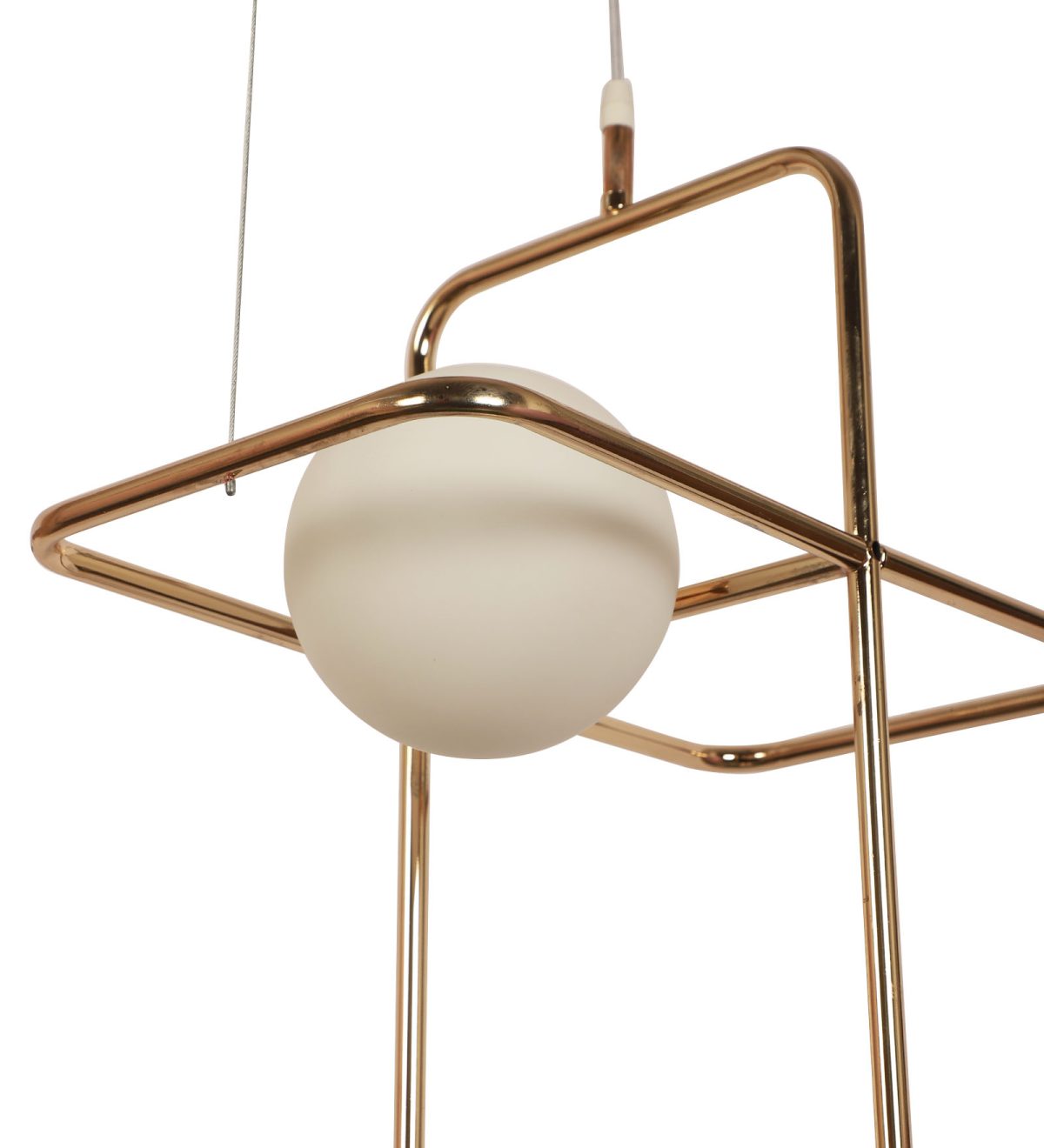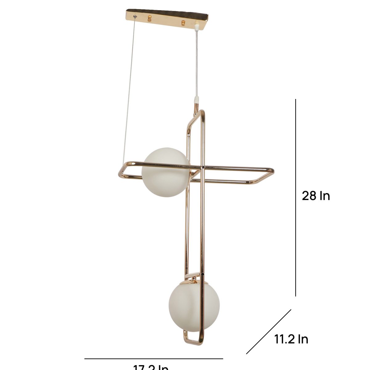 Golden modern hanging light having two lights in white doom glass. The suspension can be adjusted at time of installation to the desired height. Can be customized as per requirement. LAMP NOT INCLUDED.