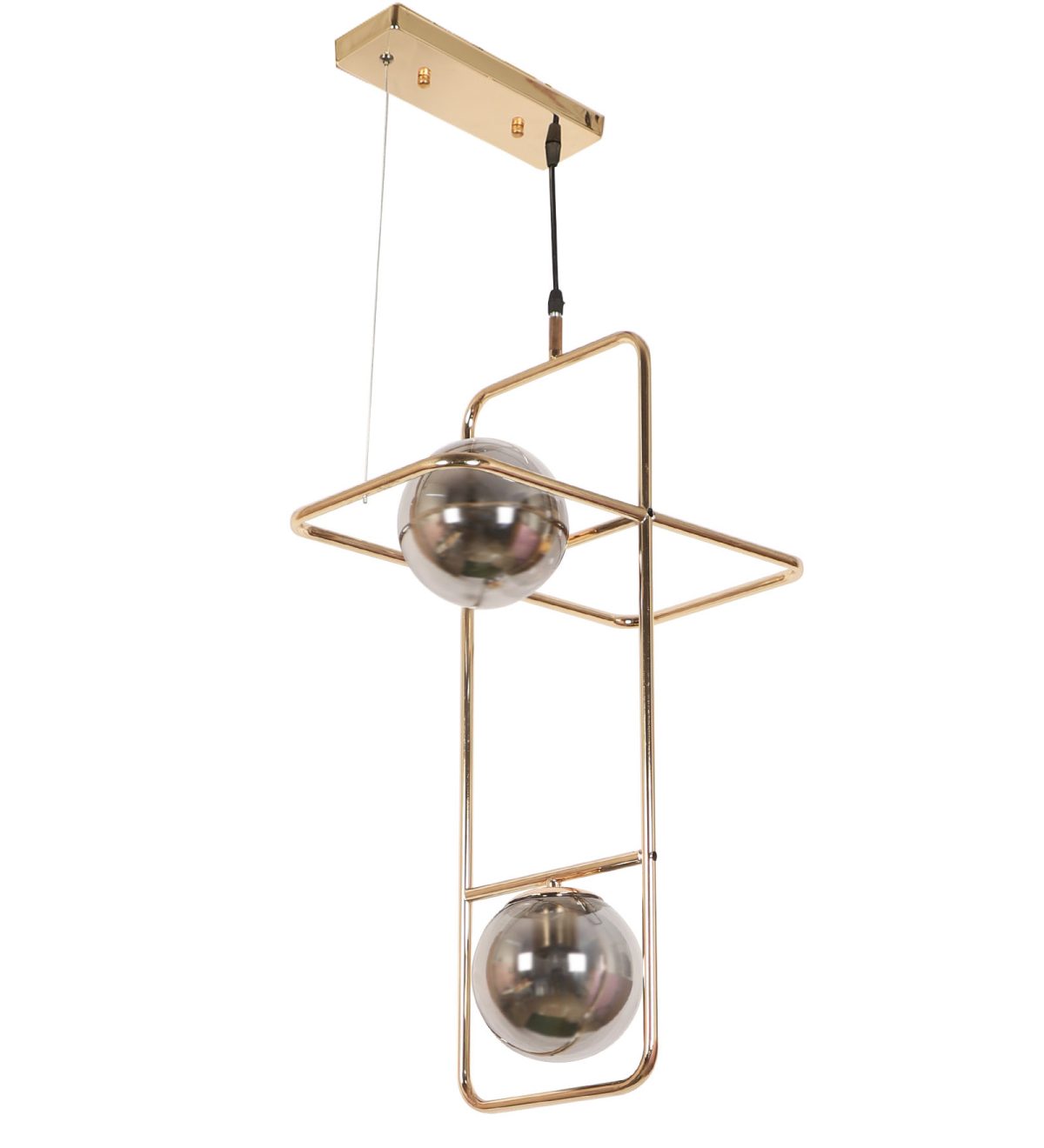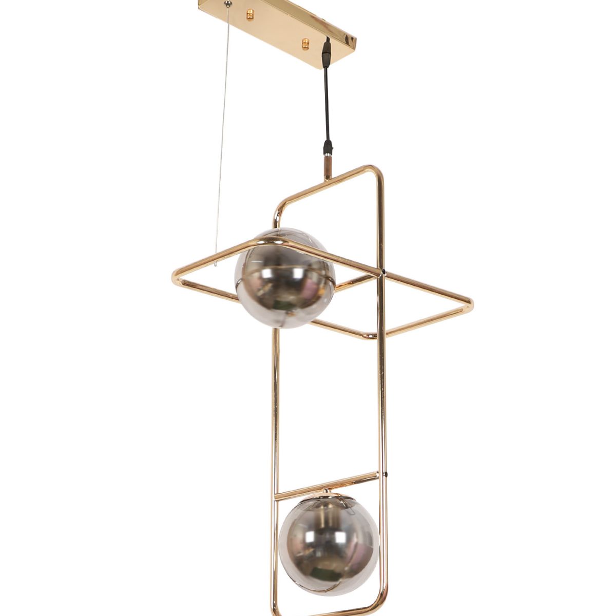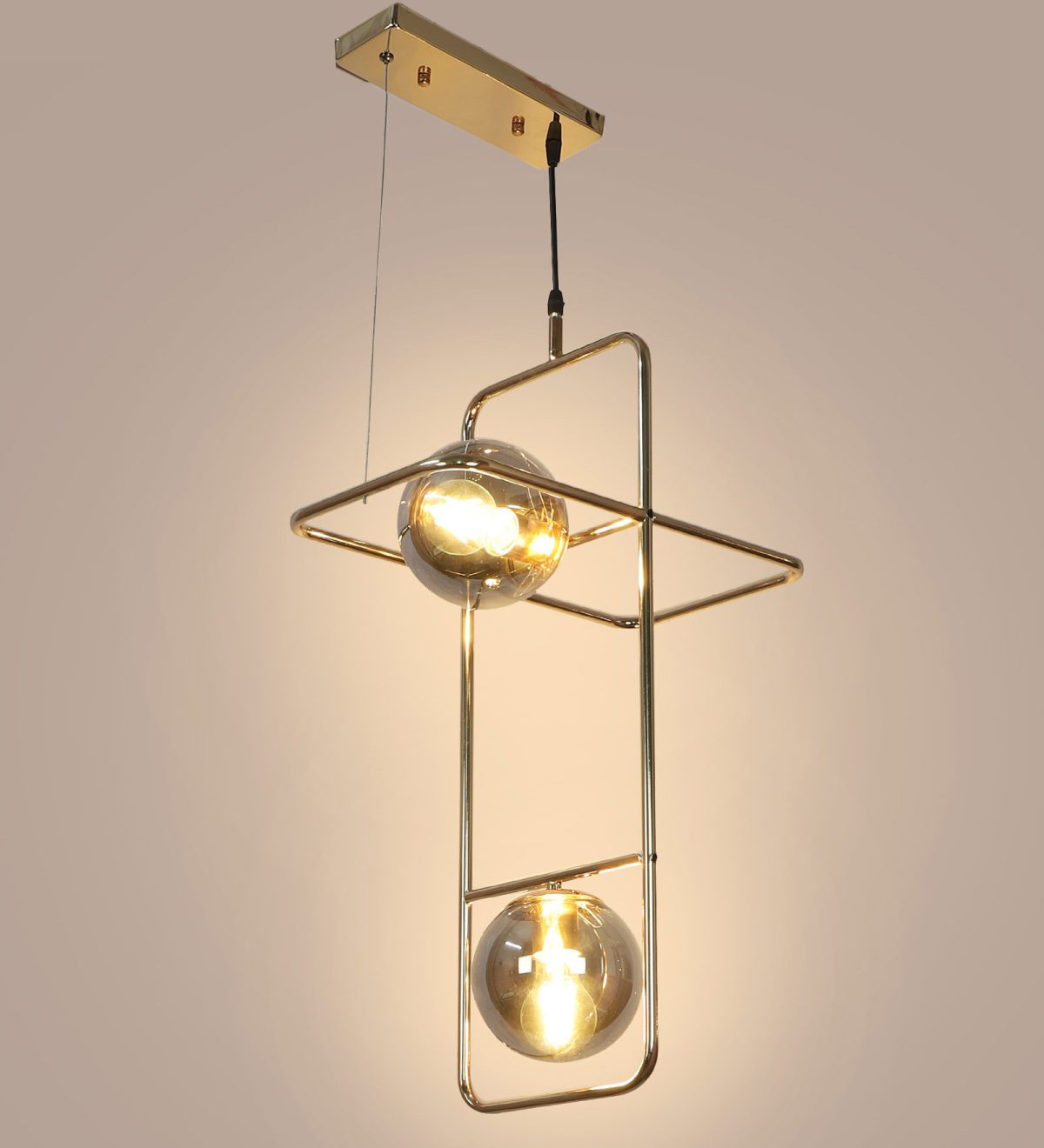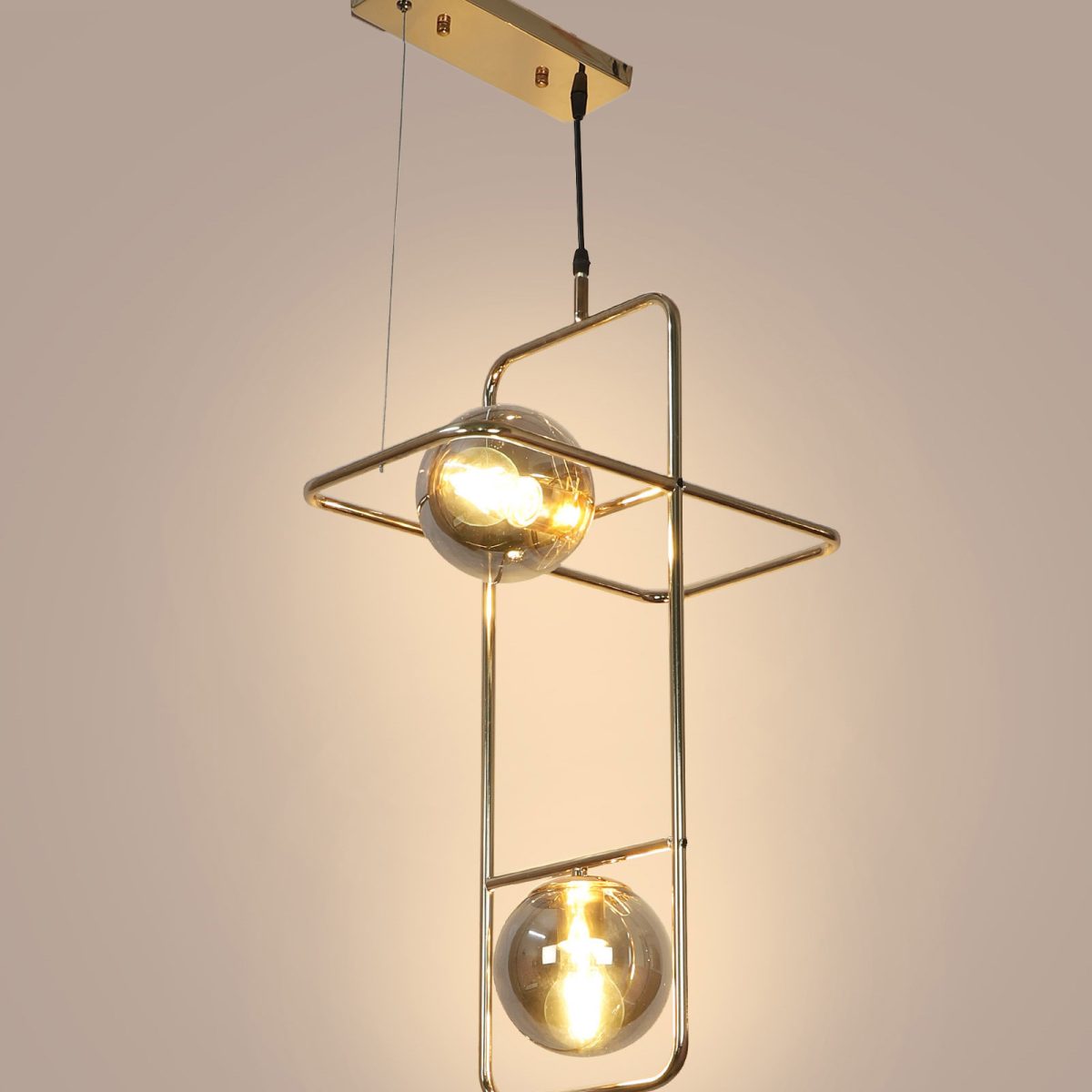 Golden modern hanging light having two lights in white doom glass. The suspension can be adjusted at time of installation to the desired height. Can be customized as per requirement. LAMP NOT INCLUDED.