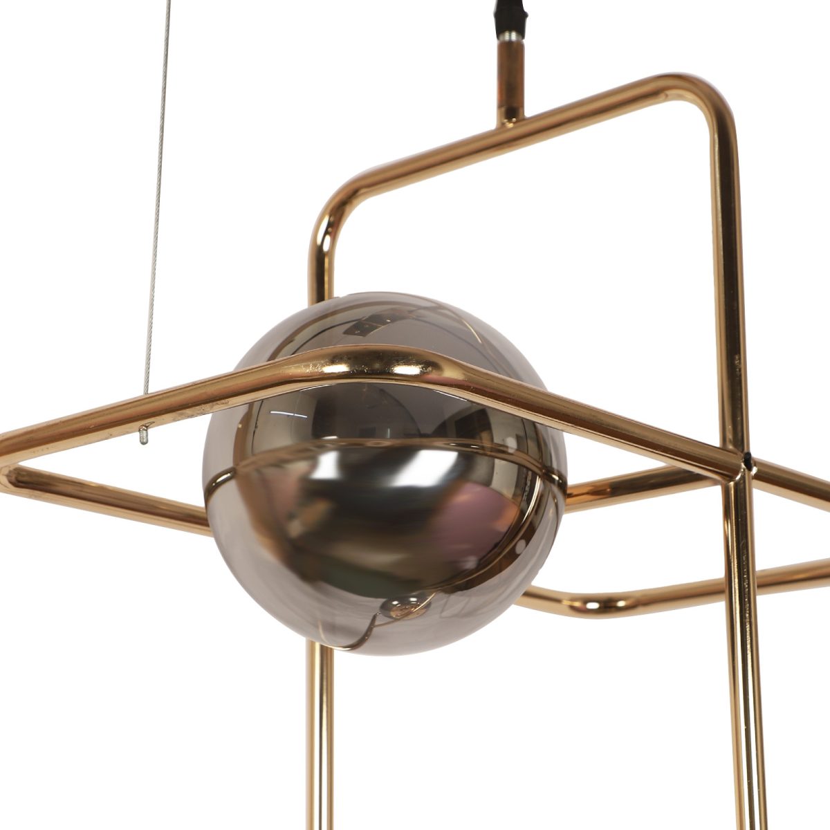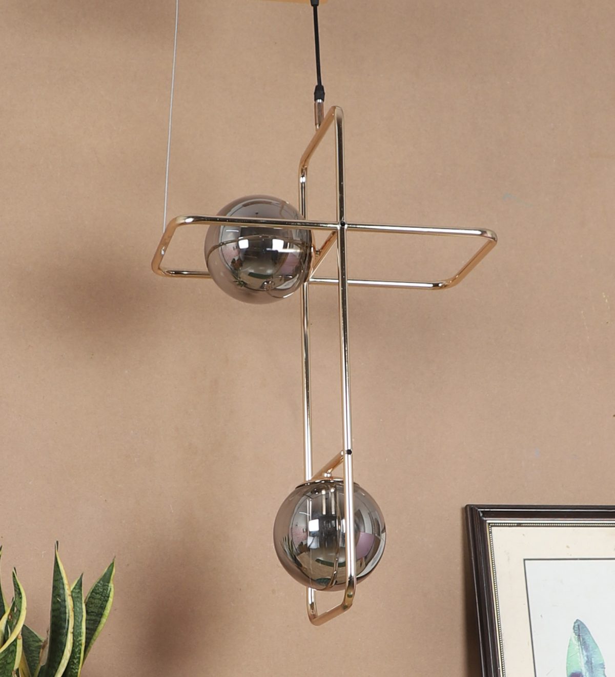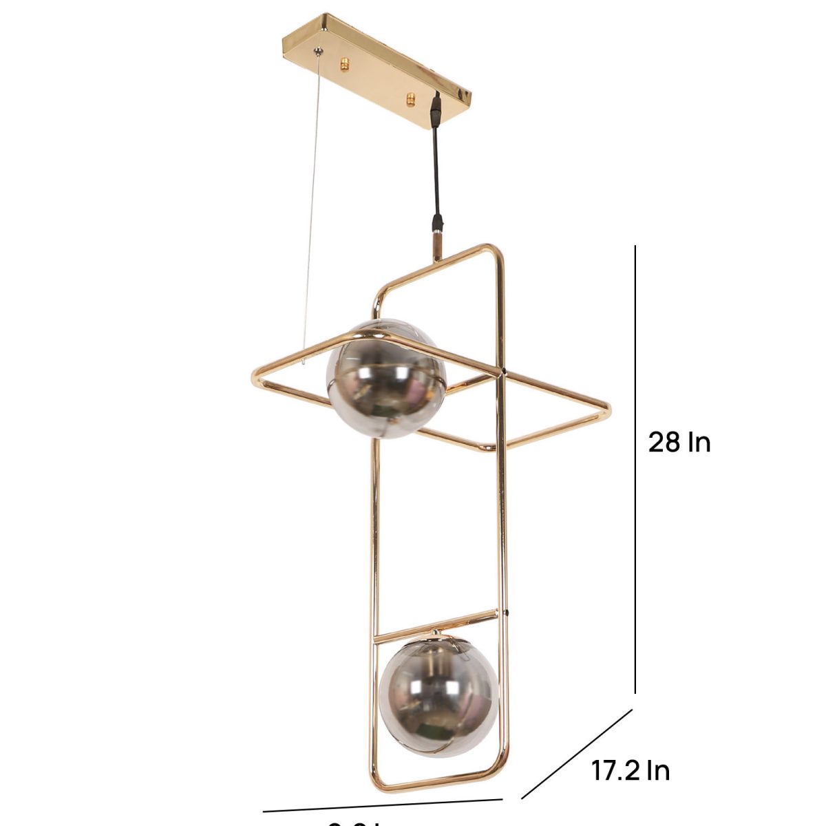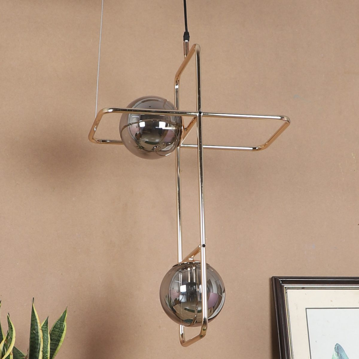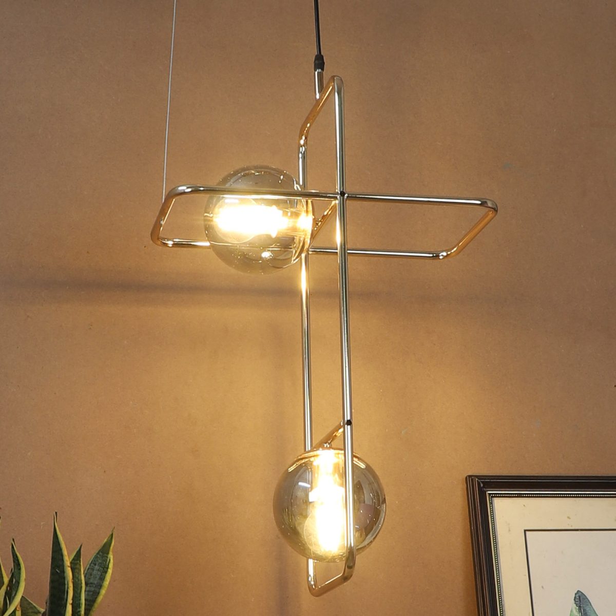 Golden modern hanging light having two lights in white doom glass. The suspension can be adjusted at time of installation to the desired height. Can be customized as per requirement. LAMP NOT INCLUDED.