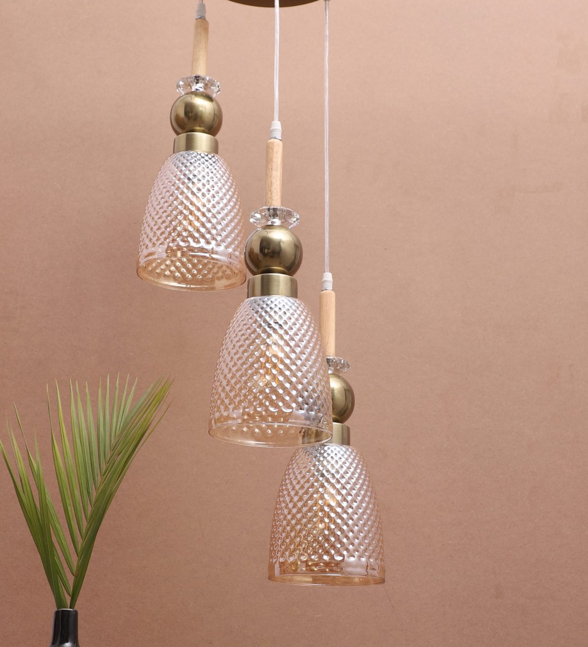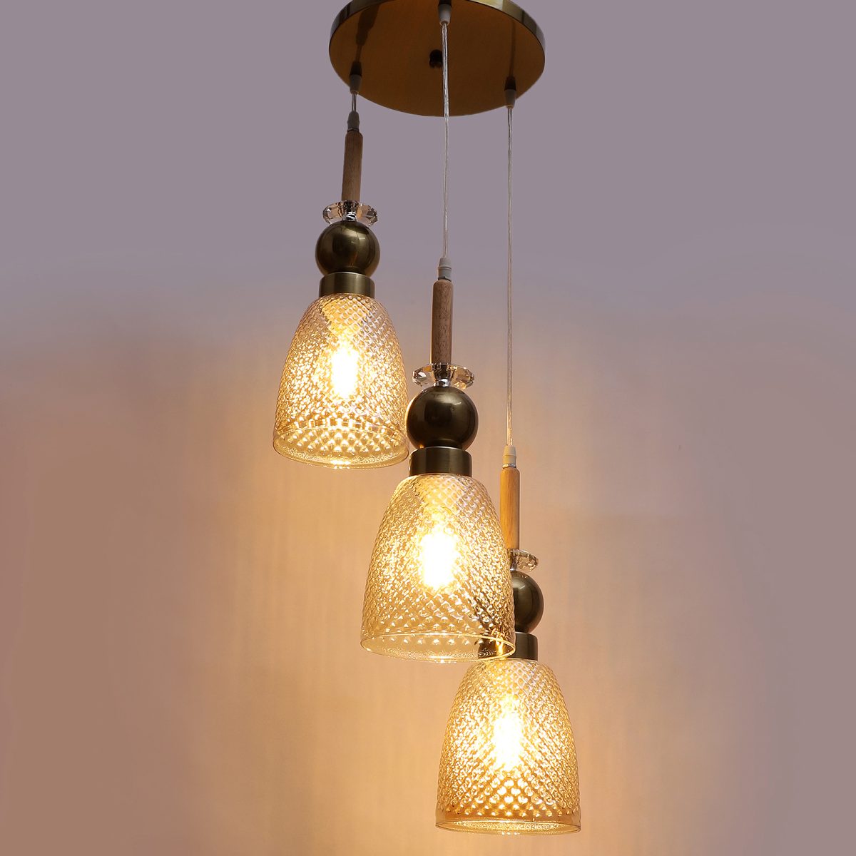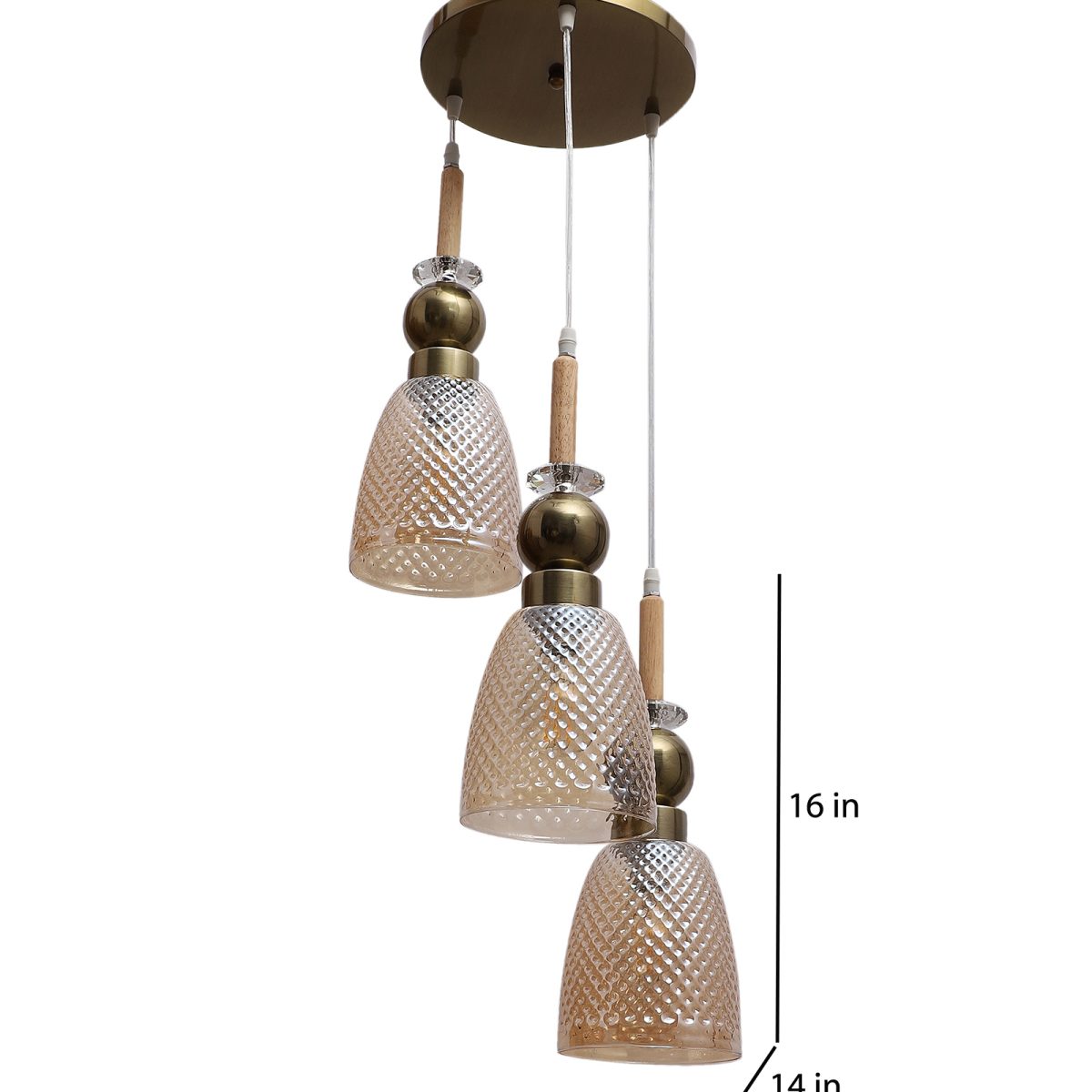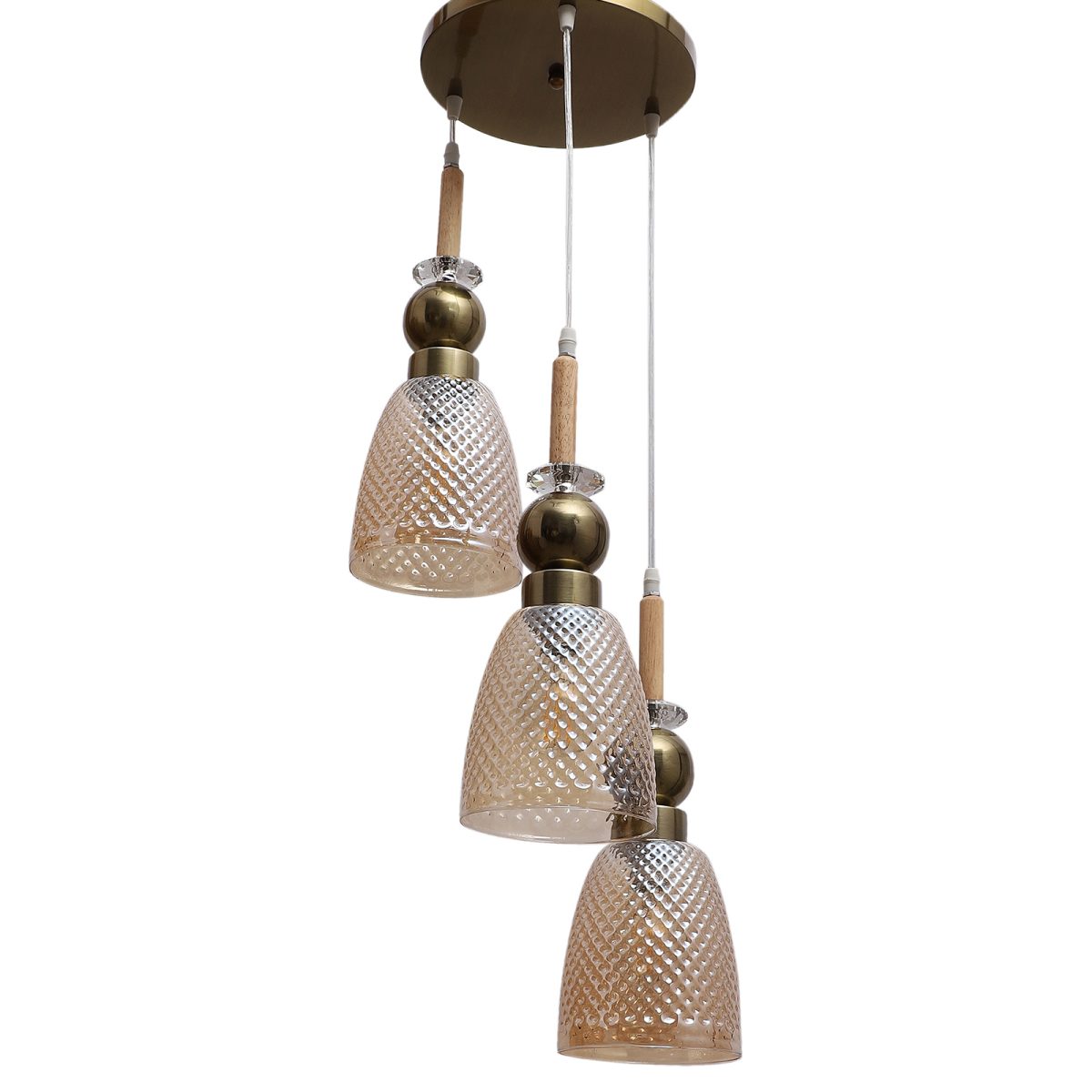 Antique finish tripple hanging light made of wood, mild steel and glass. The suspension can be adjusted at time of installation to the desired height. Can be customized as per requirement. LAMP NOT INCLUDED.