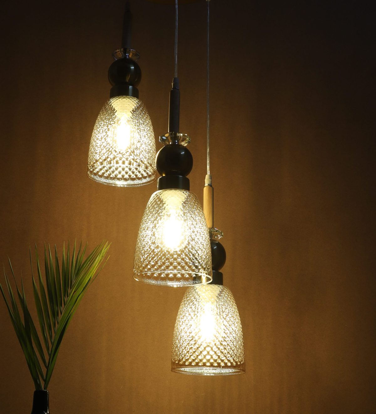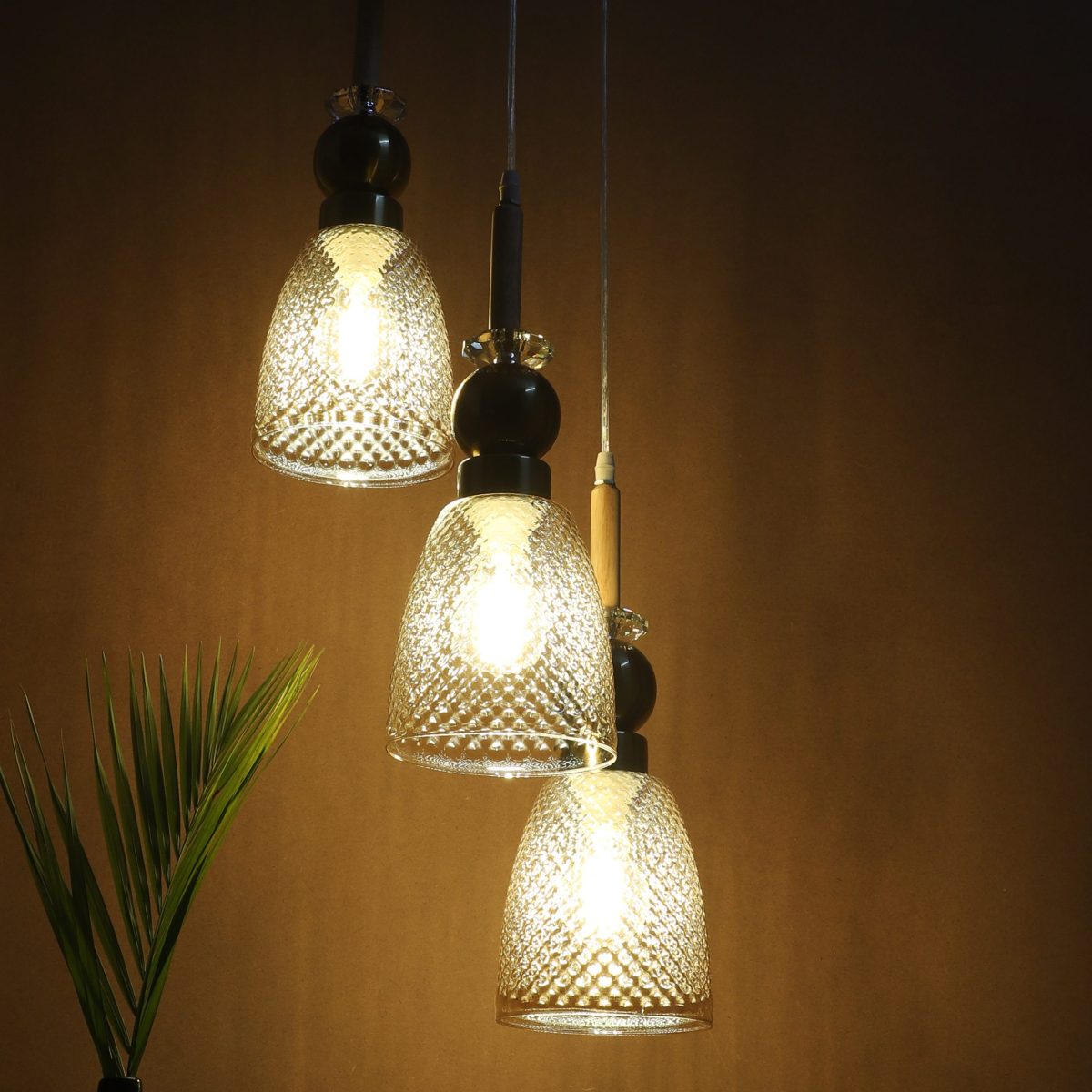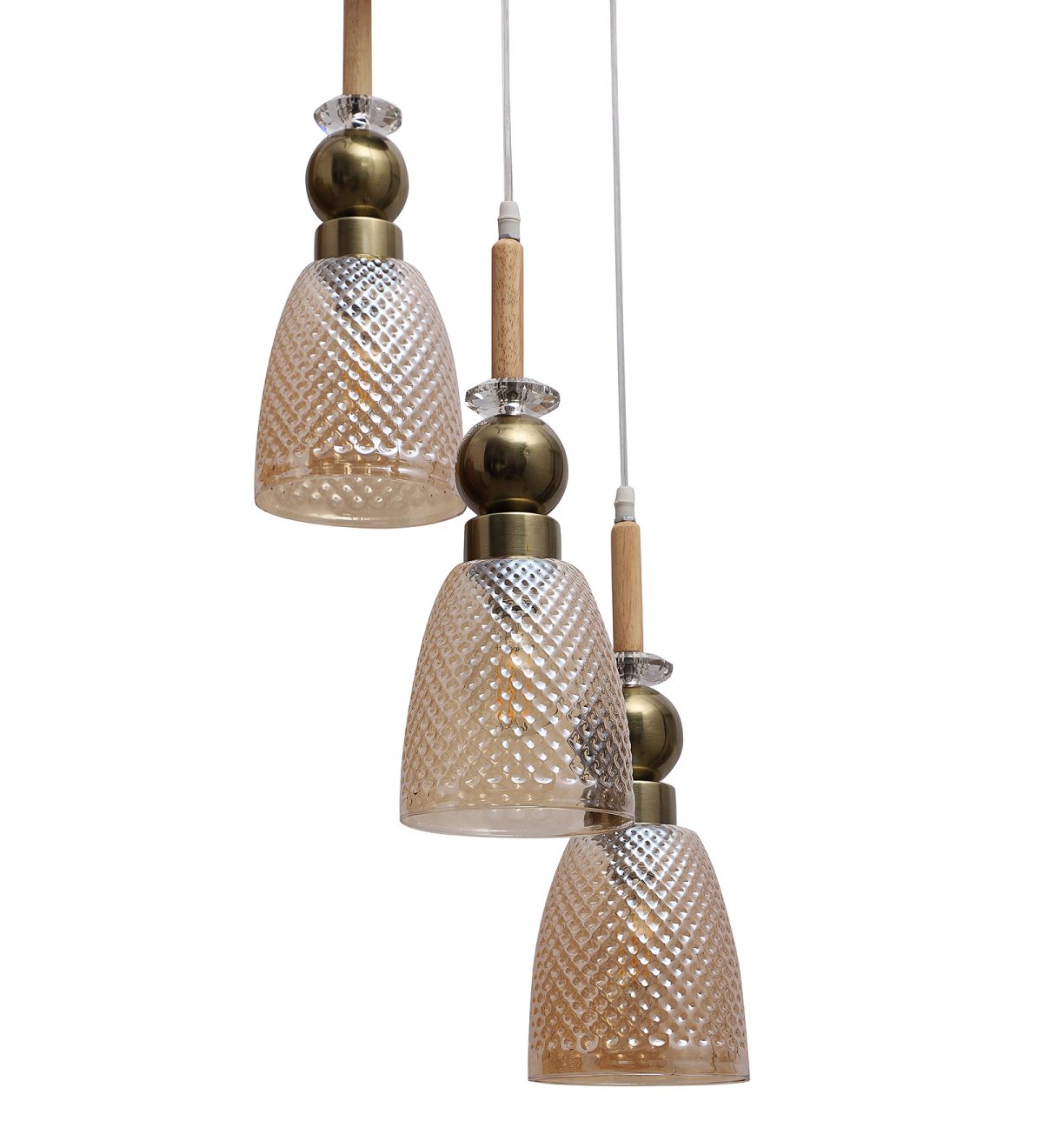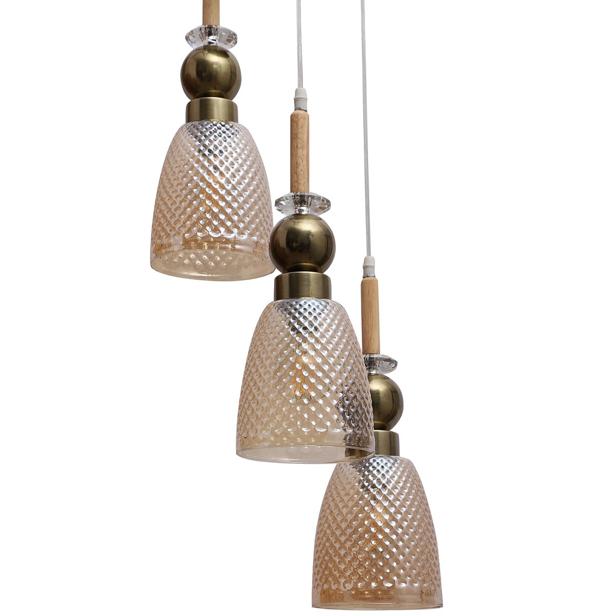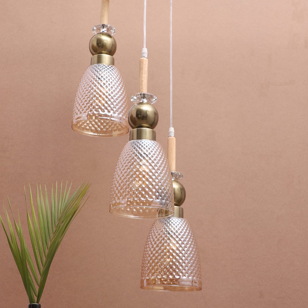 Antique finish tripple hanging light made of wood, mild steel and glass. The suspension can be adjusted at time of installation to the desired height. Can be customized as per requirement. LAMP NOT INCLUDED.