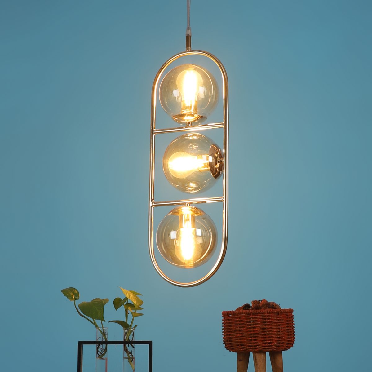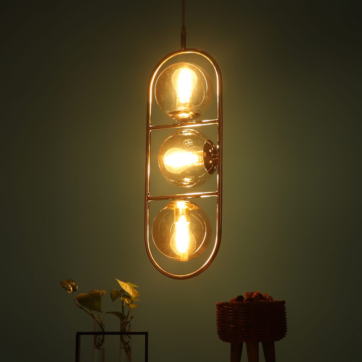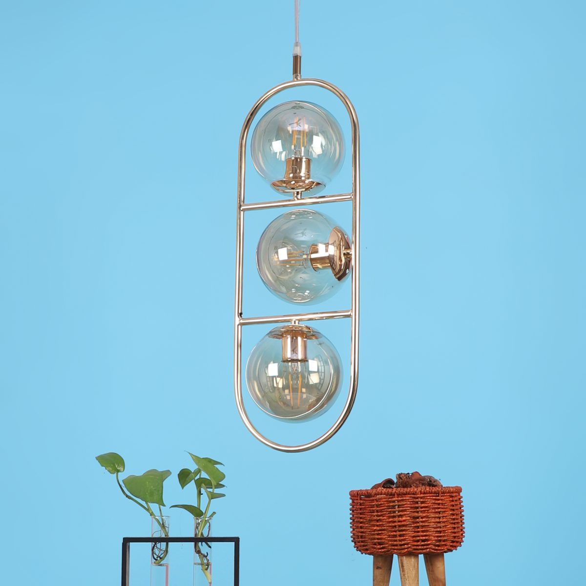 Gold modern mild steel hanging light having three lights in champaign coloured doom glass. The suspension can be adjusted at time of installation to the desired height. It is maintenance free, comes with an E27 holder, only the change of lamp is required, which is available locally everywhere. LED filament lamp is recommended to enhance its beauty. Application includes both residential and commercial premises wherever it matches with your interiors. Can be customized as per requirement. LAMP NOT INCLUDED.