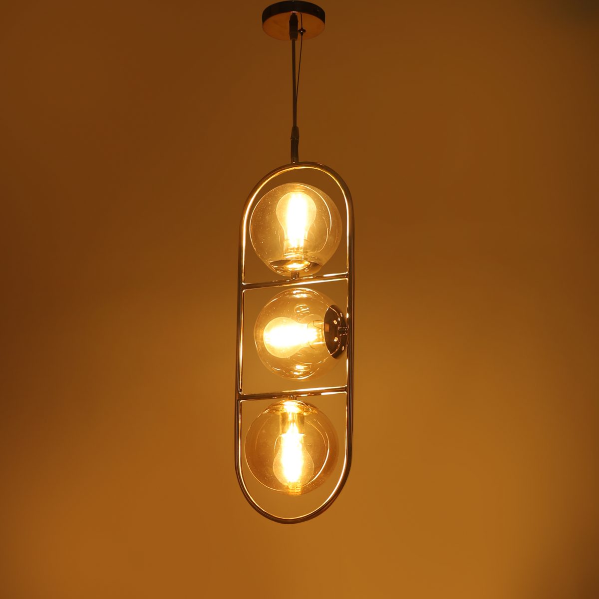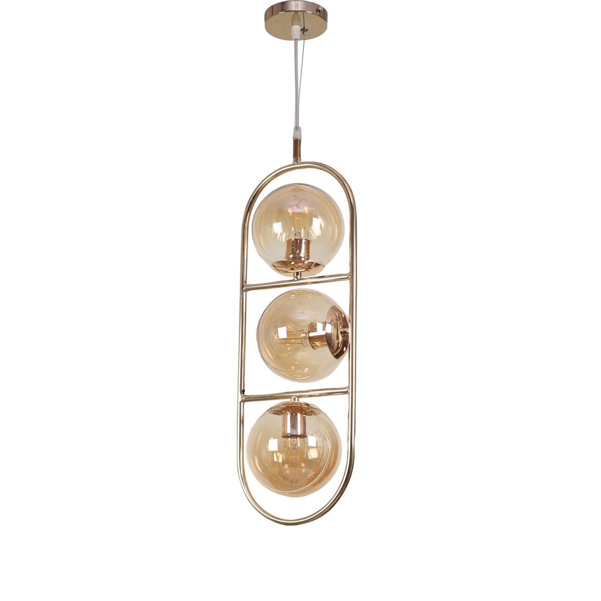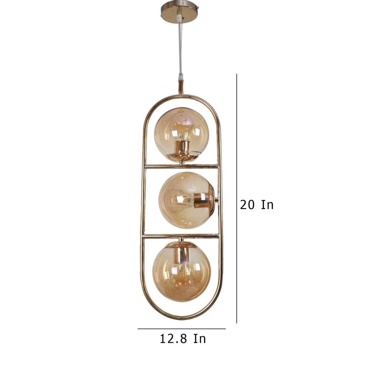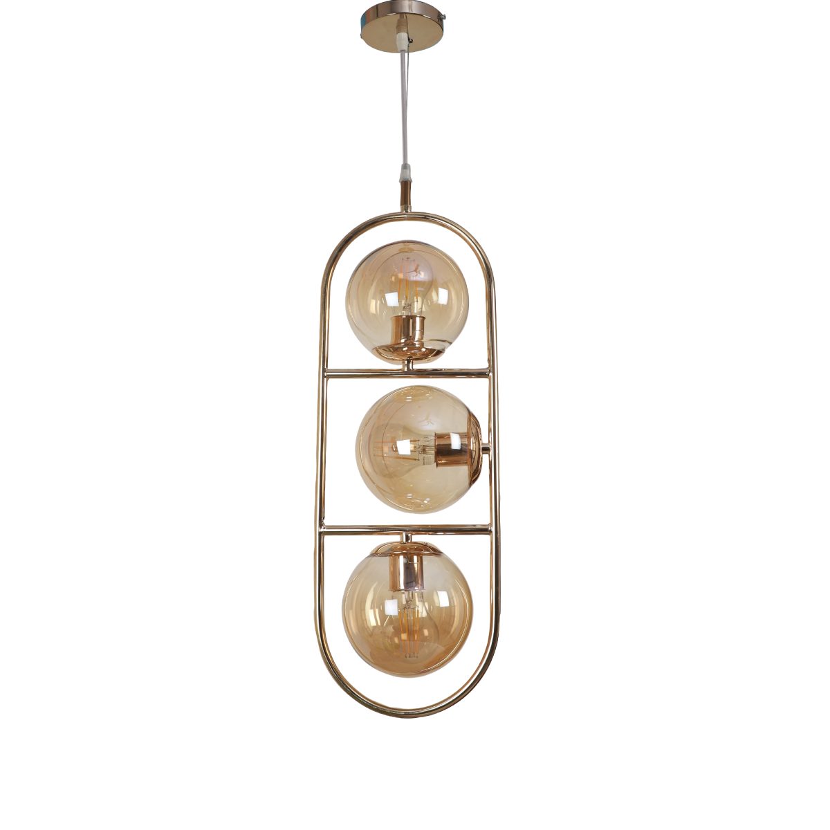 Gold modern mild steel hanging light having three lights in champaign coloured doom glass. The suspension can be adjusted at time of installation to the desired height. It is maintenance free, comes with an E27 holder, only the change of lamp is required, which is available locally everywhere. LED filament lamp is recommended to enhance its beauty. Application includes both residential and commercial premises wherever it matches with your interiors. Can be customized as per requirement. LAMP NOT INCLUDED.