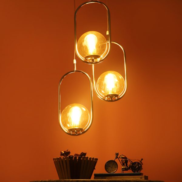 Gold modern mild steel hanging light having three lights in champaign coloured doom glass. The suspension can be adjusted at time of installation to the desired height. It is maintenance free, comes with an E27 holder, only the change of lamp is required, which is available locally everywhere. LED filament lamp is recommended to enhance its beauty. Application includes both residential and commercial premises wherever it matches with your interiors. Can be customized as per requirement. LAMP NOT INCLUDED.