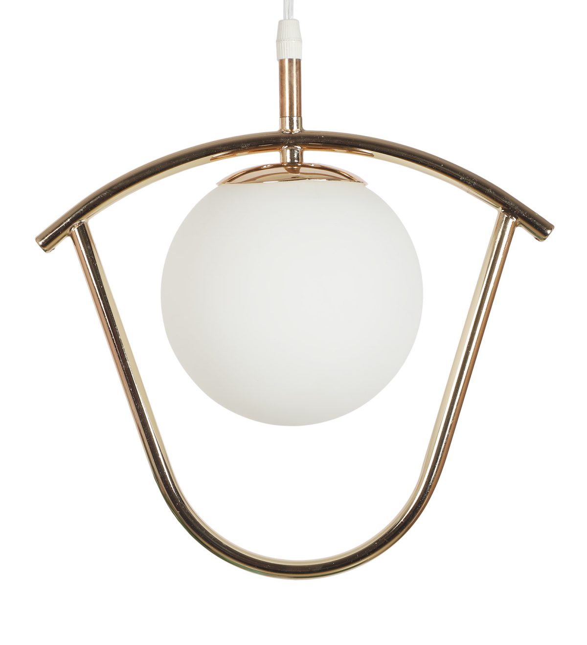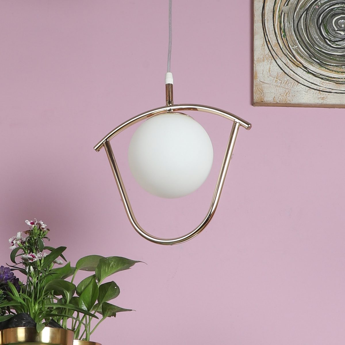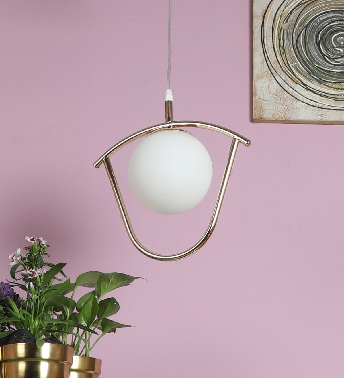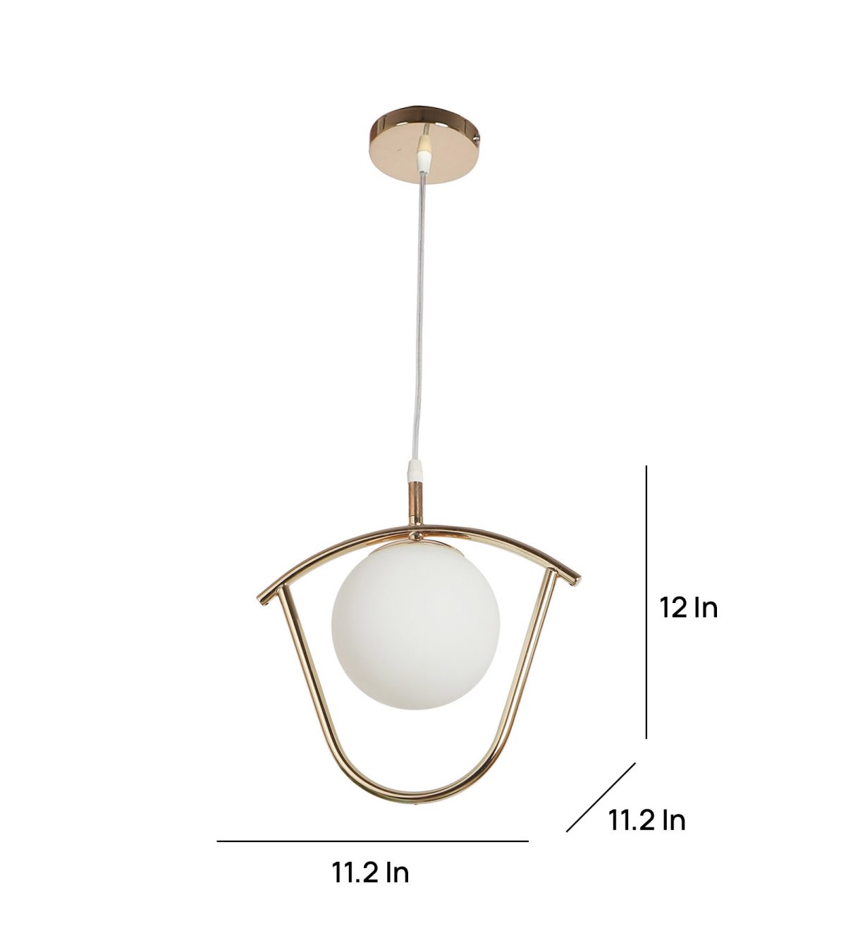 Golden finish single hanging light in white doom glass. The suspension can be adjusted at time of installation to the desired height. Can be customized as per requirement. Available in clusters of different numbers as per requirement. LAMP NOT INCLUDED.