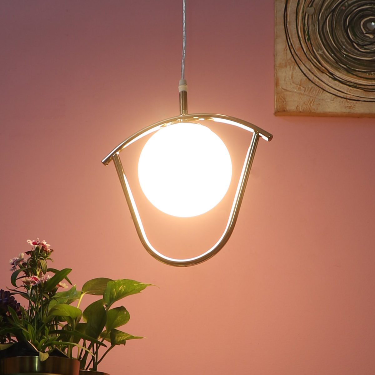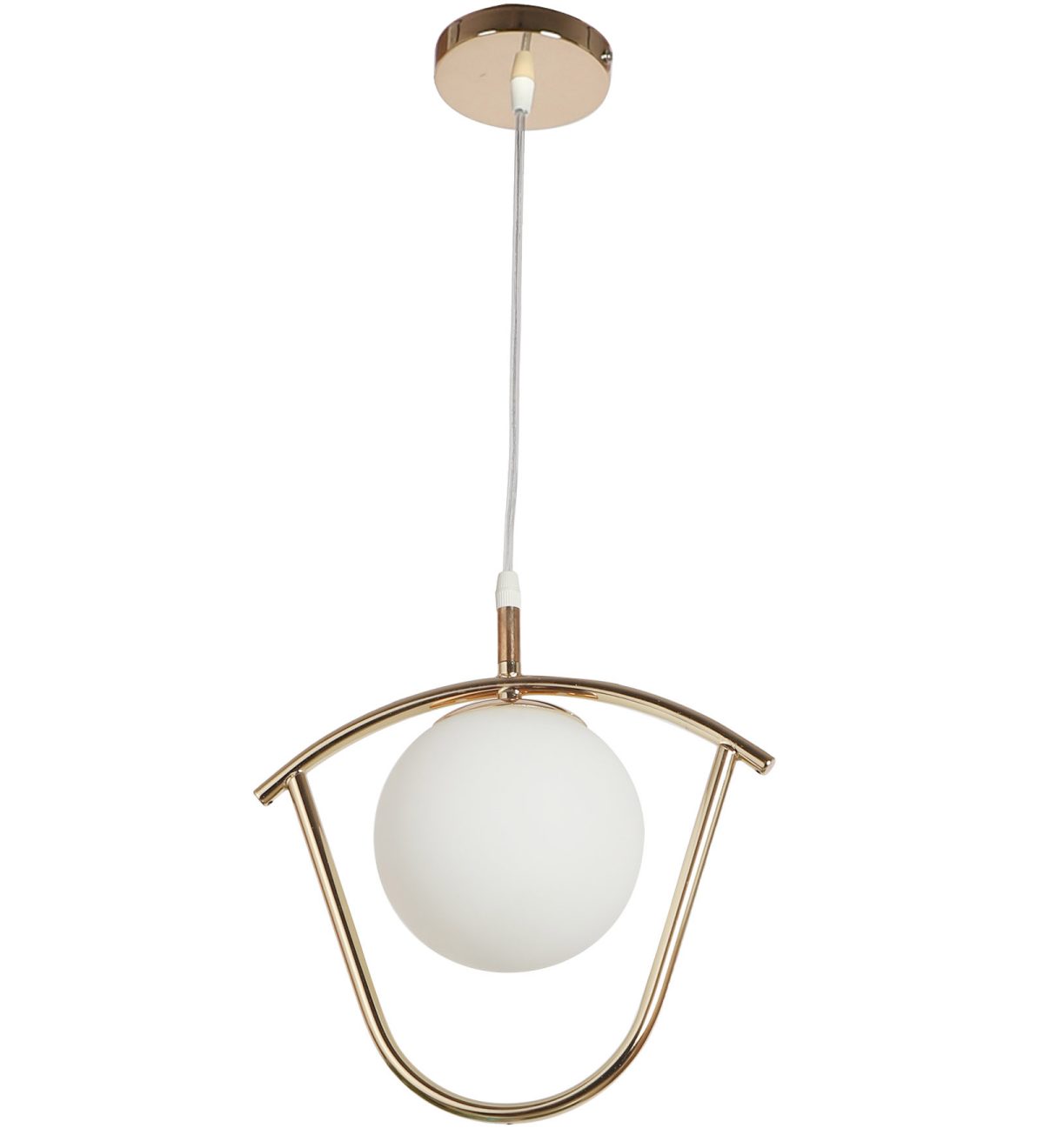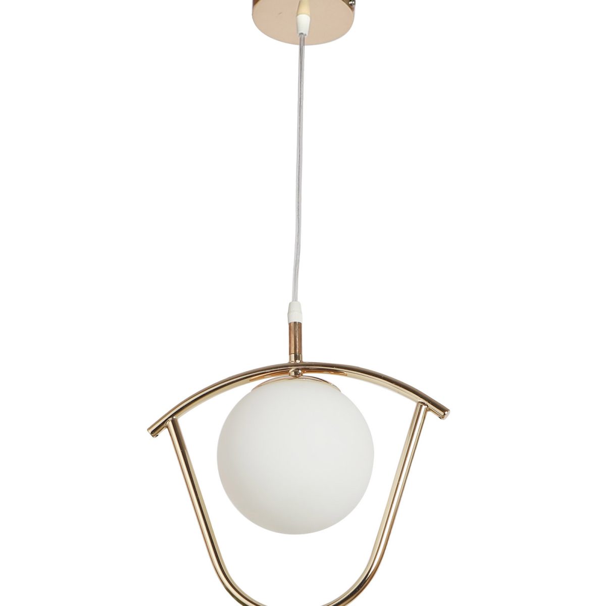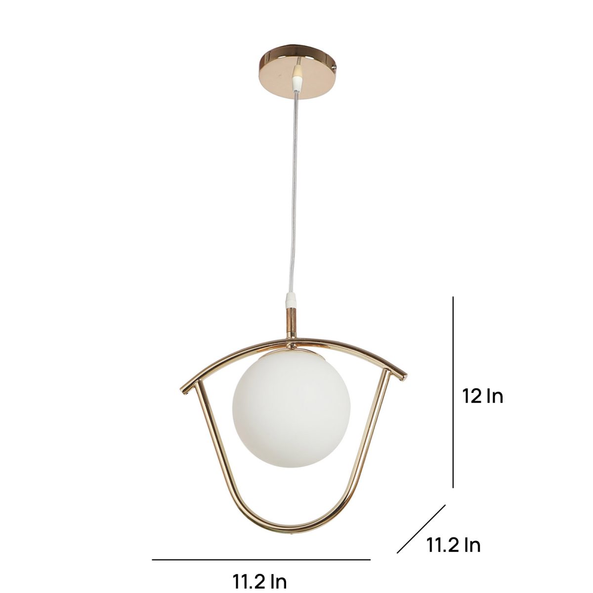 Golden finish single hanging light in white doom glass. The suspension can be adjusted at time of installation to the desired height. Can be customized as per requirement. Available in clusters of different numbers as per requirement. LAMP NOT INCLUDED.