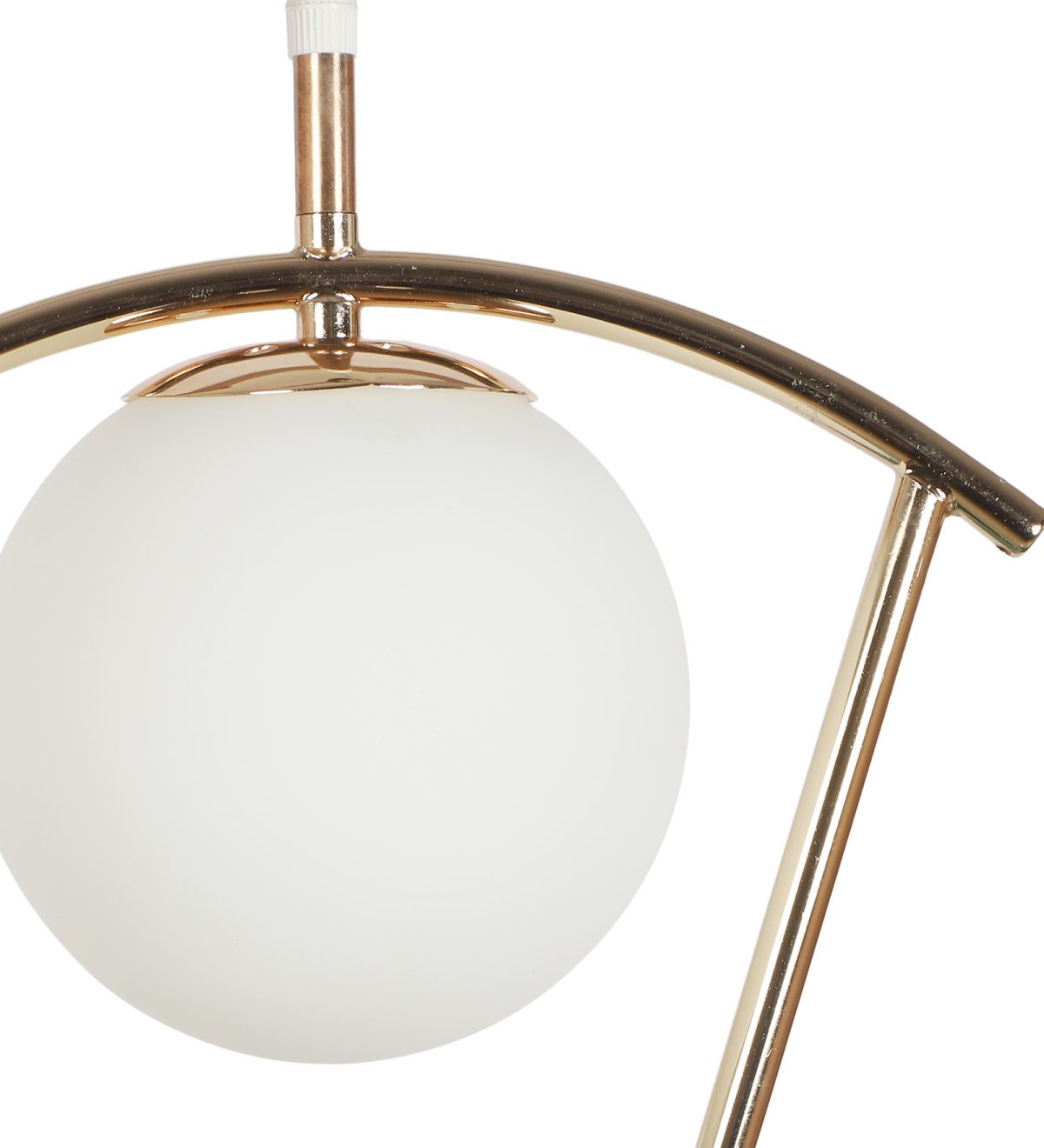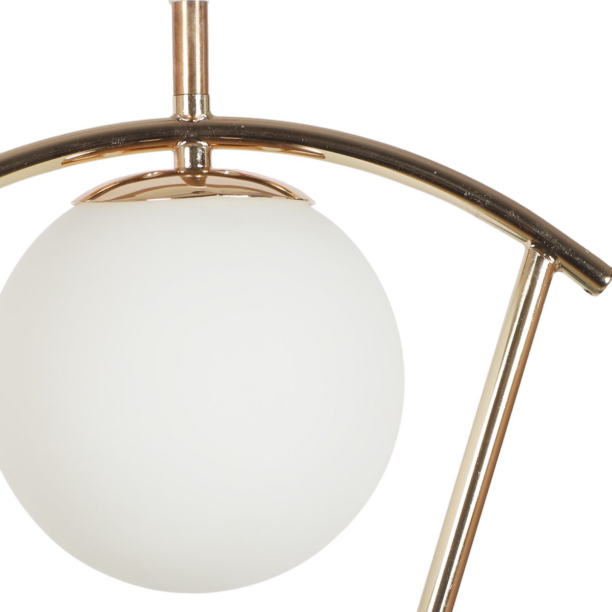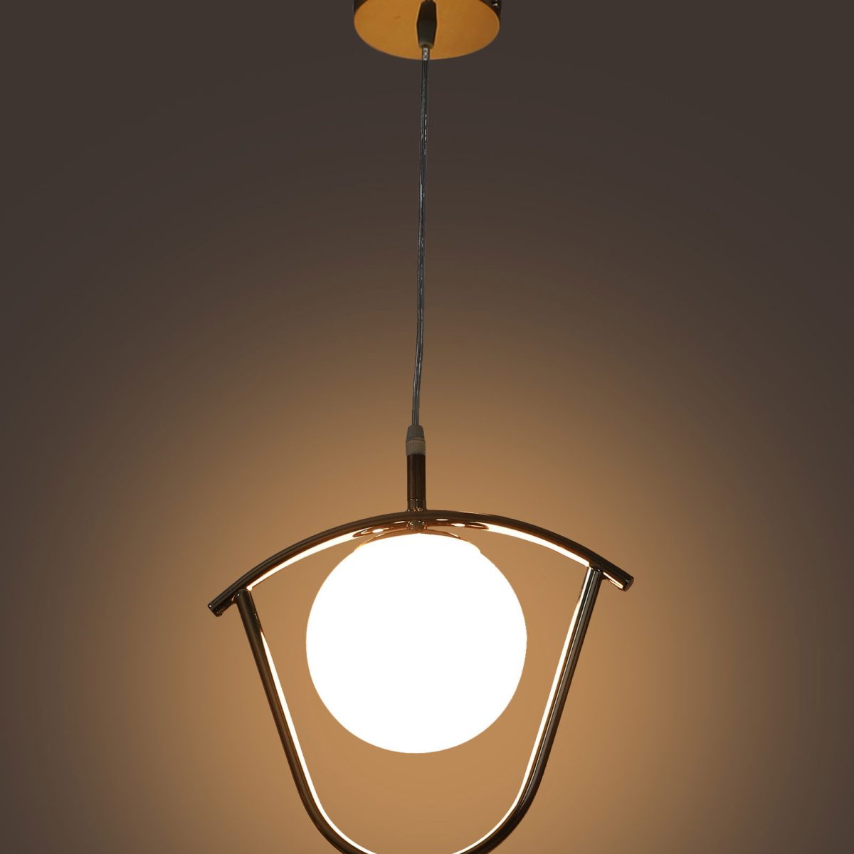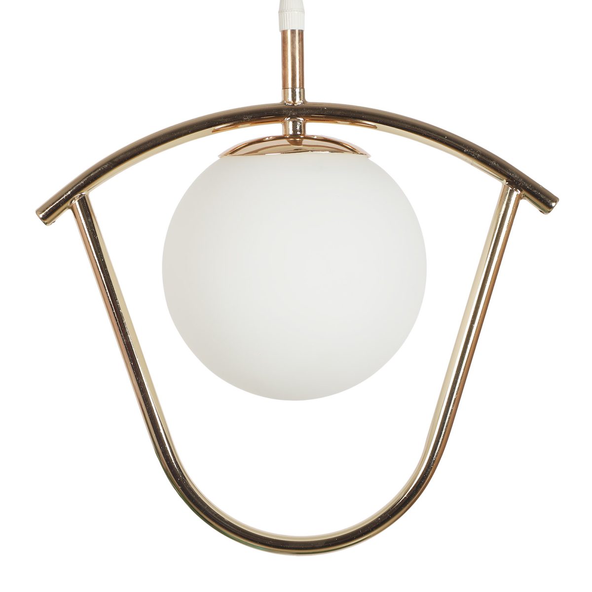 Golden finish single hanging light in white doom glass. The suspension can be adjusted at time of installation to the desired height. Can be customized as per requirement. Available in clusters of different numbers as per requirement. LAMP NOT INCLUDED.