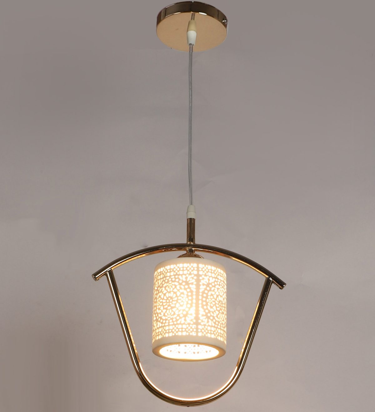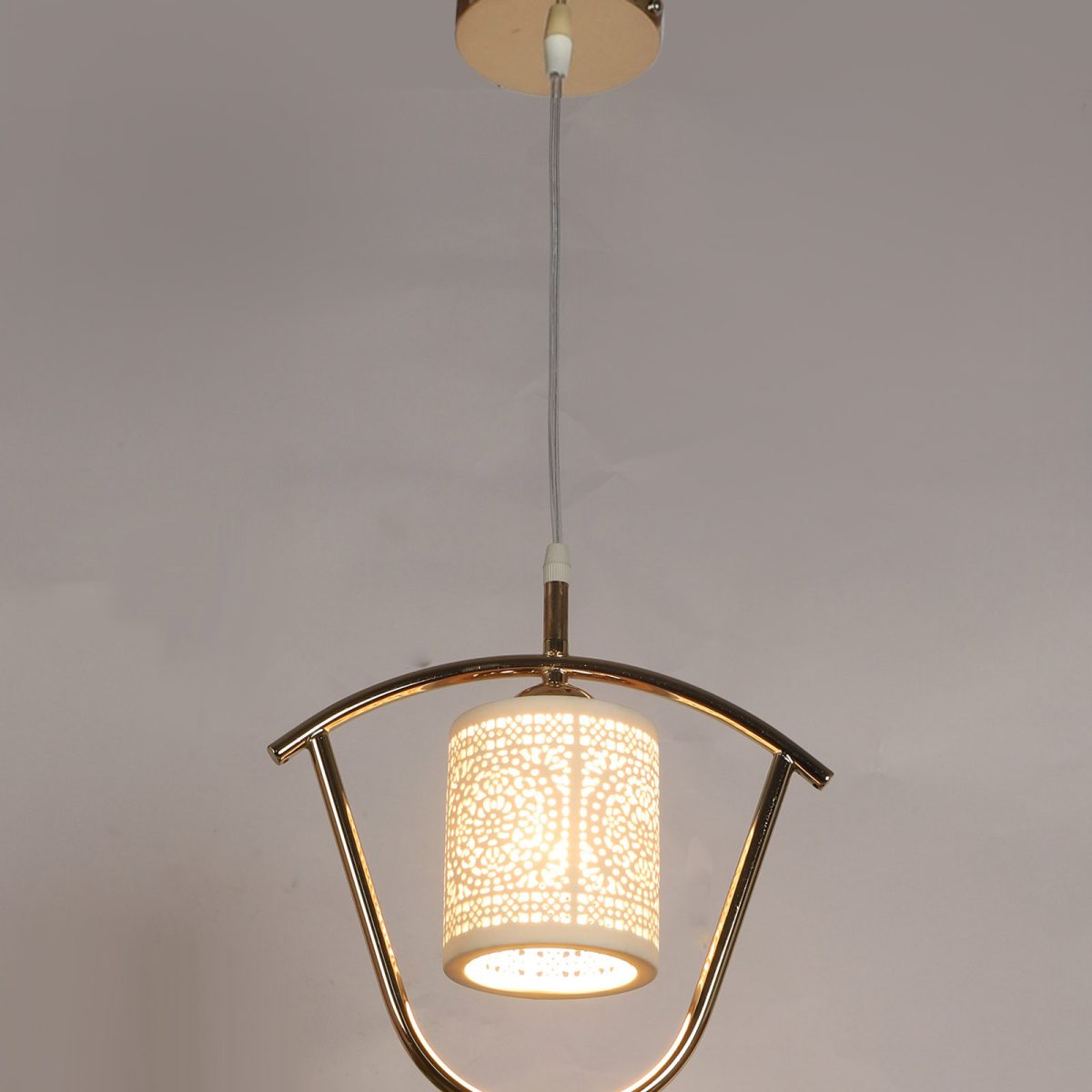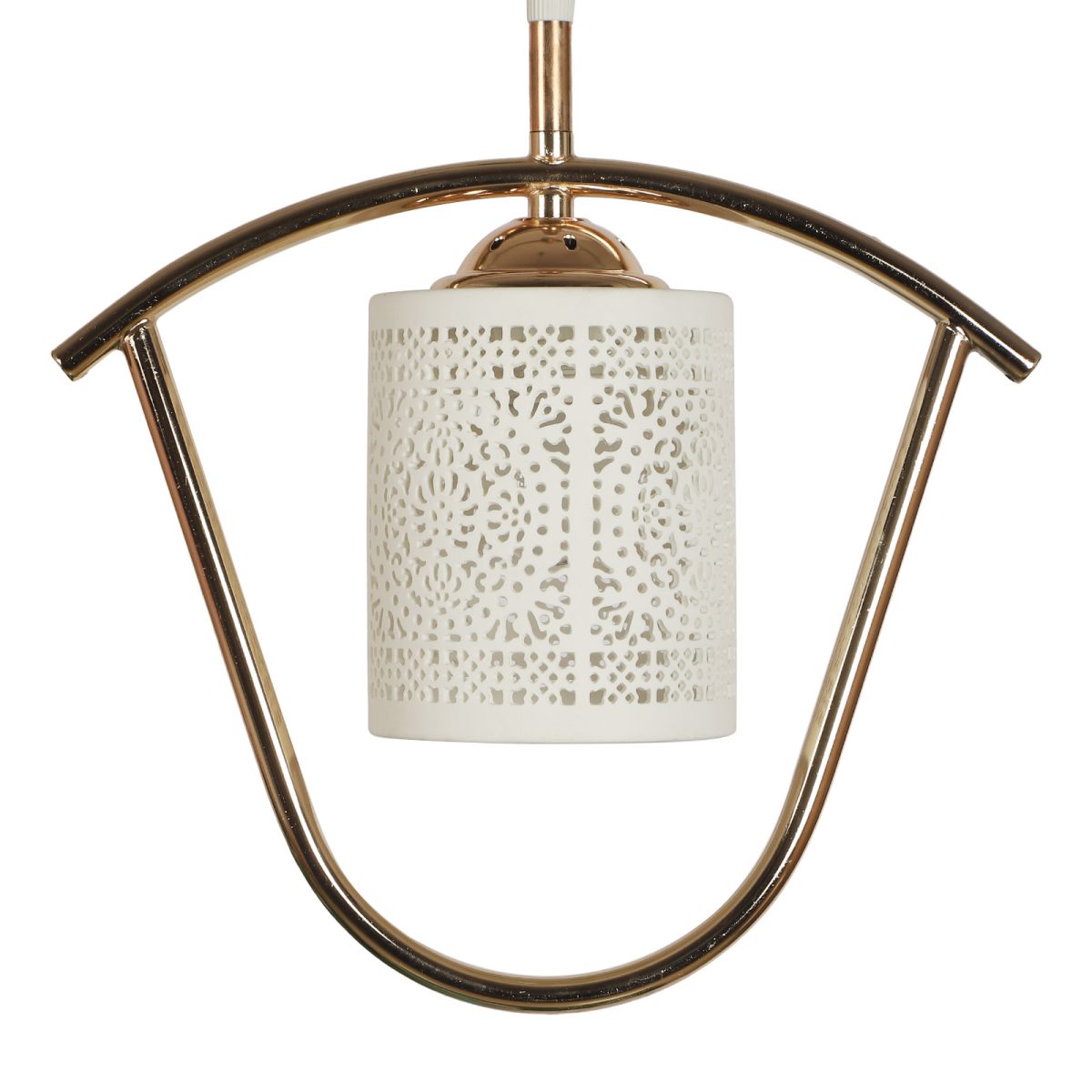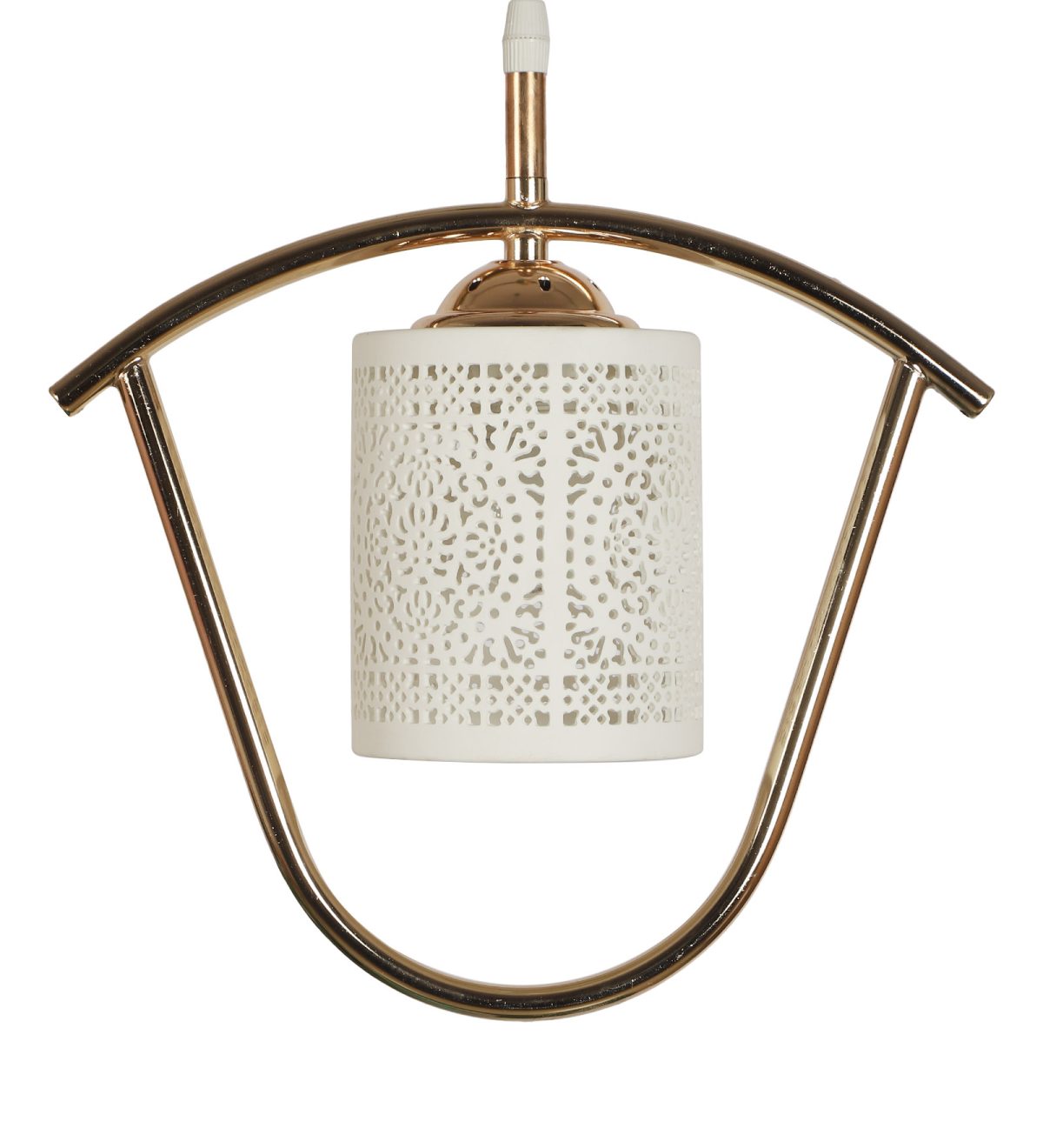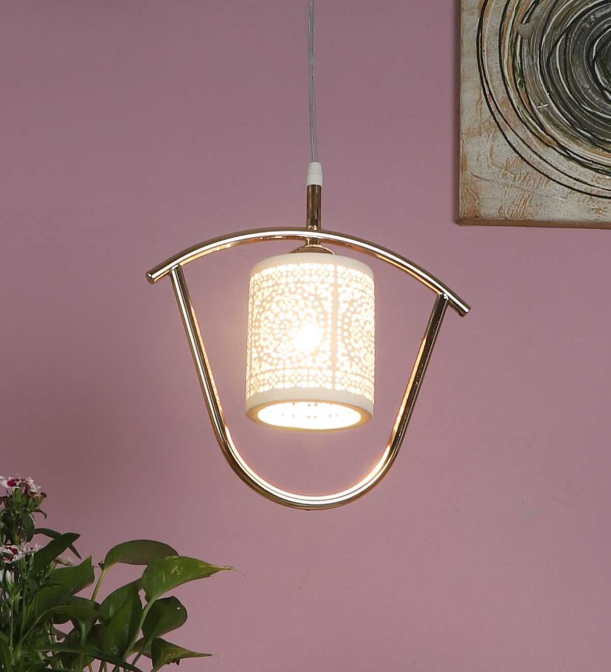 Golden finish single hanging light in white ceramic shade. The suspension can be adjusted at time of installation to the desired height. Can be customized as per requirement. Available in clusters of different numbers as per requirement. LAMP NOT INCLUDED.