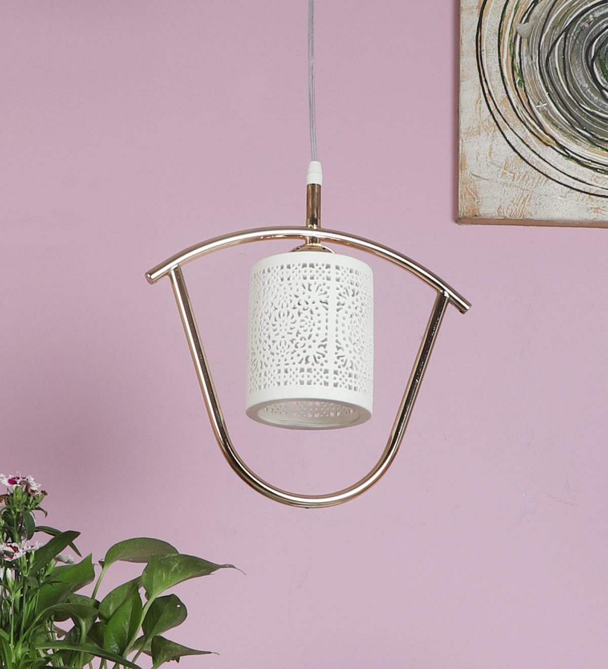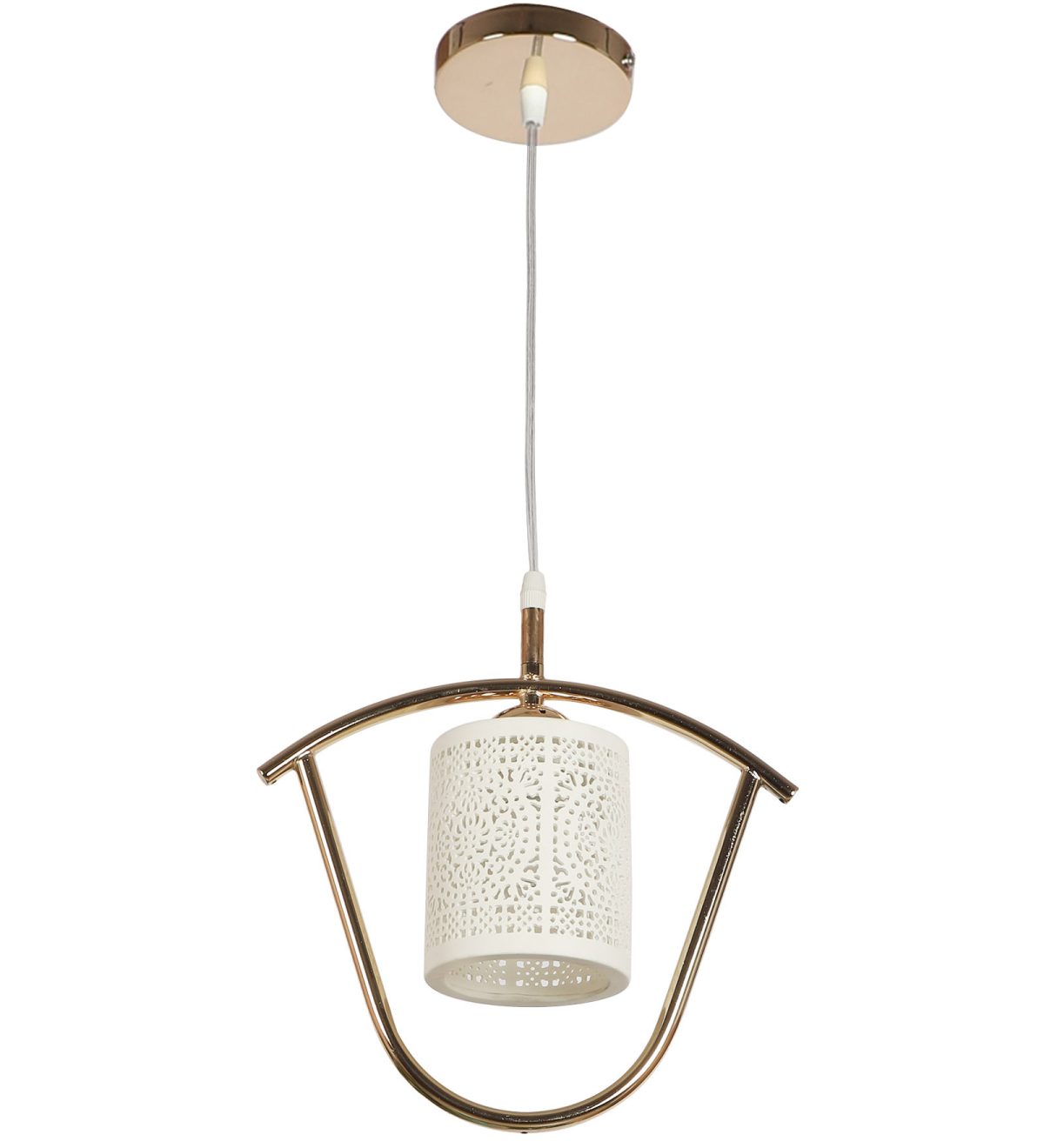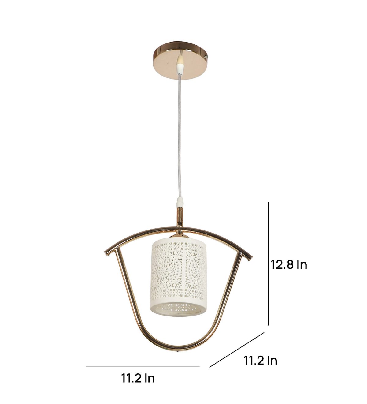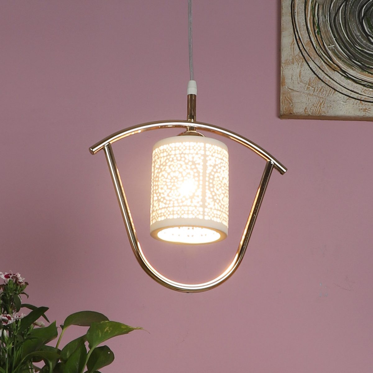 Golden finish single hanging light in white ceramic shade. The suspension can be adjusted at time of installation to the desired height. Can be customized as per requirement. Available in clusters of different numbers as per requirement. LAMP NOT INCLUDED.