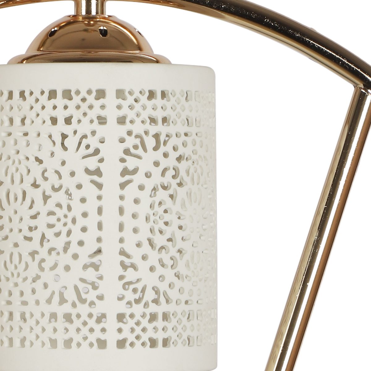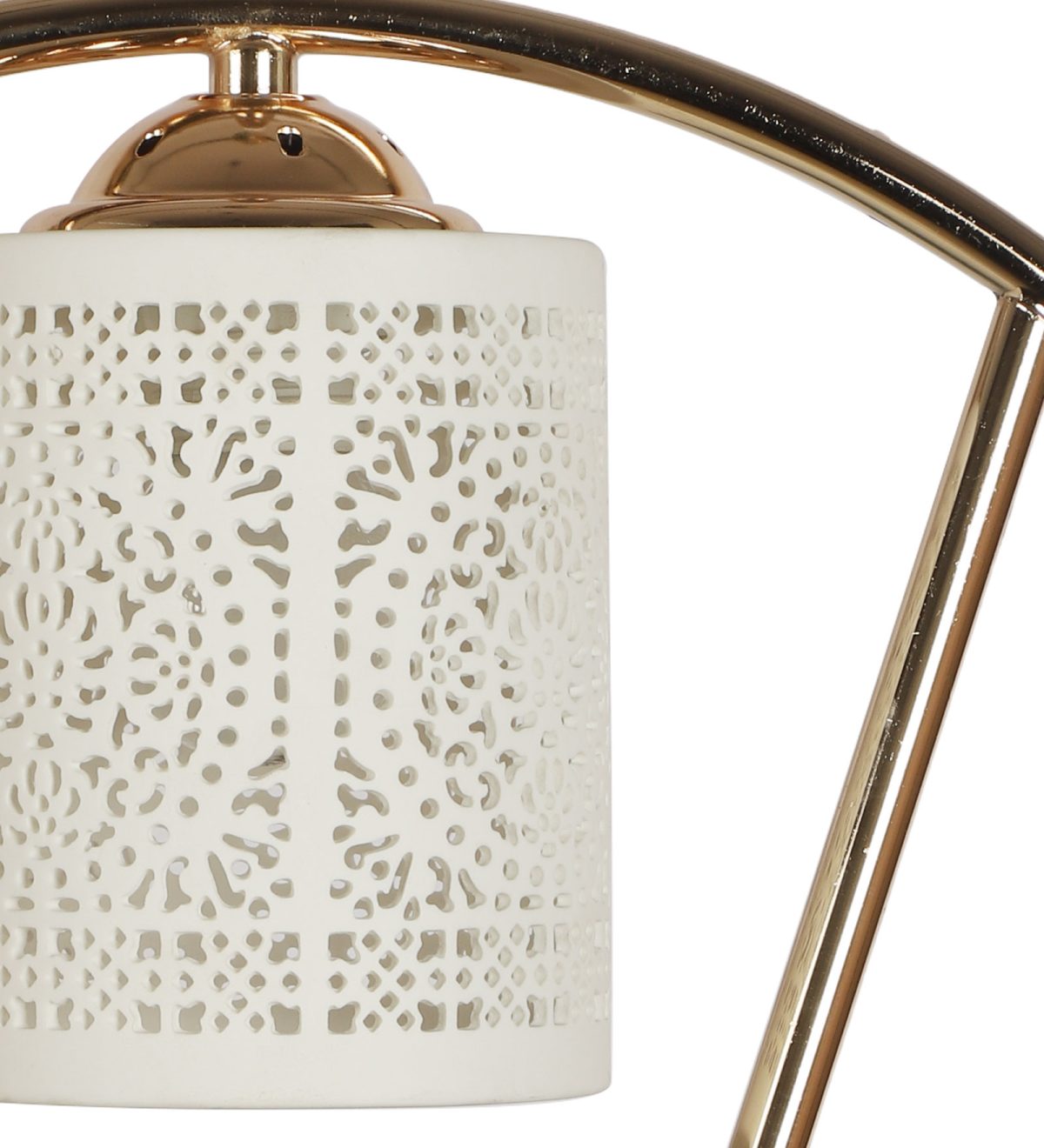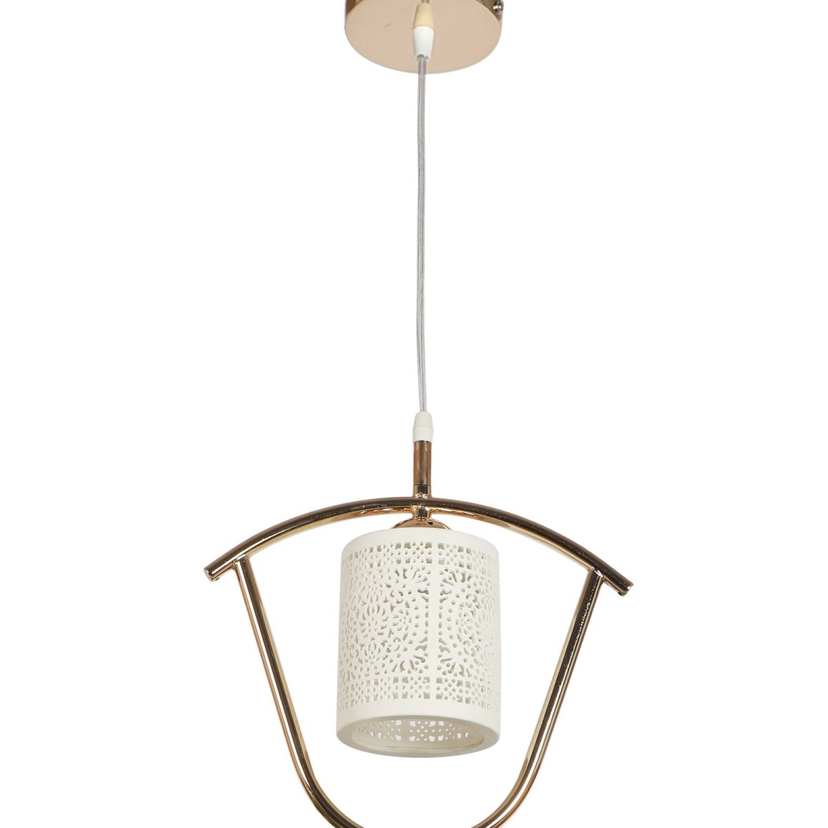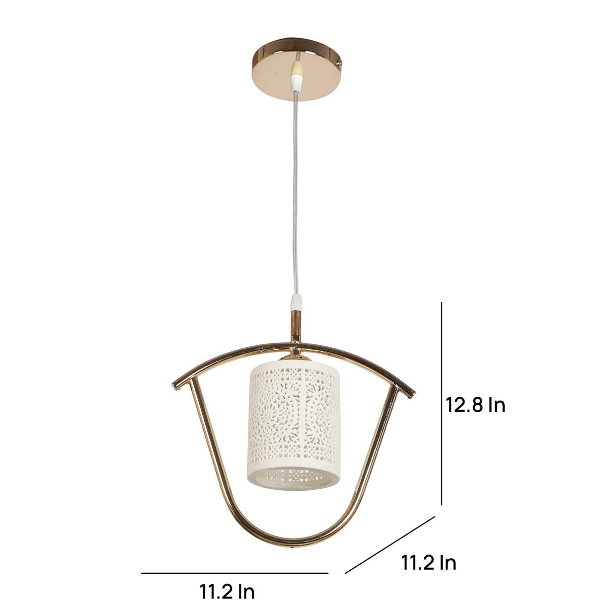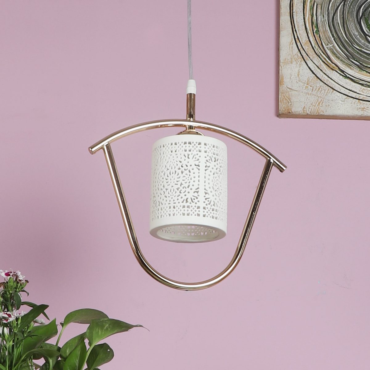 Golden finish single hanging light in white ceramic shade. The suspension can be adjusted at time of installation to the desired height. Can be customized as per requirement. Available in clusters of different numbers as per requirement. LAMP NOT INCLUDED.