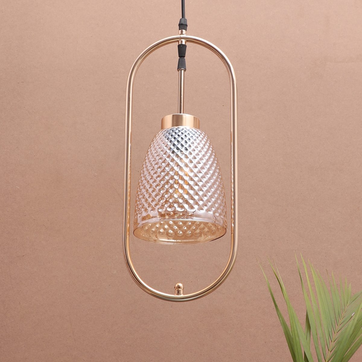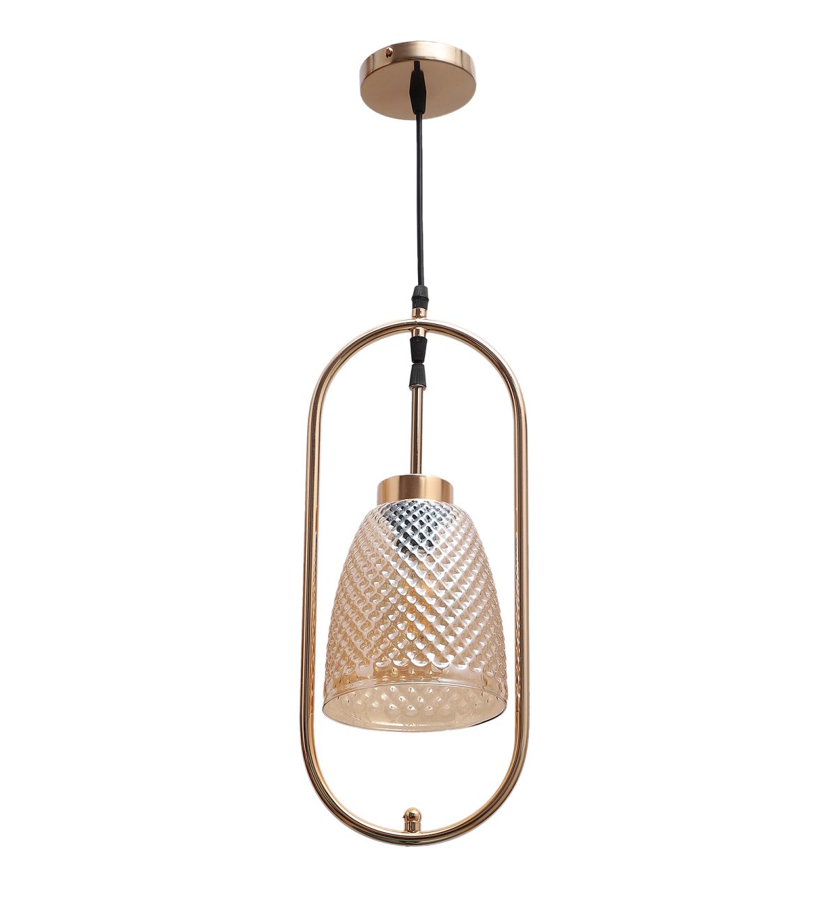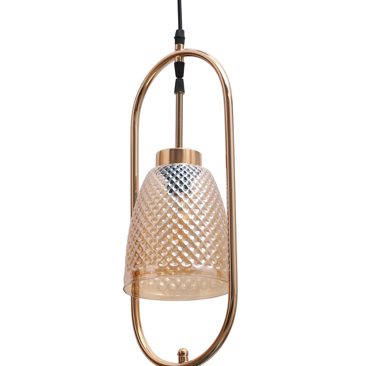 Gold modern, single hanging light in champaign glass. The suspension can be adjusted at time of installation to the desired height. It is maintenance free, comes with an E27 holder.Can be customized as per requirement. LAMP NOT INCLUDED.