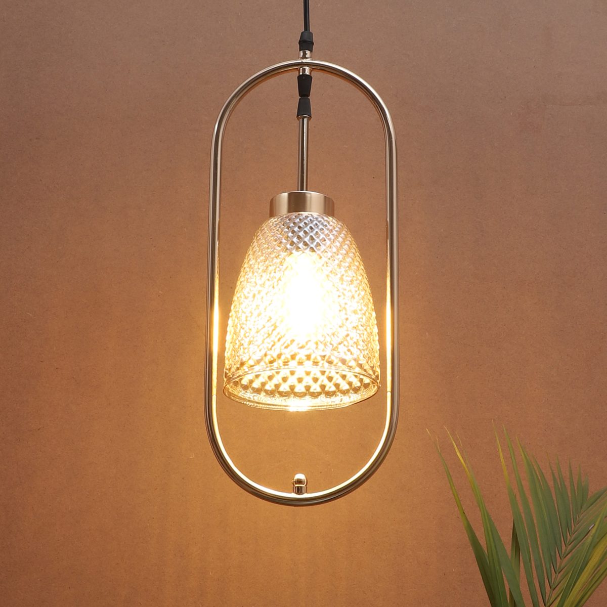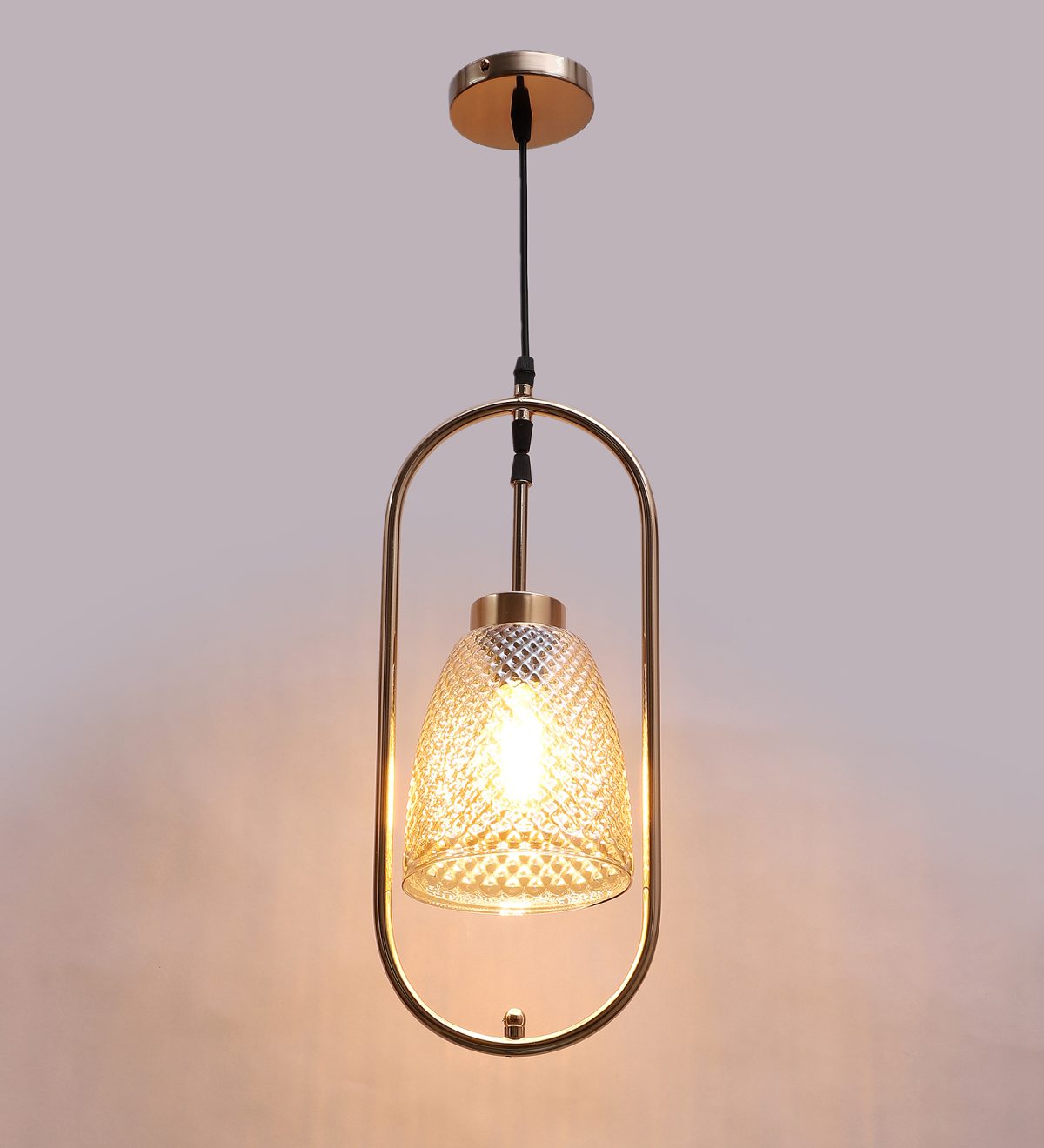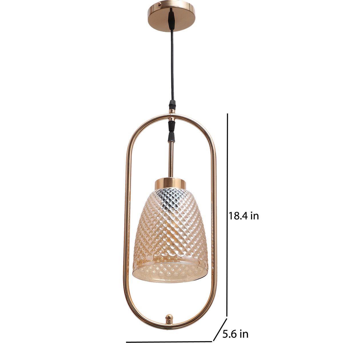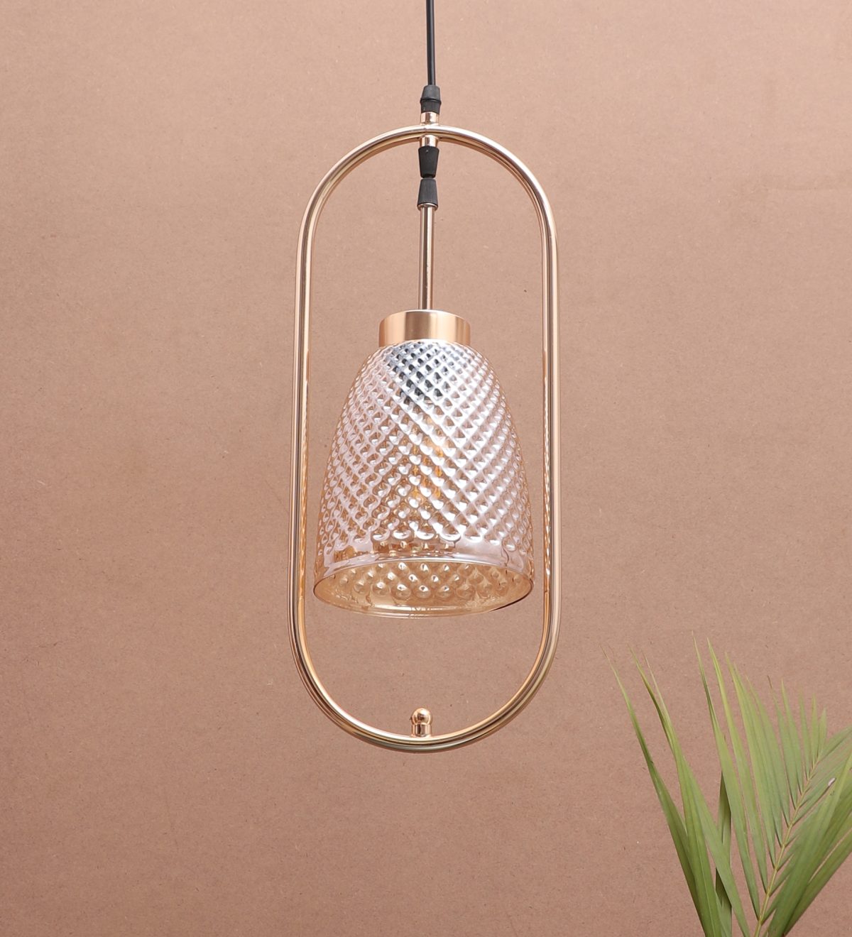 Gold modern, single hanging light in champaign glass. The suspension can be adjusted at time of installation to the desired height. It is maintenance free, comes with an E27 holder.Can be customized as per requirement. LAMP NOT INCLUDED.