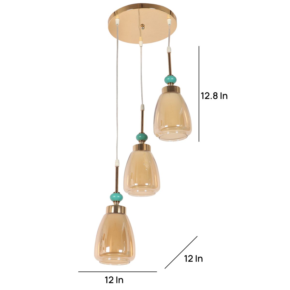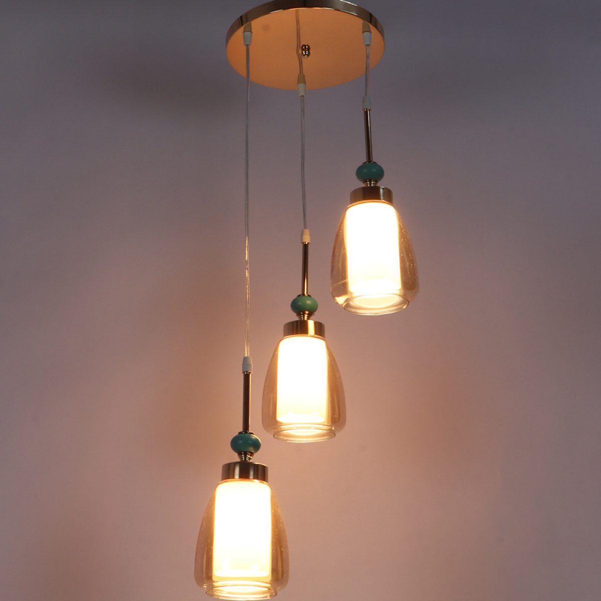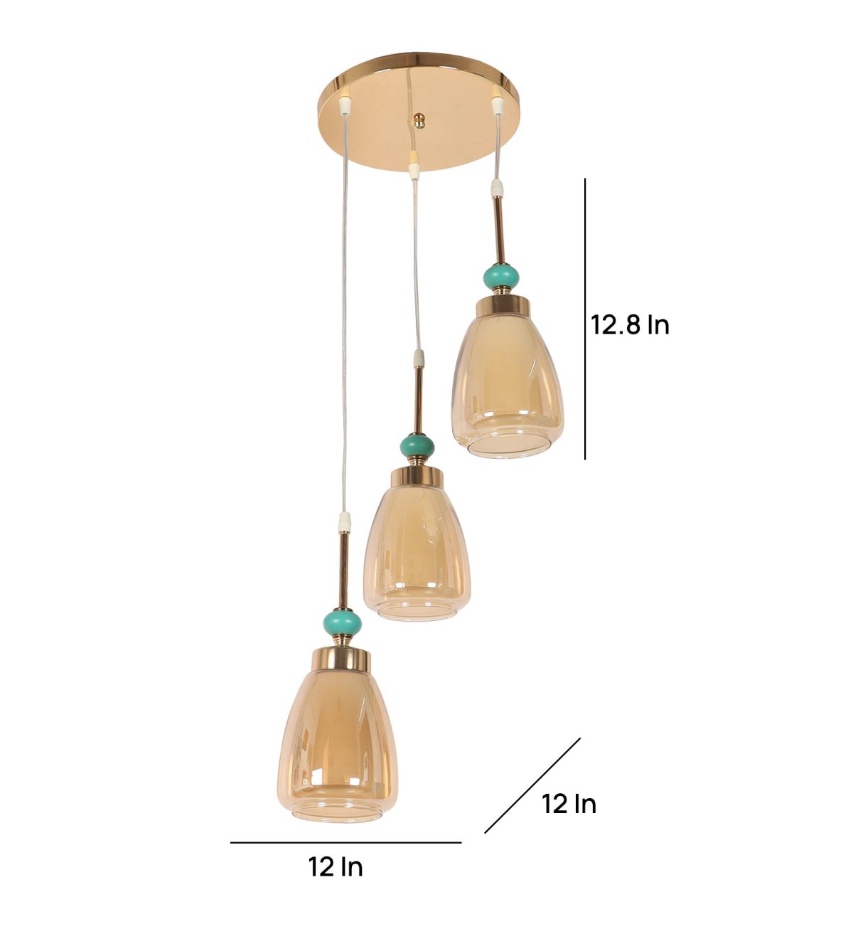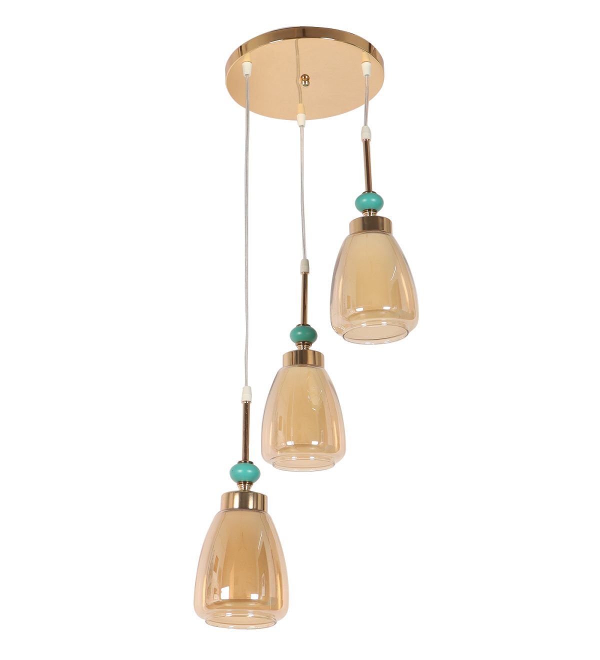 Gold finish tripple hanging light. Can be customised as per requirement in terms height and finish. Also availble in clusters of variable quantity. LAMPS NOT INCLUDED.