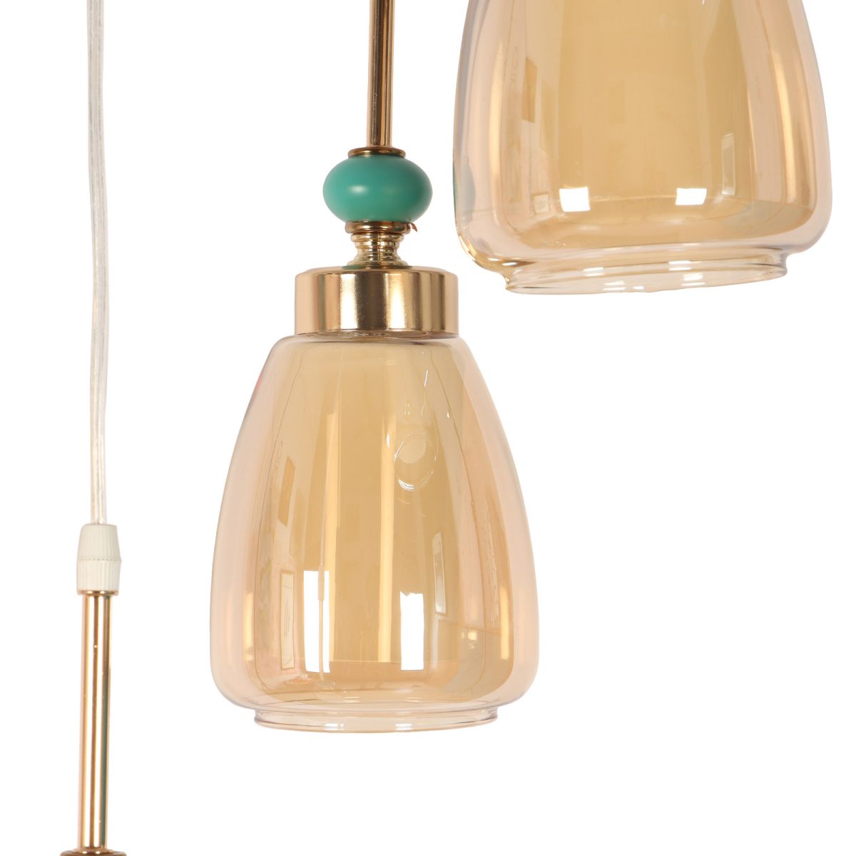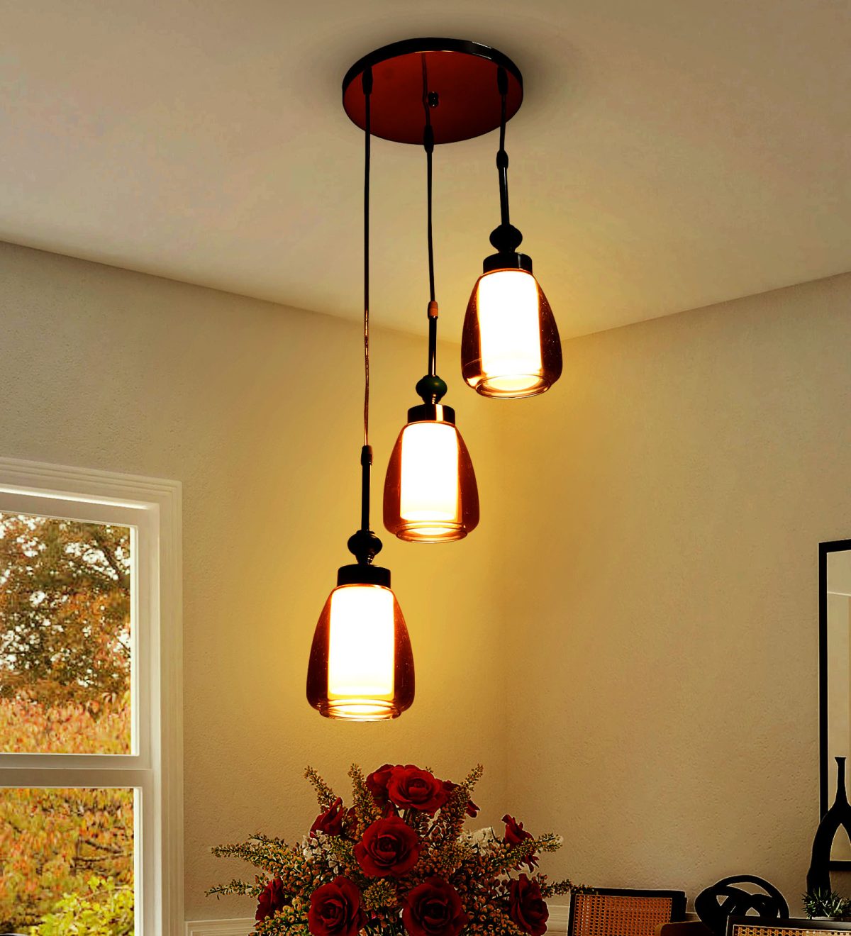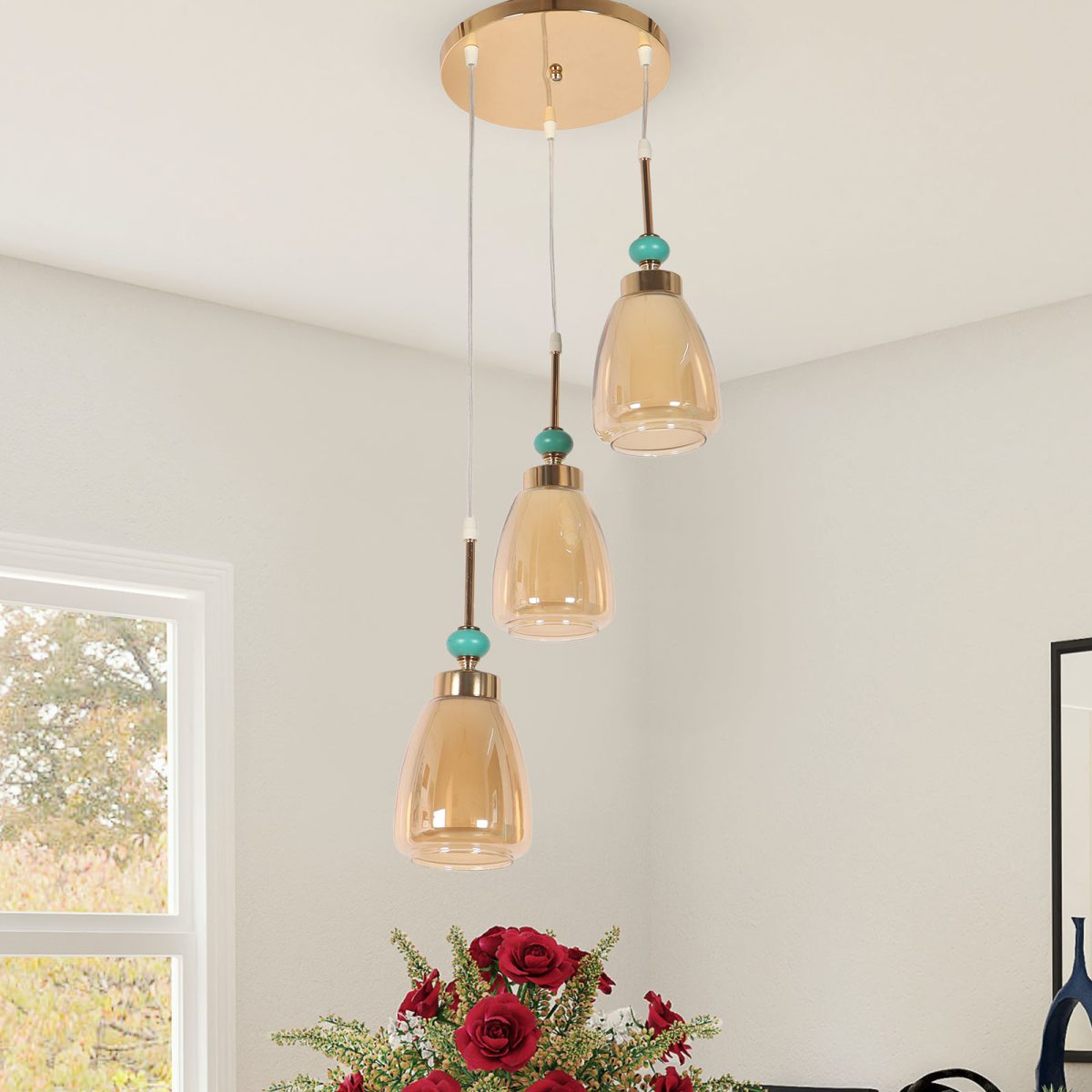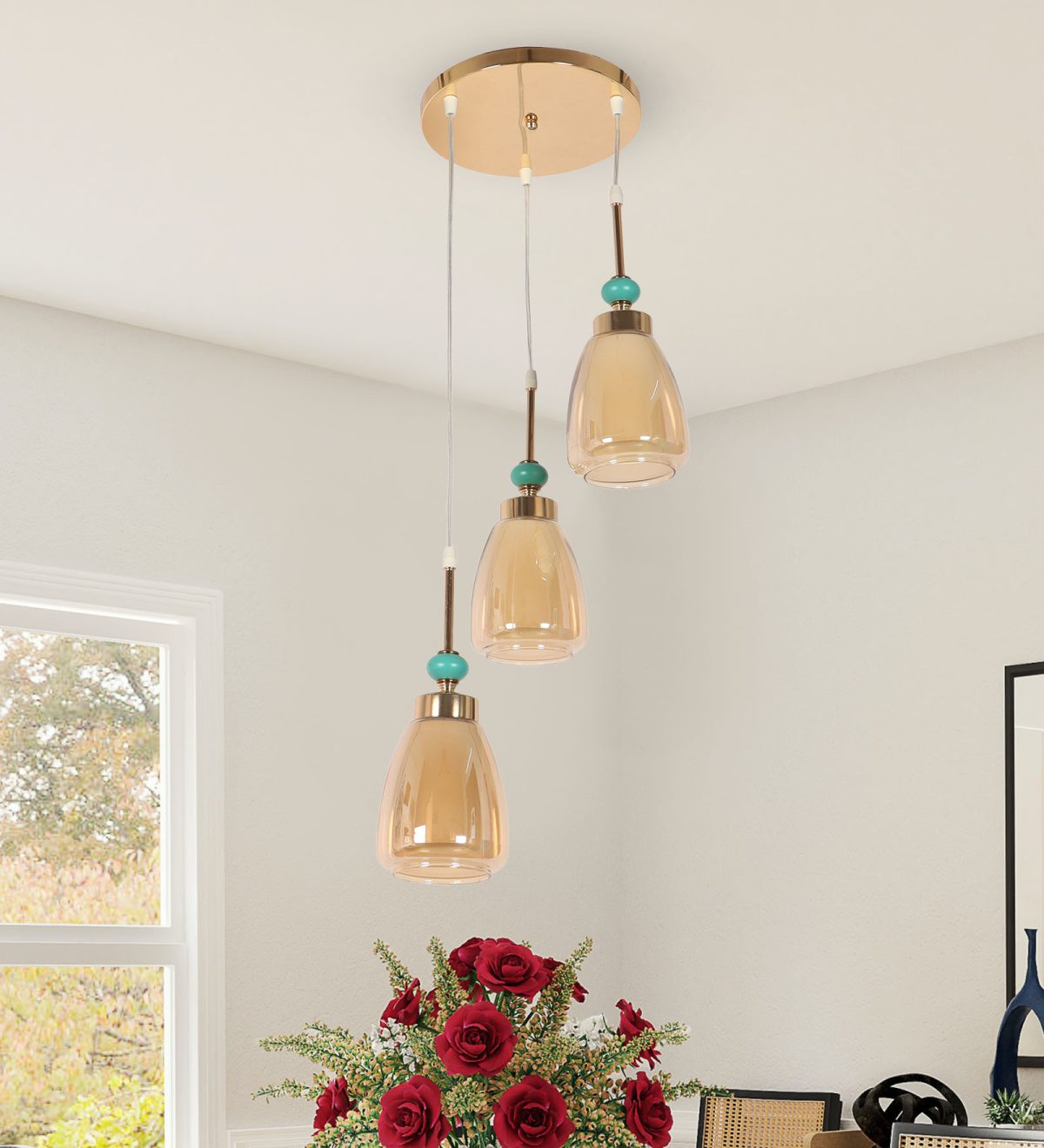 Gold finish tripple hanging light. Can be customised as per requirement in terms height and finish. Also availble in clusters of variable quantity. LAMPS NOT INCLUDED.