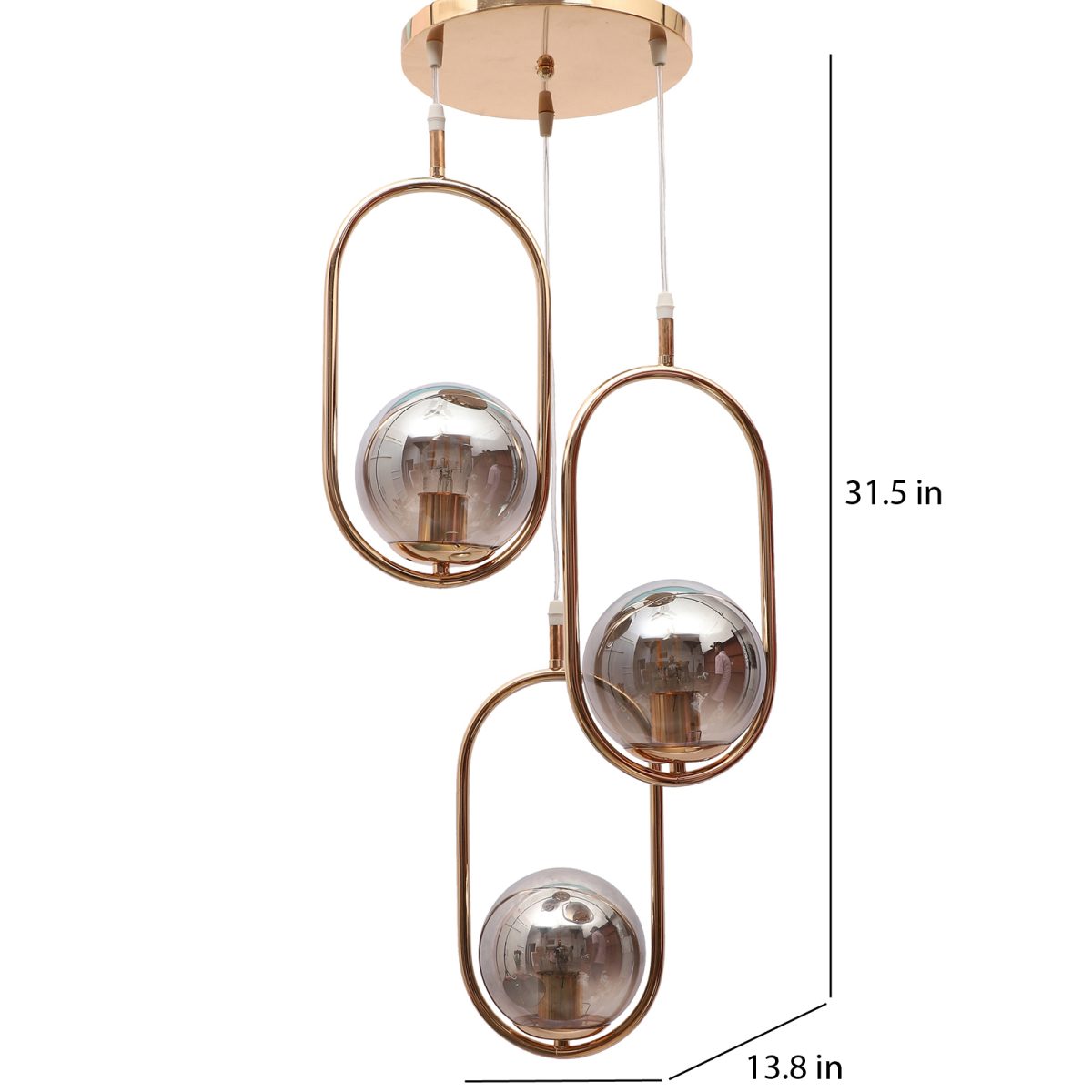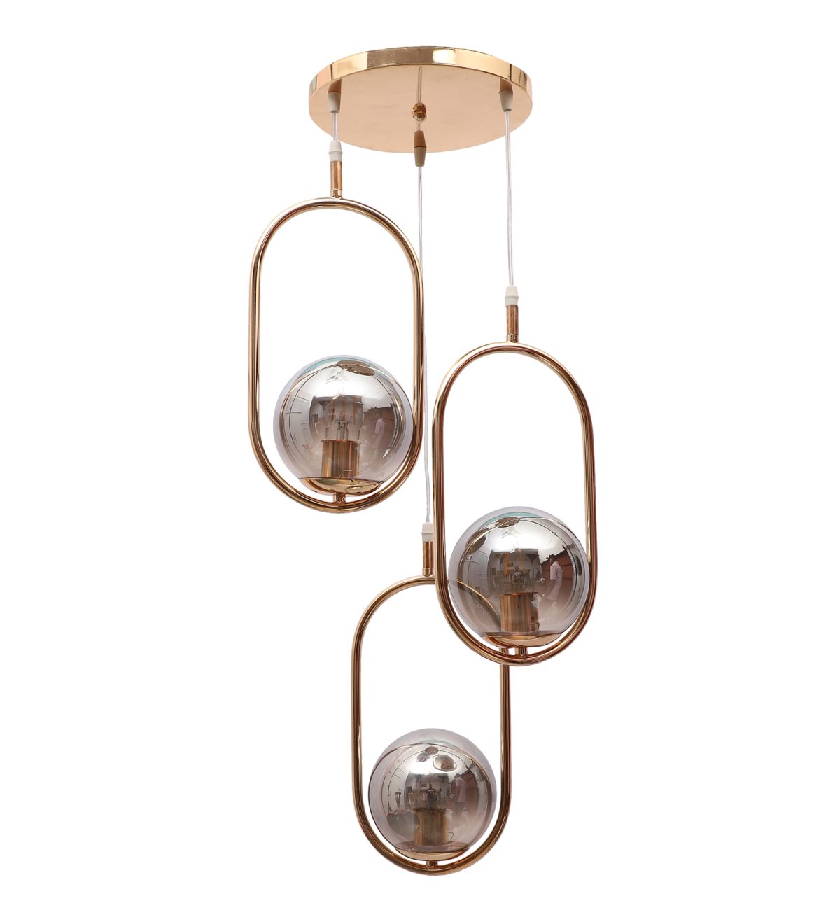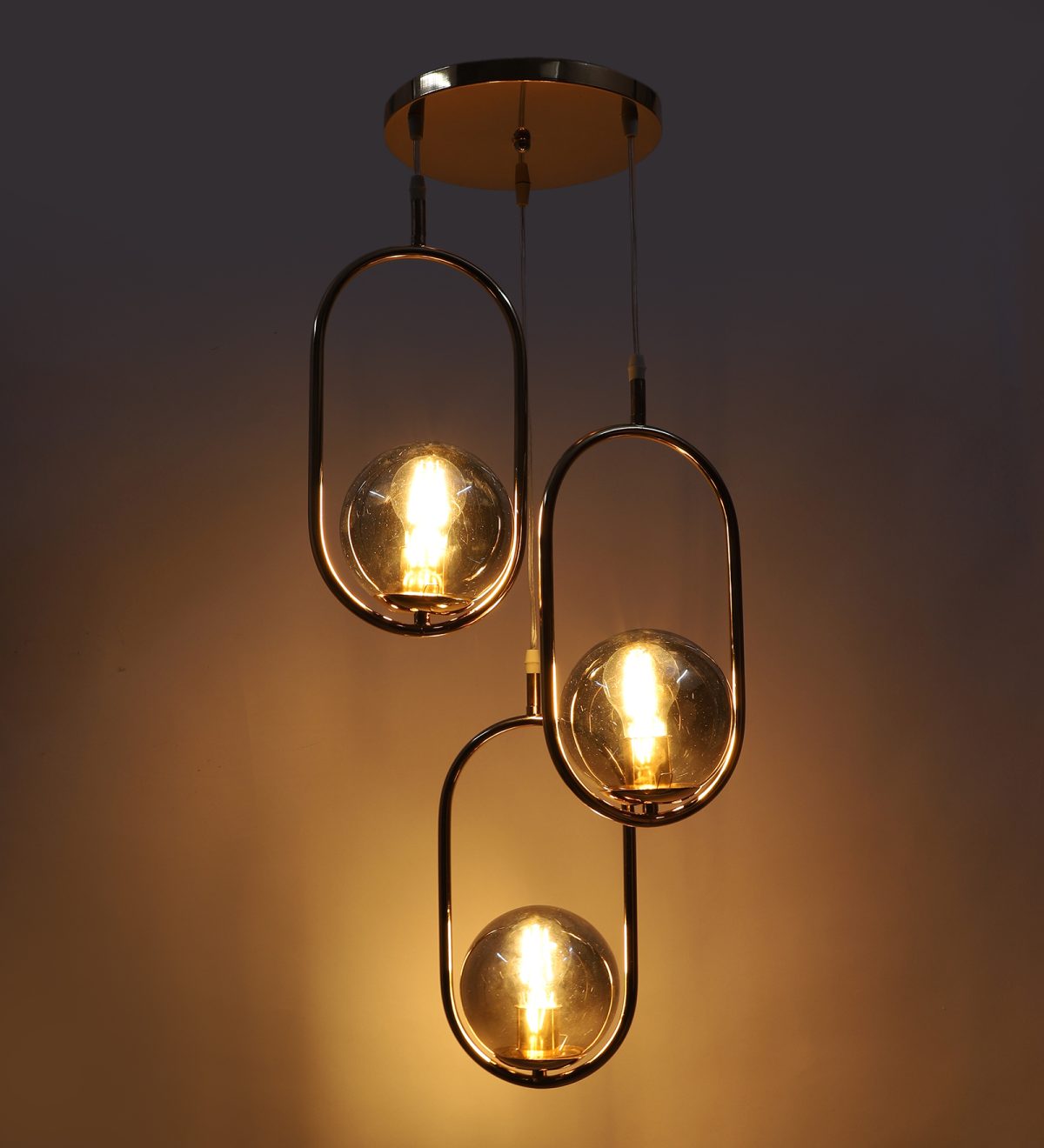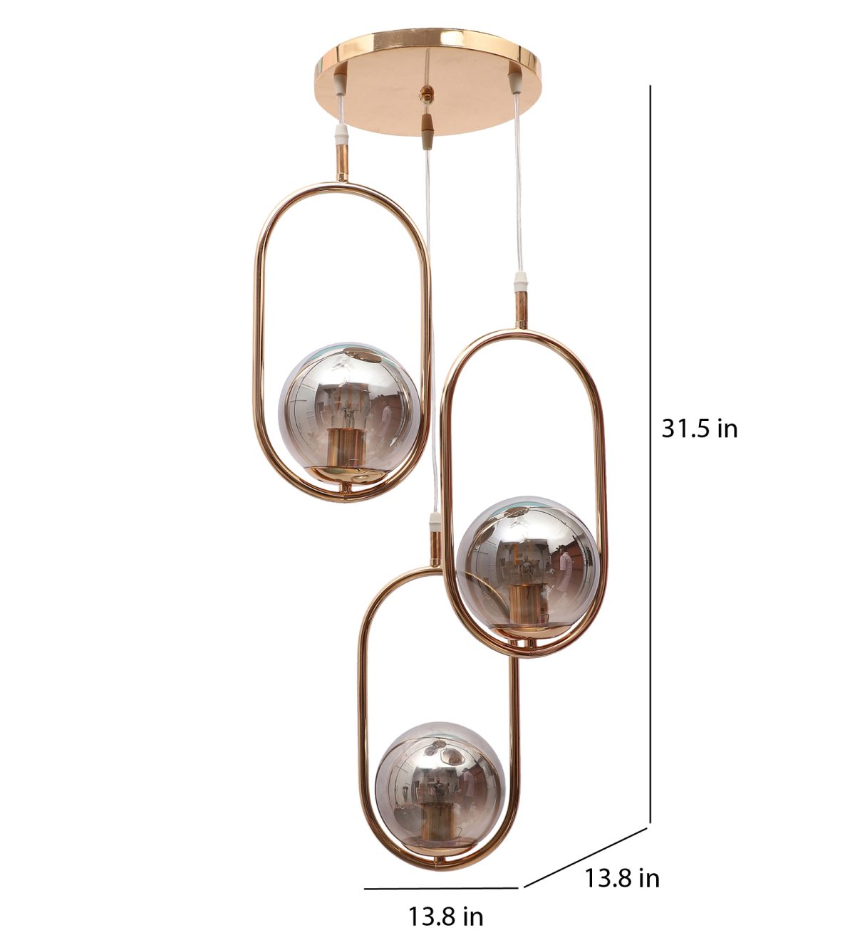 Gold modern mild steel triple hanging light in smoky doom glass. The suspension can be adjusted at time of installation to the desired height. It is maintenance free, comes with an E27 holder, only the change of lamp is required, which is available locally everywhere. Application includes both residential and commercial premises wherever it matches with your interiors. Can be customized as per requirement. Lamp not included.