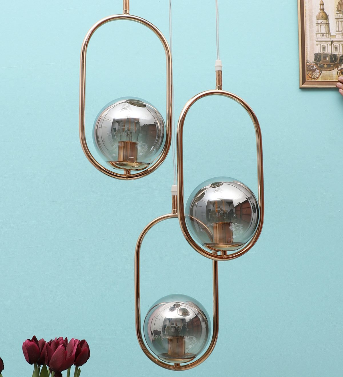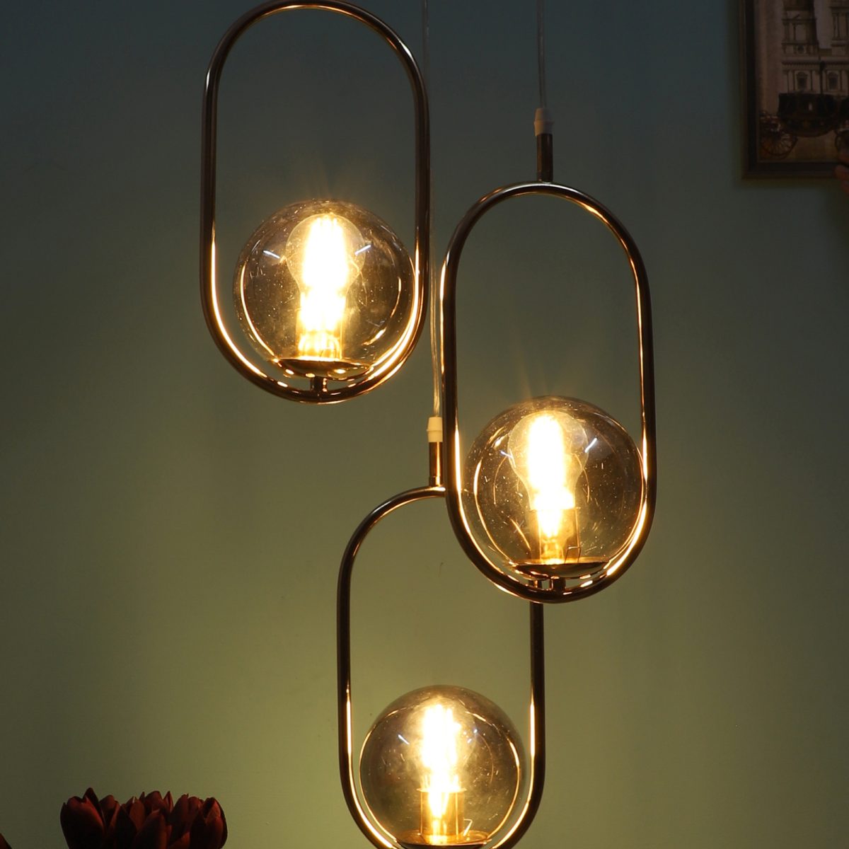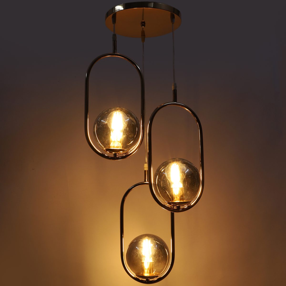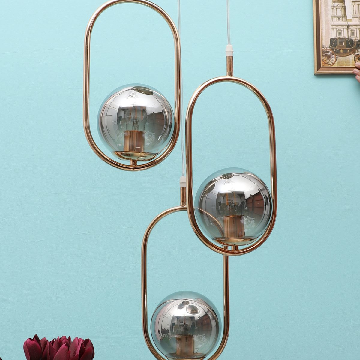 Gold modern mild steel triple hanging light in smoky doom glass. The suspension can be adjusted at time of installation to the desired height. It is maintenance free, comes with an E27 holder, only the change of lamp is required, which is available locally everywhere. Application includes both residential and commercial premises wherever it matches with your interiors. Can be customized as per requirement. Lamp not included.