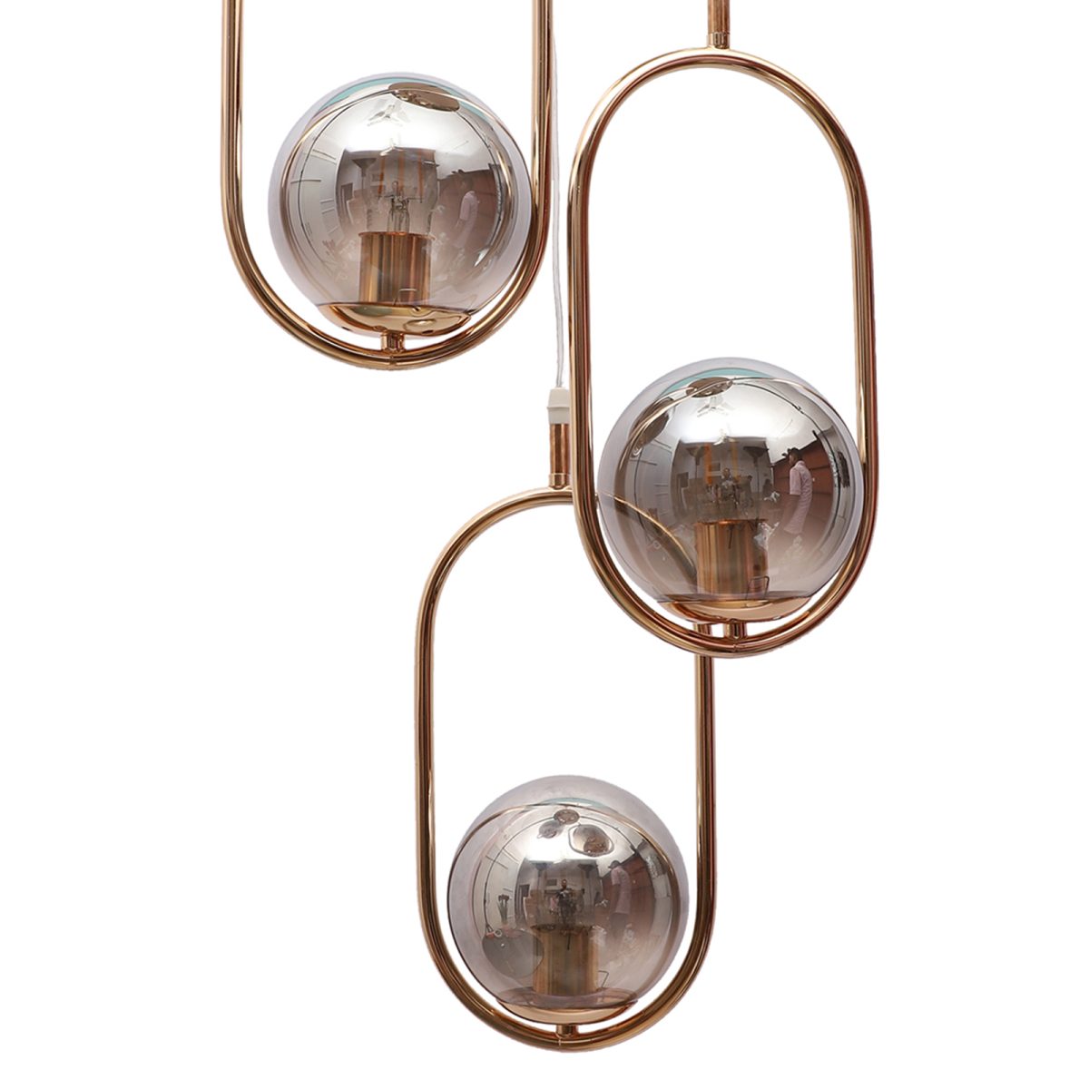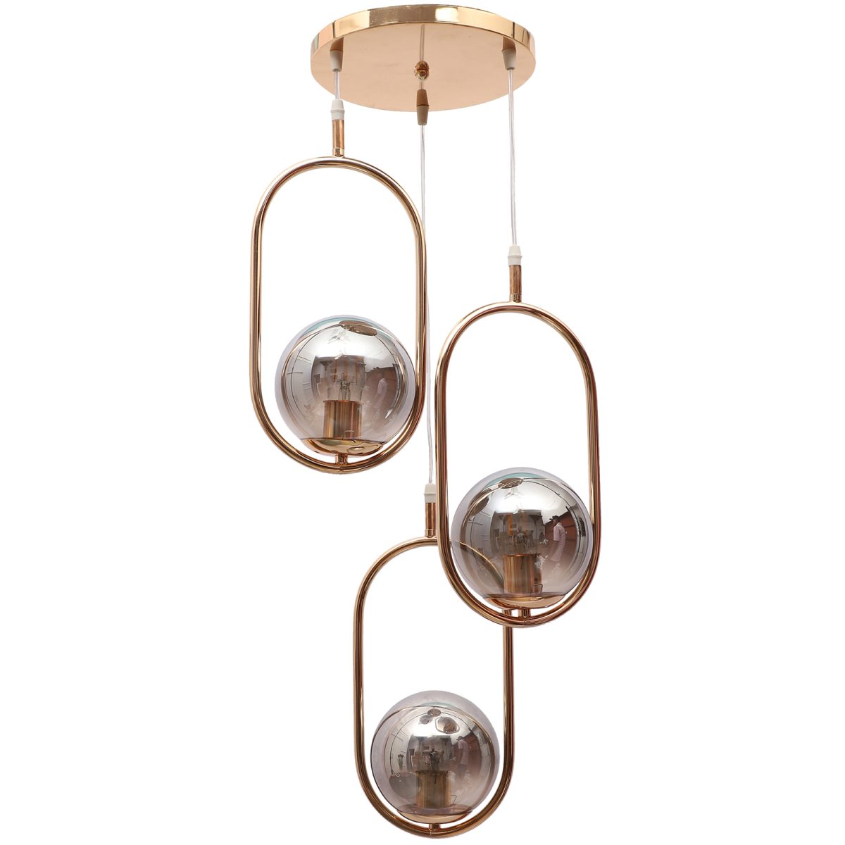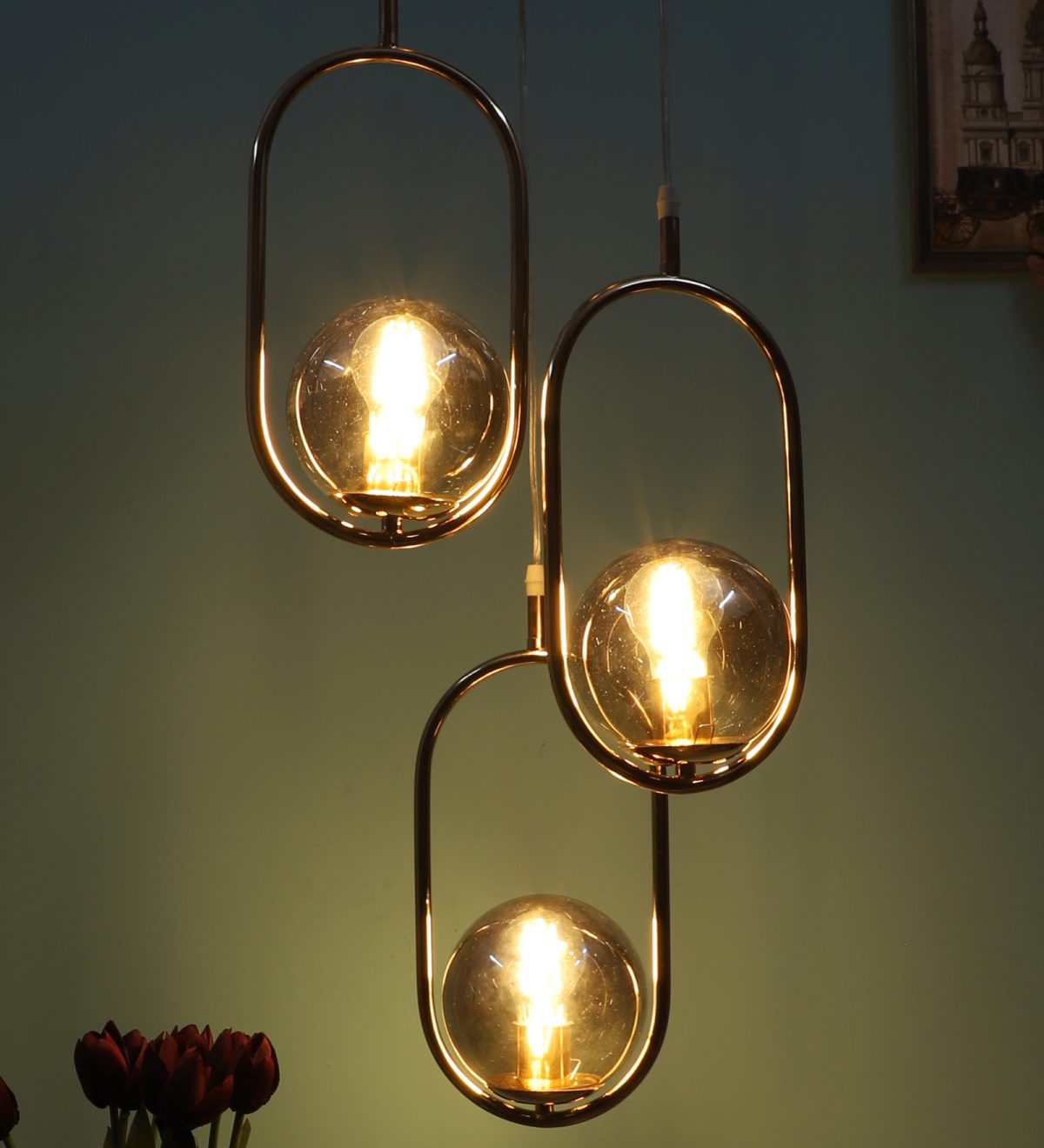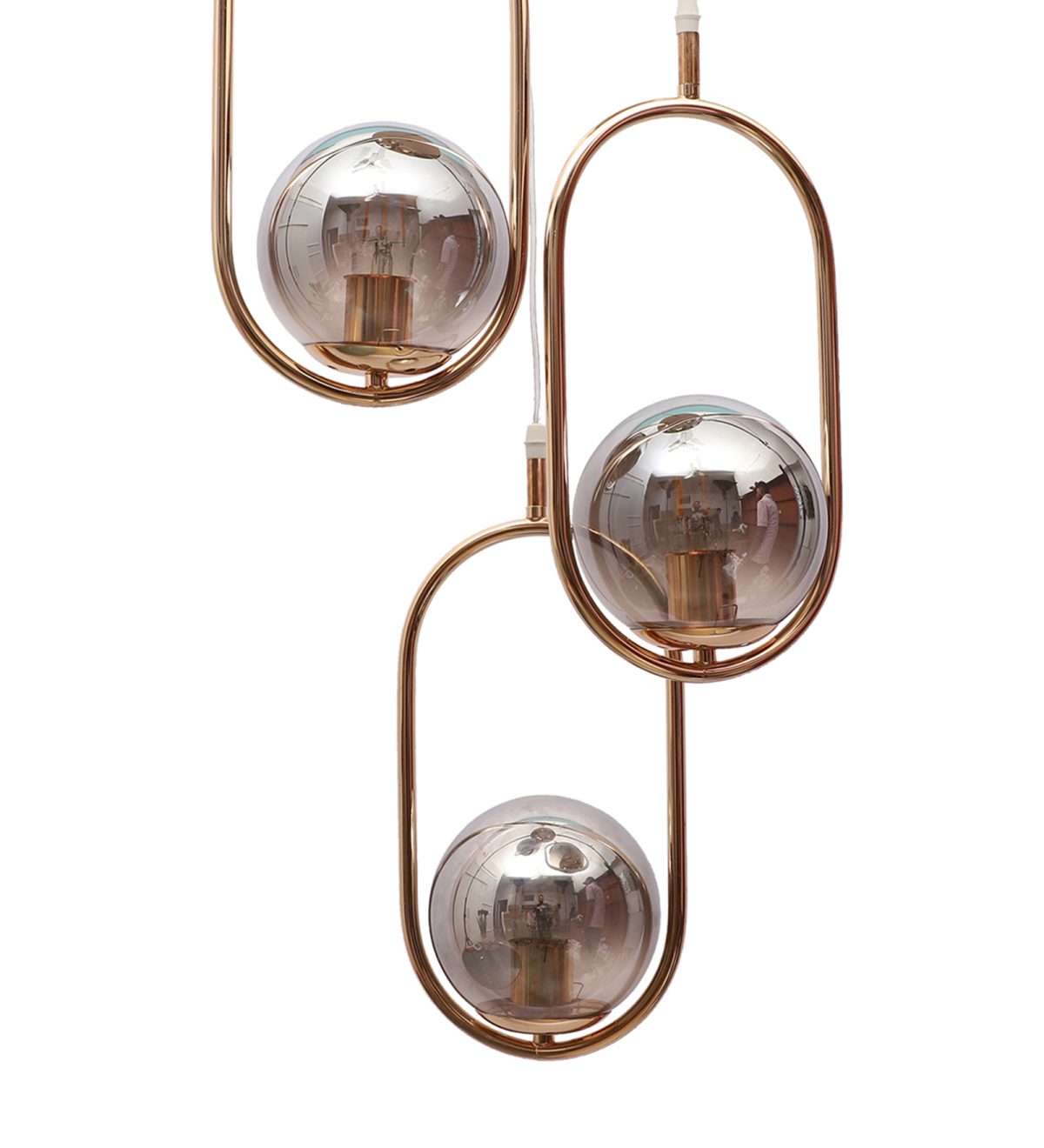 Gold modern mild steel triple hanging light in smoky doom glass. The suspension can be adjusted at time of installation to the desired height. It is maintenance free, comes with an E27 holder, only the change of lamp is required, which is available locally everywhere. Application includes both residential and commercial premises wherever it matches with your interiors. Can be customized as per requirement. Lamp not included.