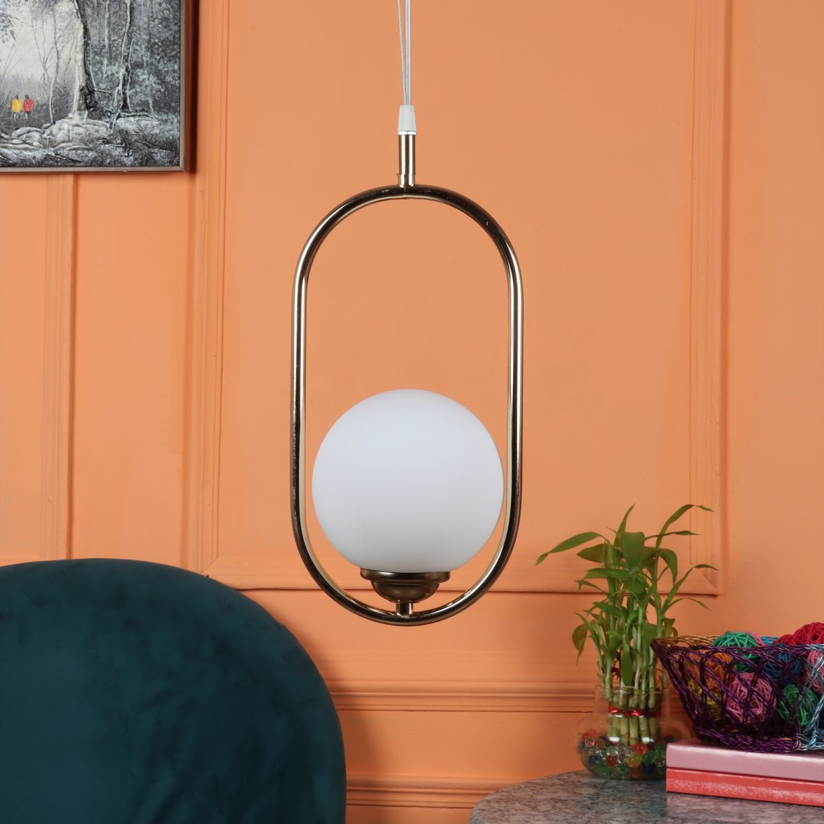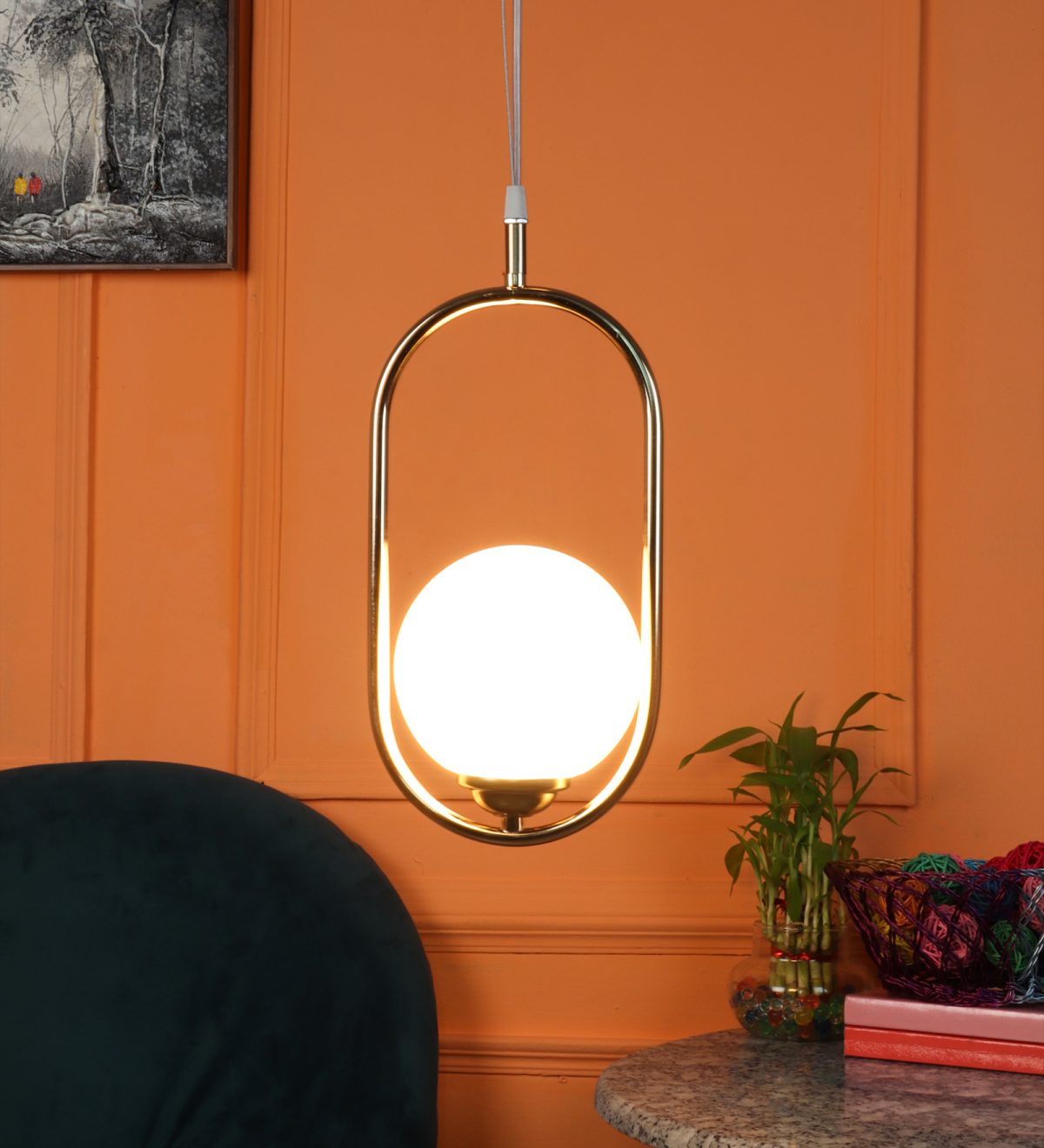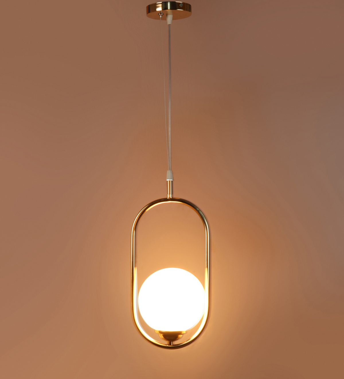 Gold modern, mild steel single hanging light in white doom glass. The suspension can be adjusted at time of installation to the desired height. It is maintenance free, comes with an E27 holder, only the change of lamp is required, which is available locally everywhere. Matching three light hanging code – HL6076-3. Application includes both residential and commercial premises wherever it matches with your interiors. Can be customized as per requirement in case of bulk quantities. LAMP NOT INCLUDED.