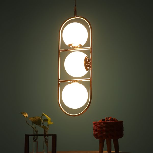 Gold modern, mild steel single hanging light in white doom glass. The suspension can be adjusted at time of installation to the desired height. It is maintenance free, comes with an E27 holder, only the change of lamp is required, which is available locally everywhere. Matching three light hanging code – HL6076-3. Application includes both residential and commercial premises wherever it matches with your interiors. Can be customized as per requirement in case of bulk quantities. LAMP NOT INCLUDED.