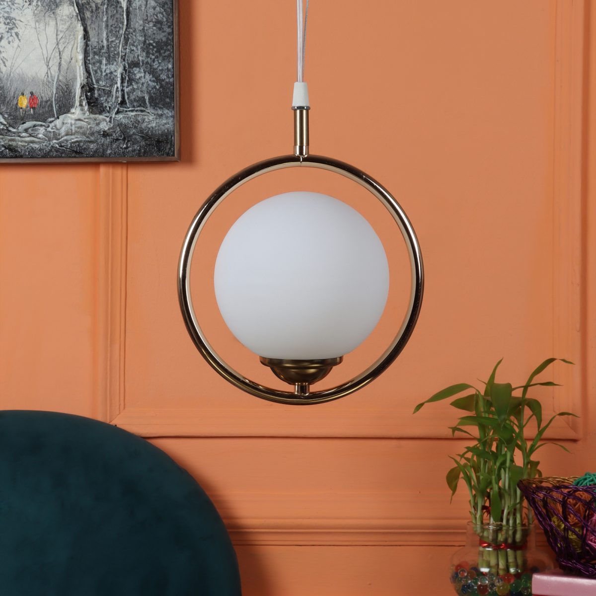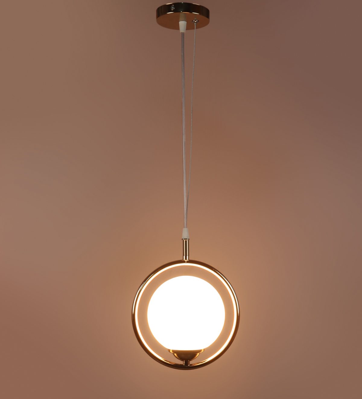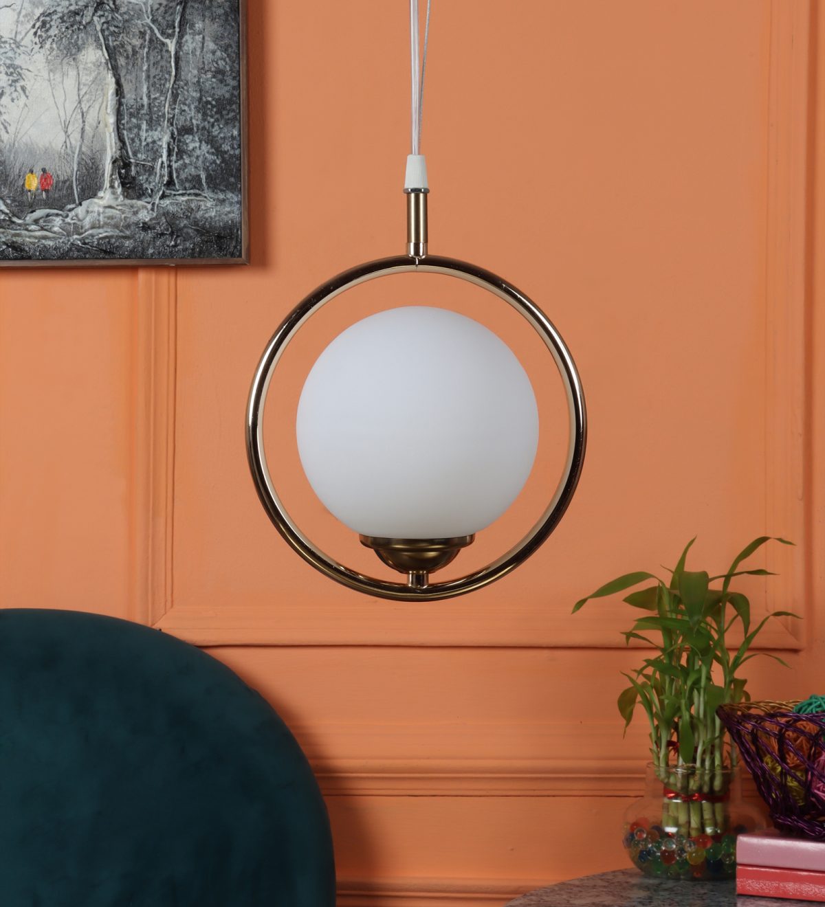 Gold modern, mild steel single hanging light in white doom glass. The suspension can be adjusted at time of installation to the desired height. It is maintenance free, comes with an E27 holder, only the change of lamp is required, which is available locally everywhere. Matching three light hanging code – HL6077-3. Application includes both residential and commercial premises wherever it matches with your interiors. Can be customized as per requirement in case of bulk quantities. LAMP NOT INCLUDED.