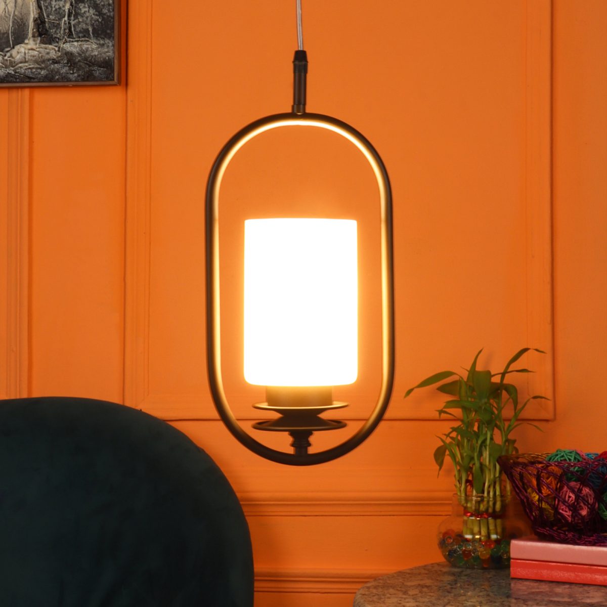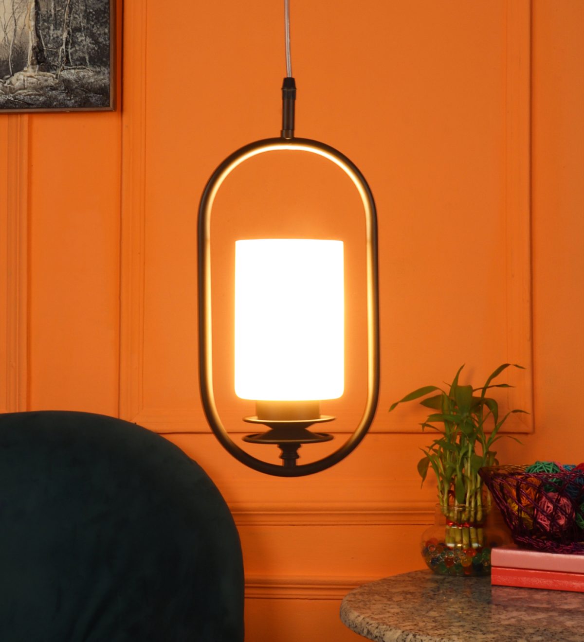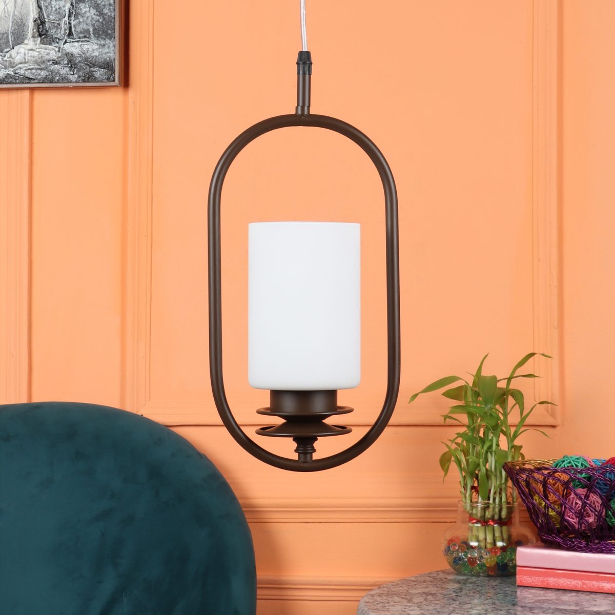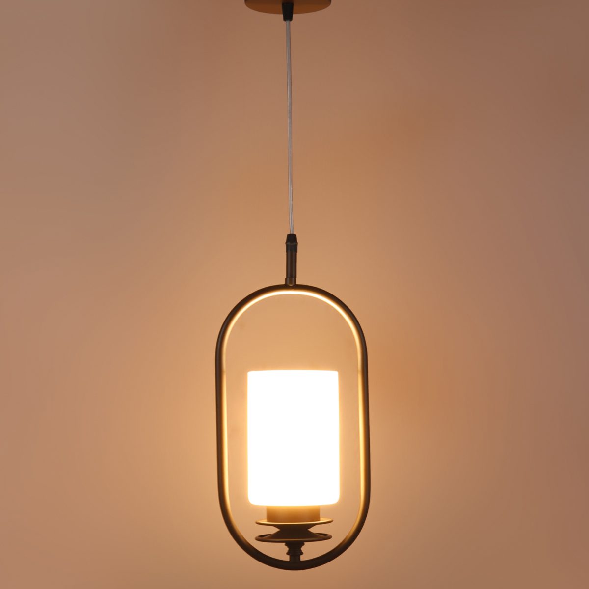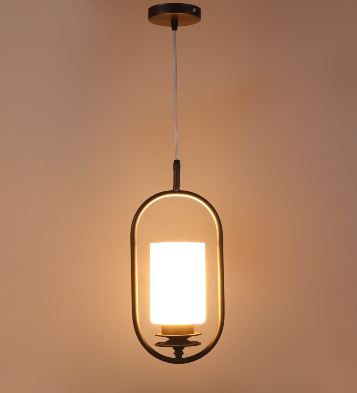 Dark brown (wood) finish, cylinderical white glass single hanging light, made of mild steel and glass. The suspension can be adjusted at time of installation to the desired height. It is maintenance free, easy to remove glass and wash it, comes with an E27 holder, only the change of lamp is required, which is available locally everywhere. Application includes both residential and commercial premises wherever it matches with your interiors. Other variants with different glass are HL6078, HL6080. Can be customized as per requirement in case of bulk quantities. LAMP NOT INCLUDED.