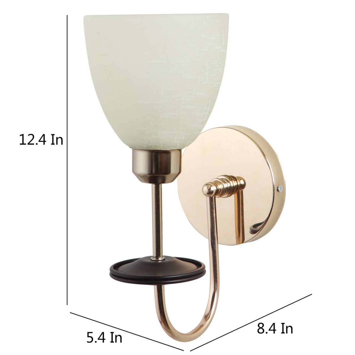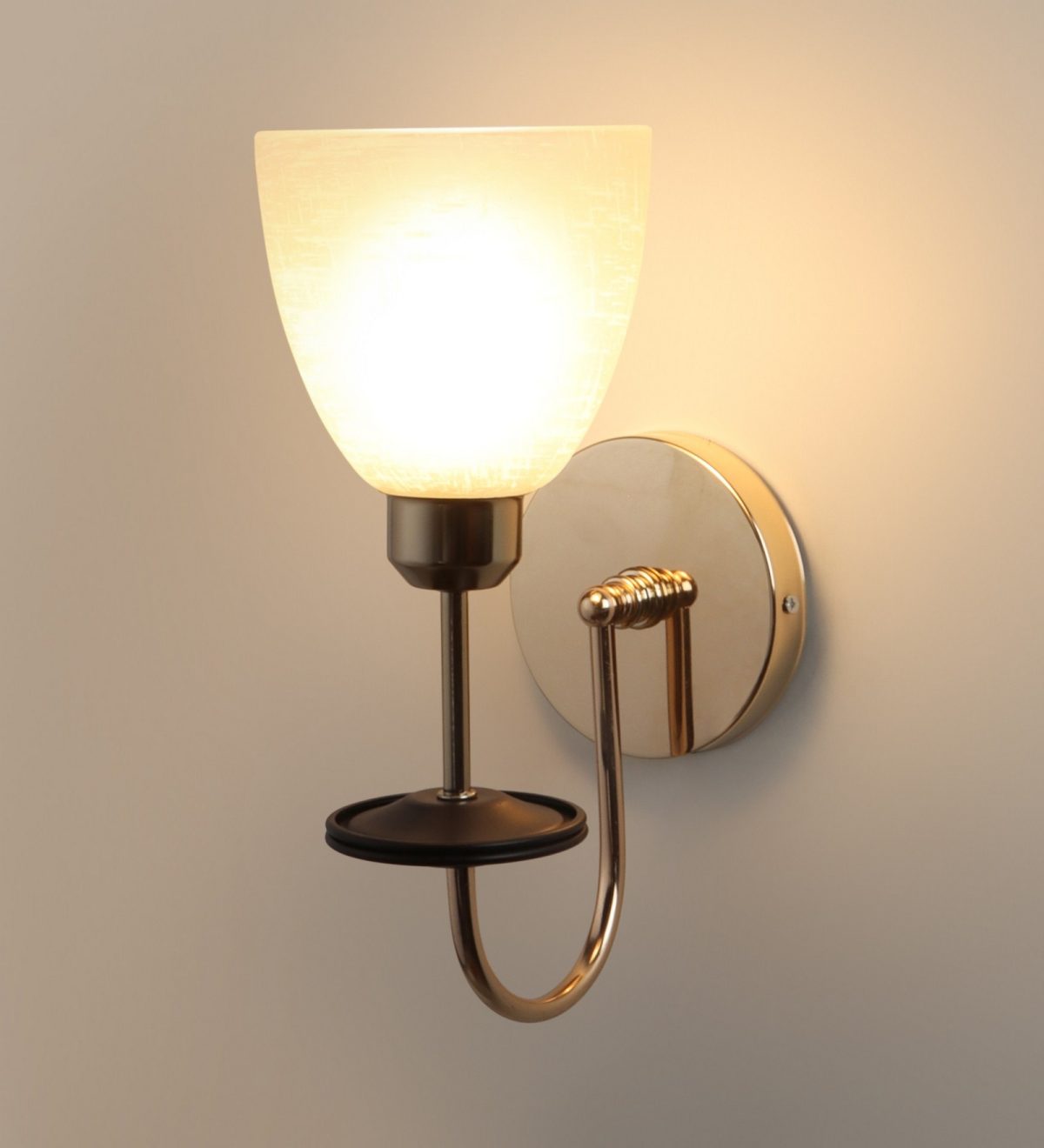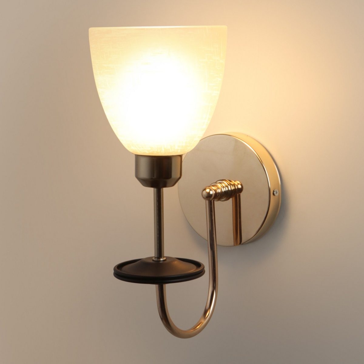 Gold modern, mild steel single wall light in white textured glass. It is maintenance free, comes with an E27 holder, only the change of lamp is required, which is available locally everywhere. Matching double wall light code – WL2714. Application includes both residential and commercial premises wherever it matches with your interiors. Can be customized as per requirement in case of bulk quantities. LAMP NOT INCLUDED.