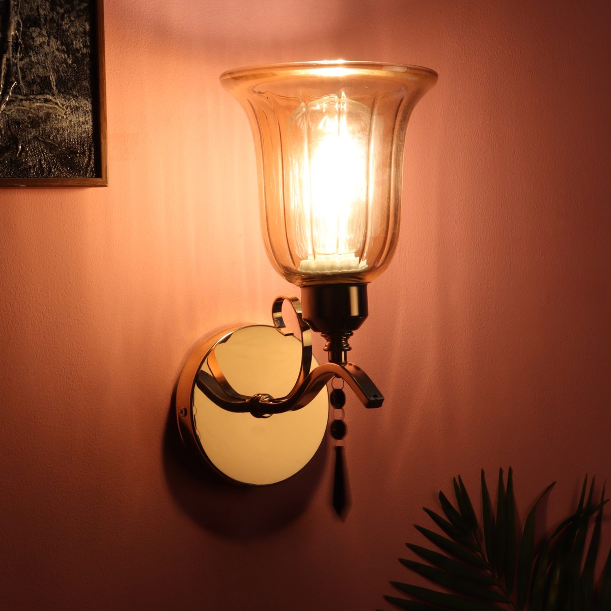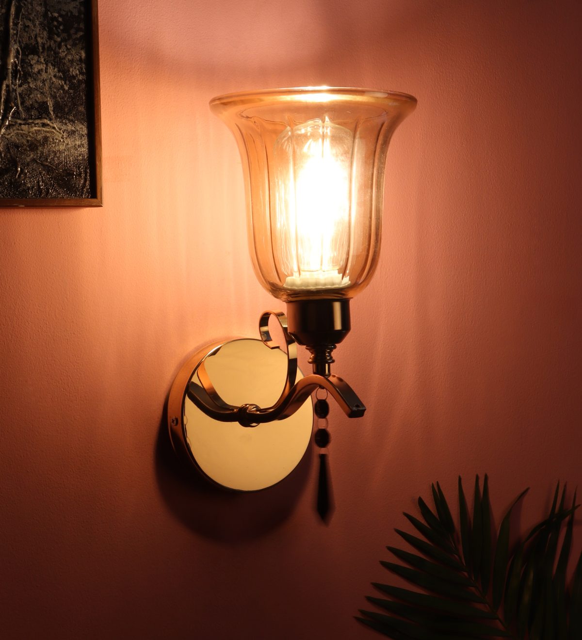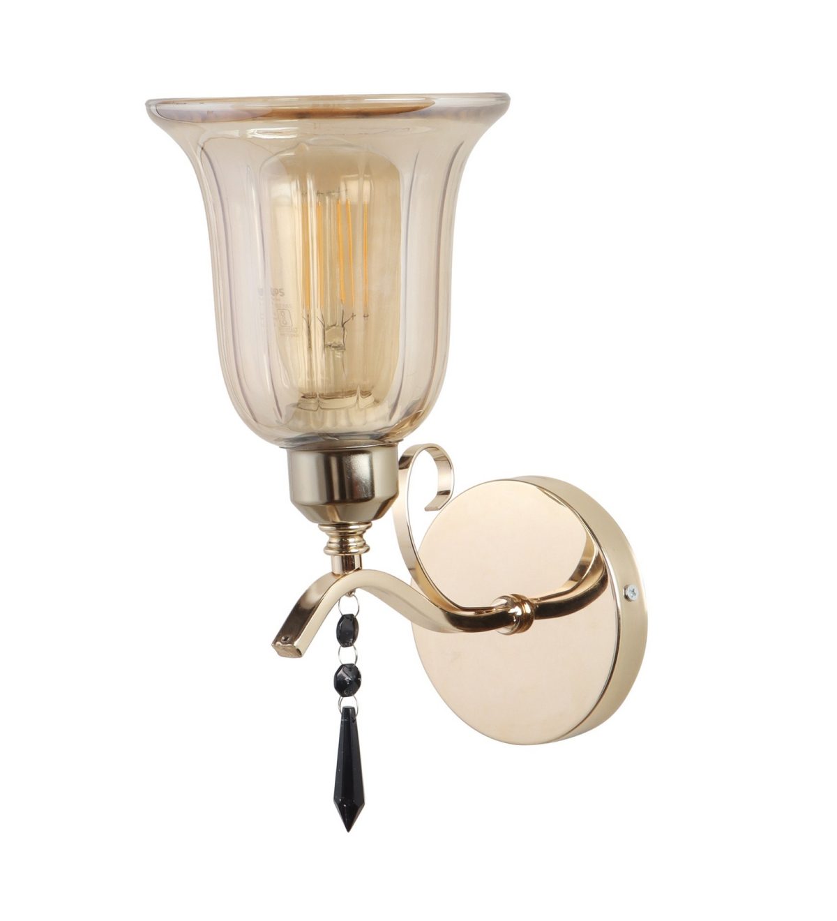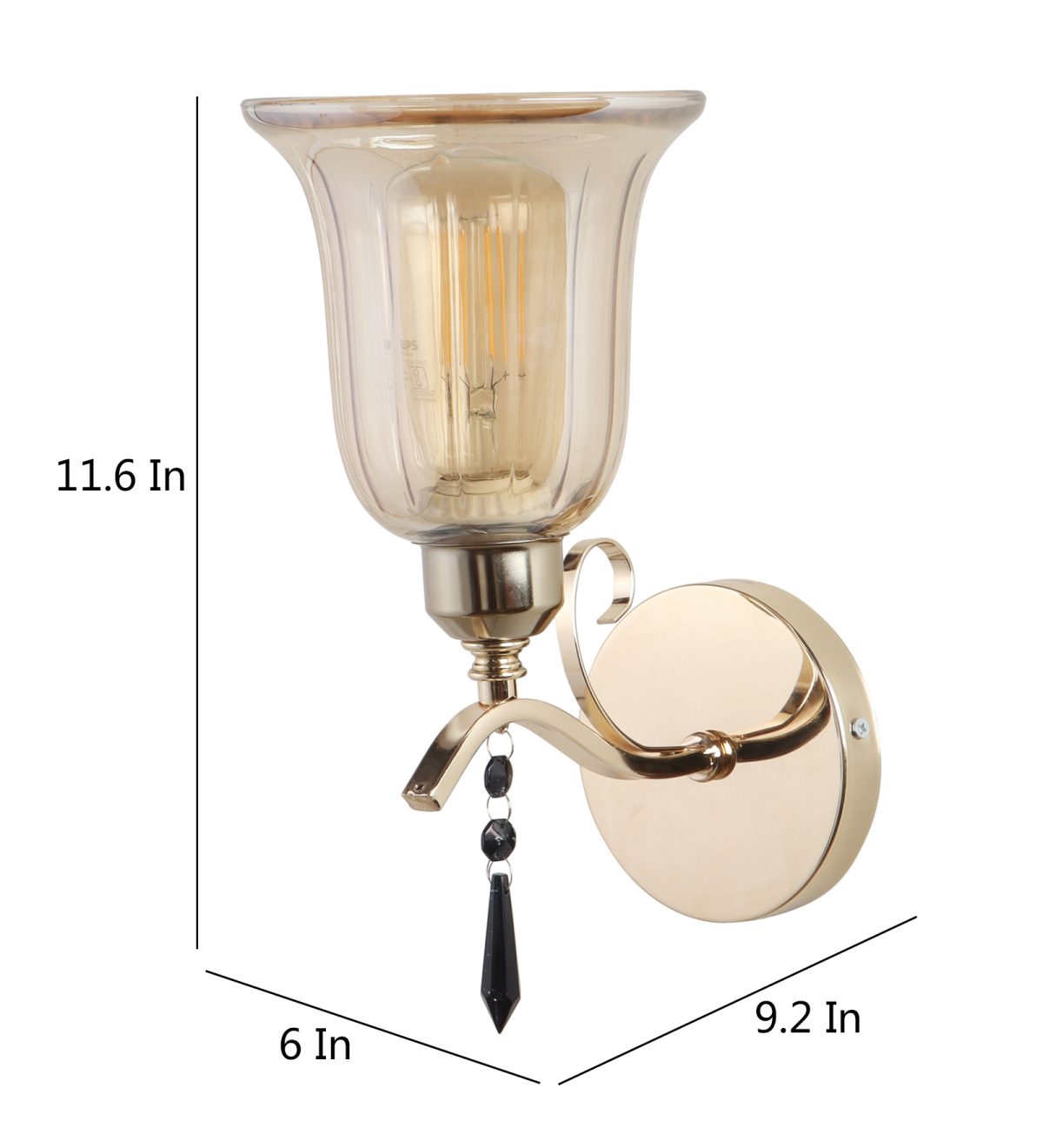 Gold finish, modern, mild steel single wall light in Champaign colored glass. It is maintenance free, comes with an E27 holder, only the change of lamp is required, which is available locally everywhere. LED filament lamp is recommended to enhance its beauty. Matching double wall light code – WL2718. Application includes both residential and commercial premises wherever it matches with your interiors. Can be customized as per requirement in case of bulk quantities. LAMP NOT INCLUDED.