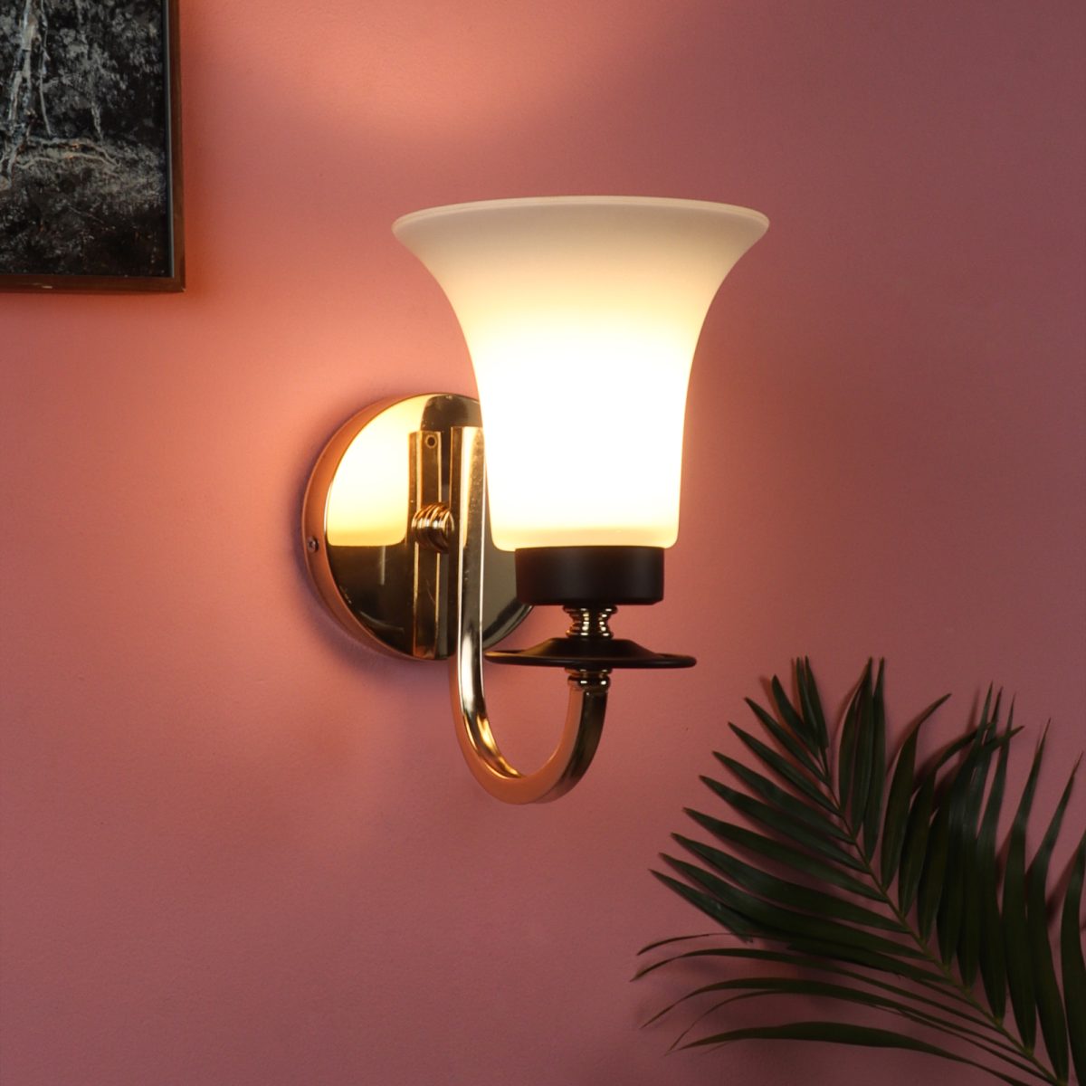 Gold, brown modern, mild steel single wall light in white bell shaped glass. It is maintenance free, comes with an E27 holder, only the change of lamp is required, which is available locally everywhere. Matching double wall light code – WL2732. Matching chandellier code – CH463. Application includes both residential and commercial premises wherever it matches with your interiors. Can be customized as per requirement in case of bulk quantities. LAMP NOT INCLUDED.
