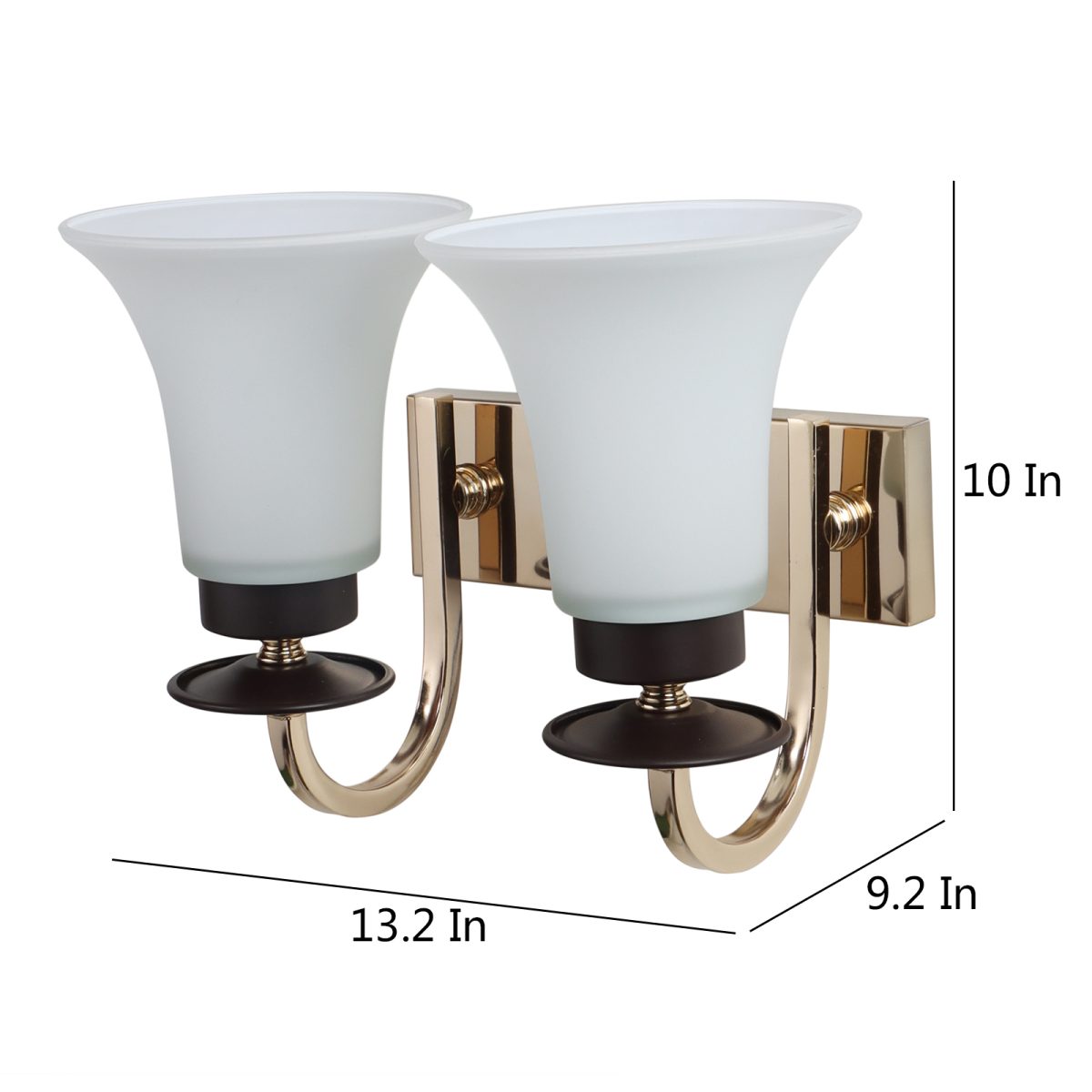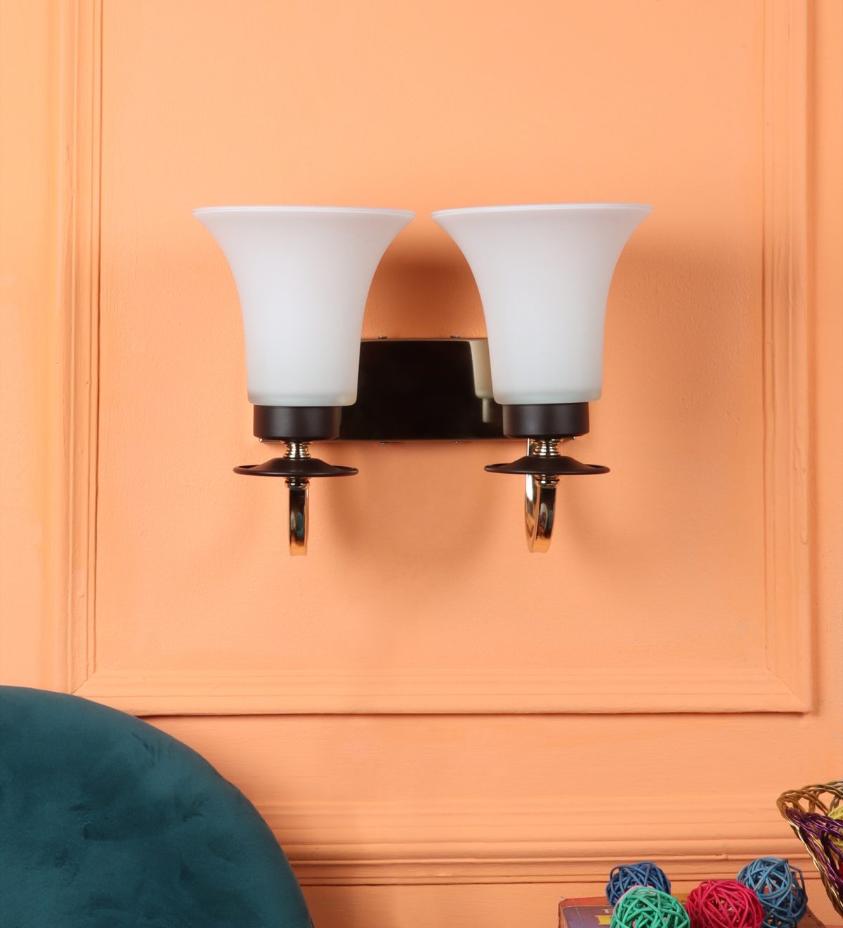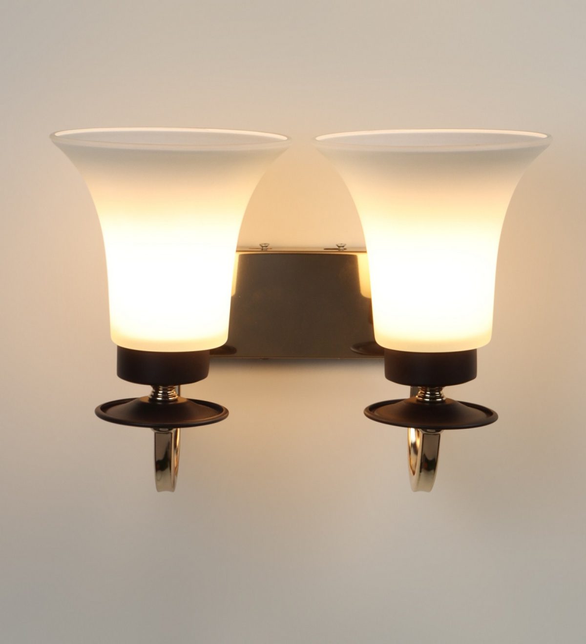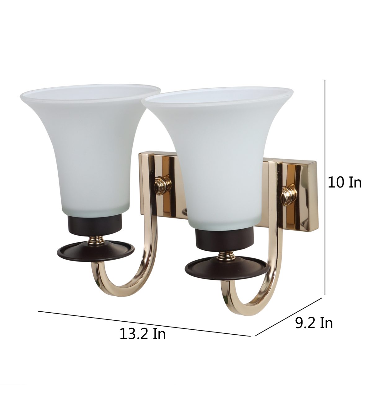Gold, brown modern, mild steel double wall light in white bell shaped glass. It is maintenance free, comes with an E27 holder, only the change of lamp is required, which is available locally everywhere. LED filament lamp is recommended to enhance its beauty. Matching double wall light code – WL2732. Application includes both residential and commercial premises wherever it matches with your interiors. Can be customized as per requirement in case of bulk quantities. LAMP NOT INCLUDED.