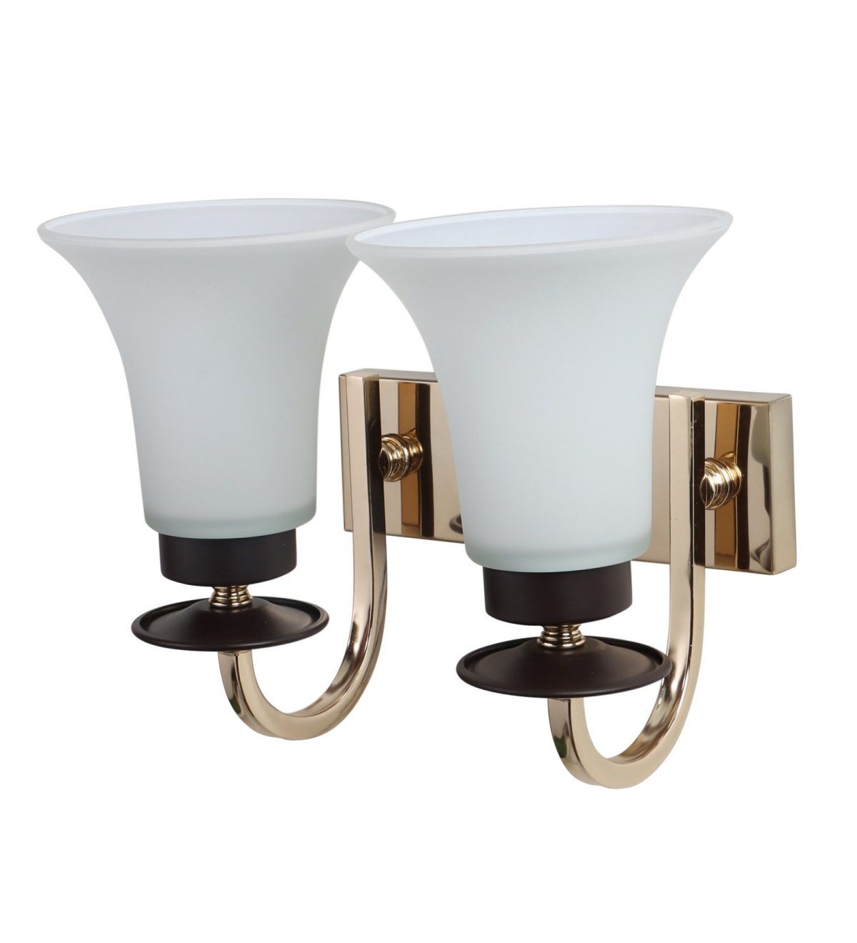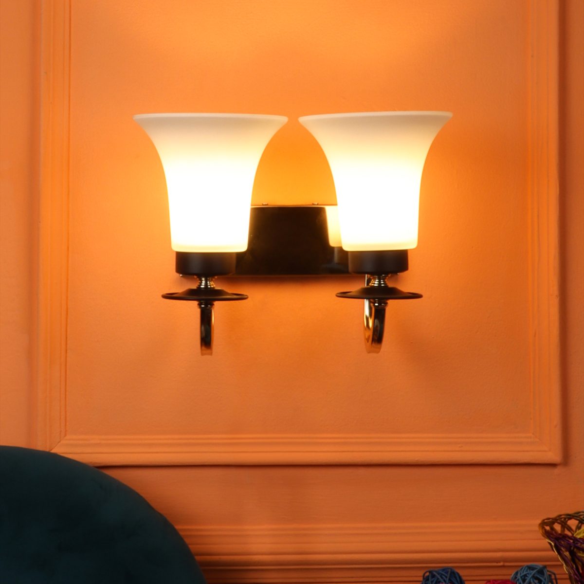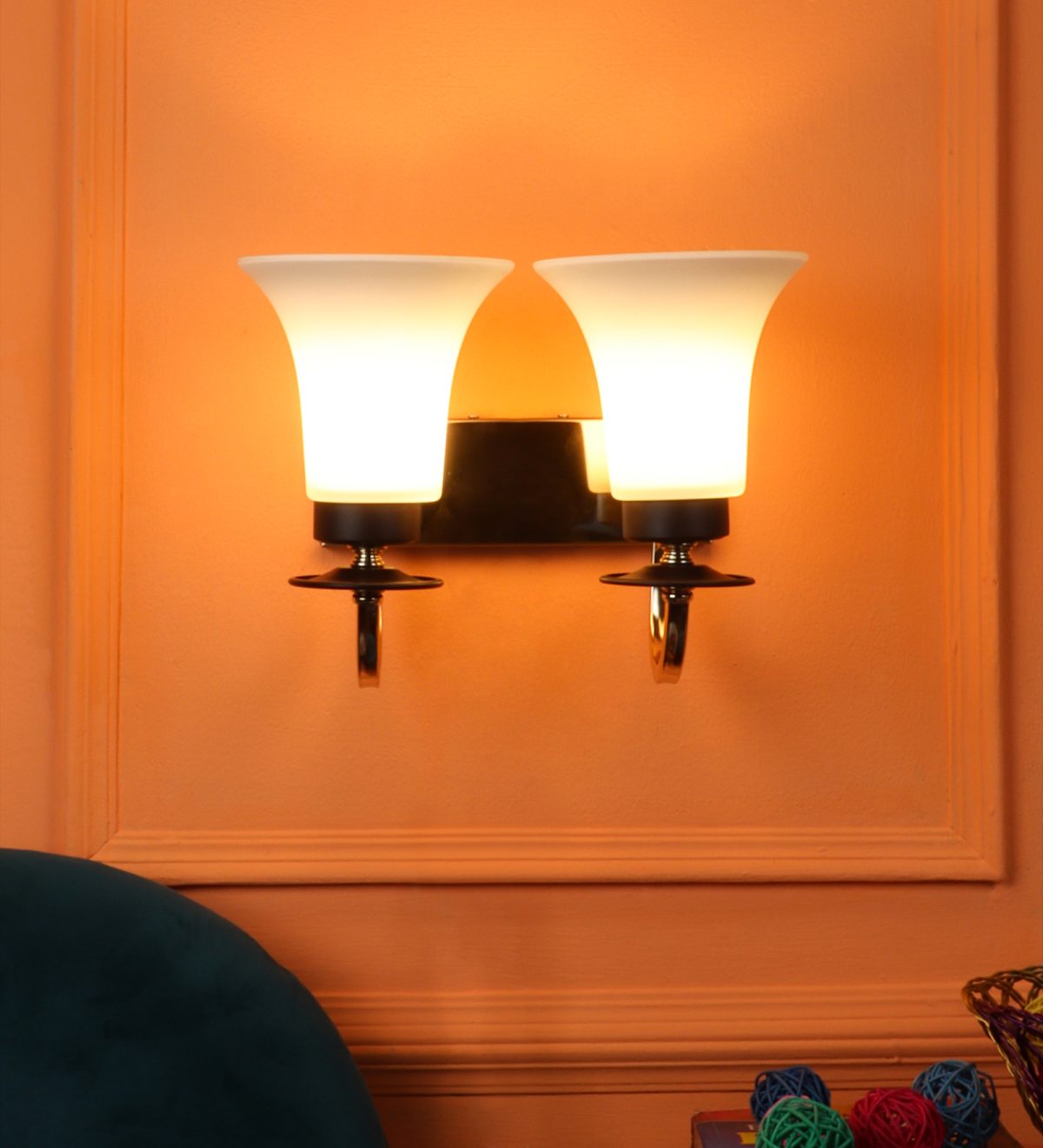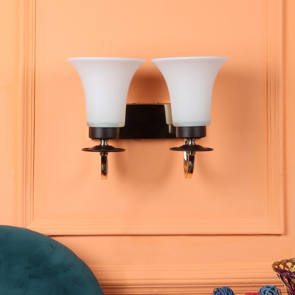 Gold, brown modern, mild steel double wall light in white bell shaped glass. It is maintenance free, comes with an E27 holder, only the change of lamp is required, which is available locally everywhere. LED filament lamp is recommended to enhance its beauty. Matching double wall light code – WL2732. Application includes both residential and commercial premises wherever it matches with your interiors. Can be customized as per requirement in case of bulk quantities. LAMP NOT INCLUDED.