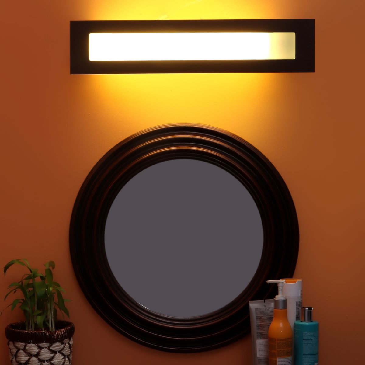 Steel mirror light in dark brown (wood) finish with a frosted glass. It comes with a 36 watt PLL tube for a very bright output. Great for installation above a mirror to provide illumination when shaving or applying make-up. It is maintenance free, comes with a PLL tube warm white (yellow) output. LED tube substitute also available easily in the market. It is maintenance free change of lamp is required, which is available locally everywhere. It is one of the bestselling product. Lamp included.