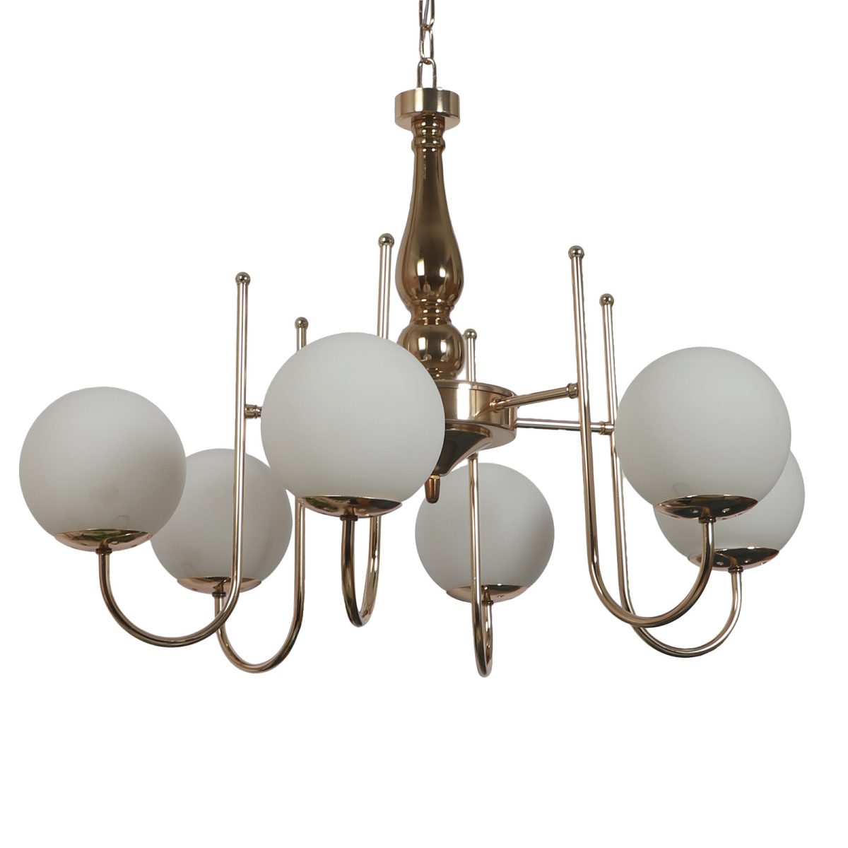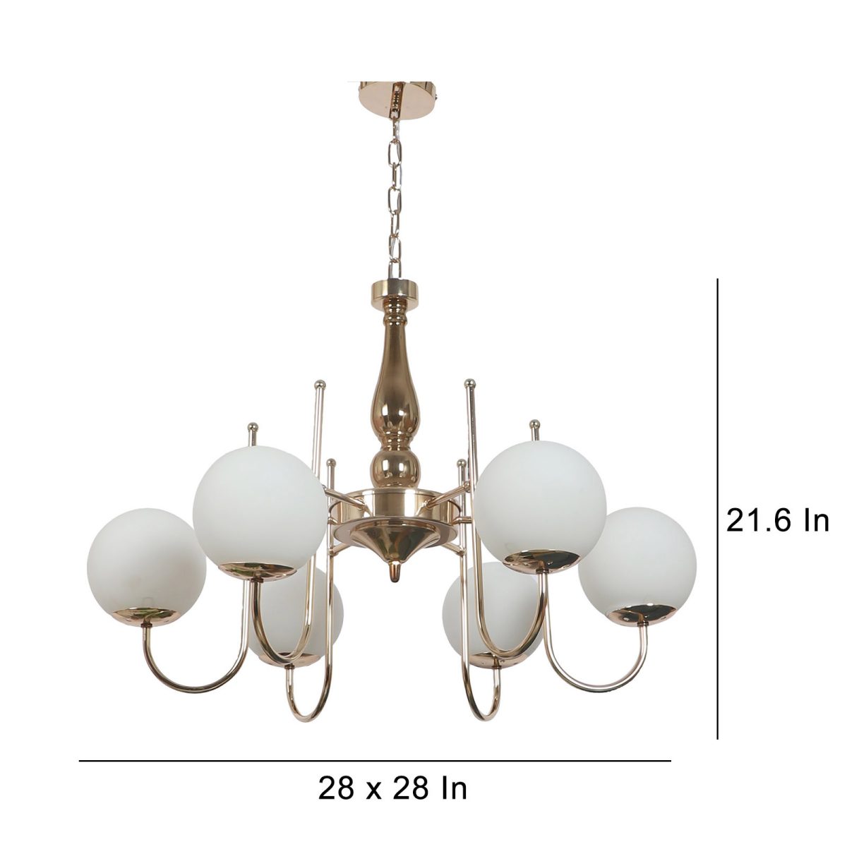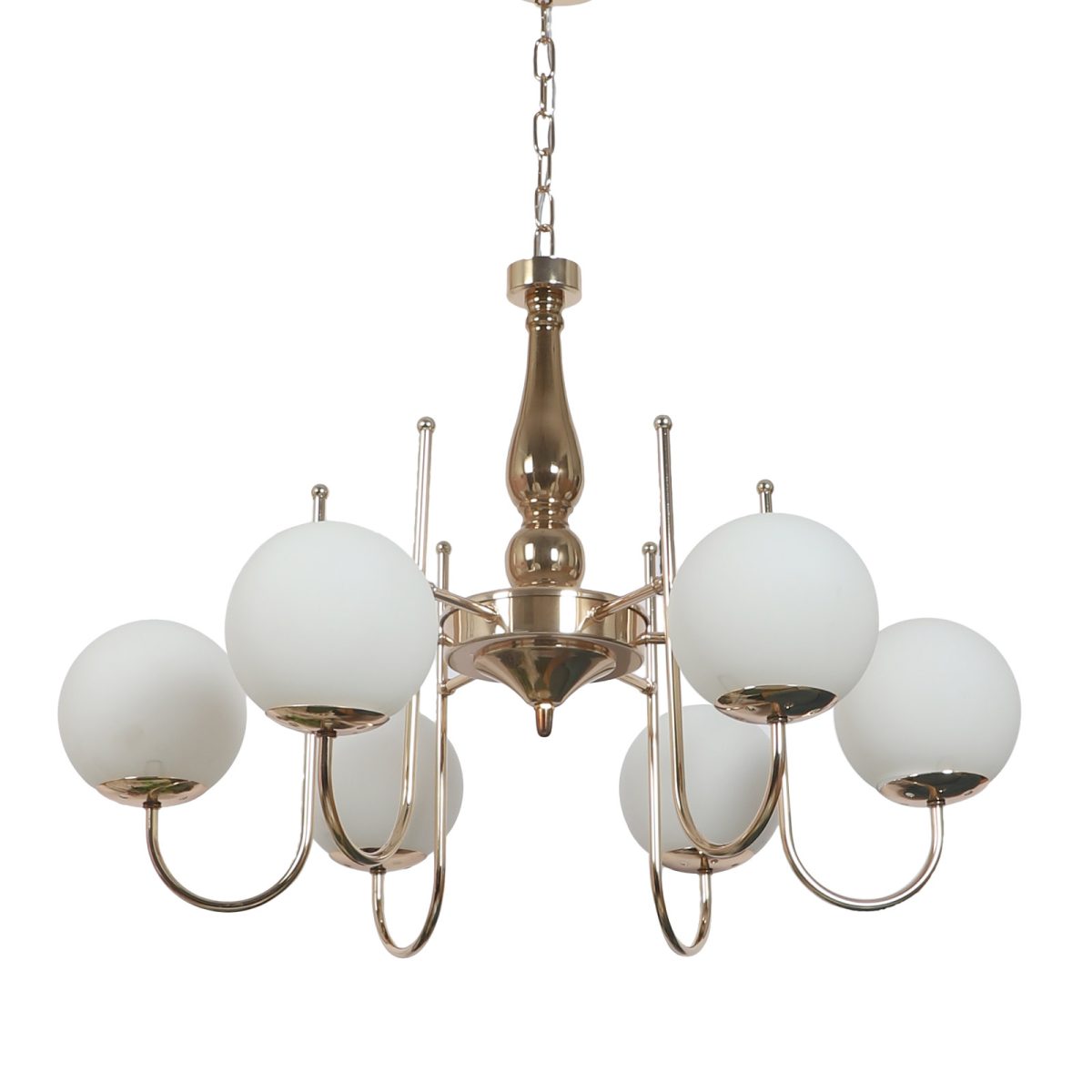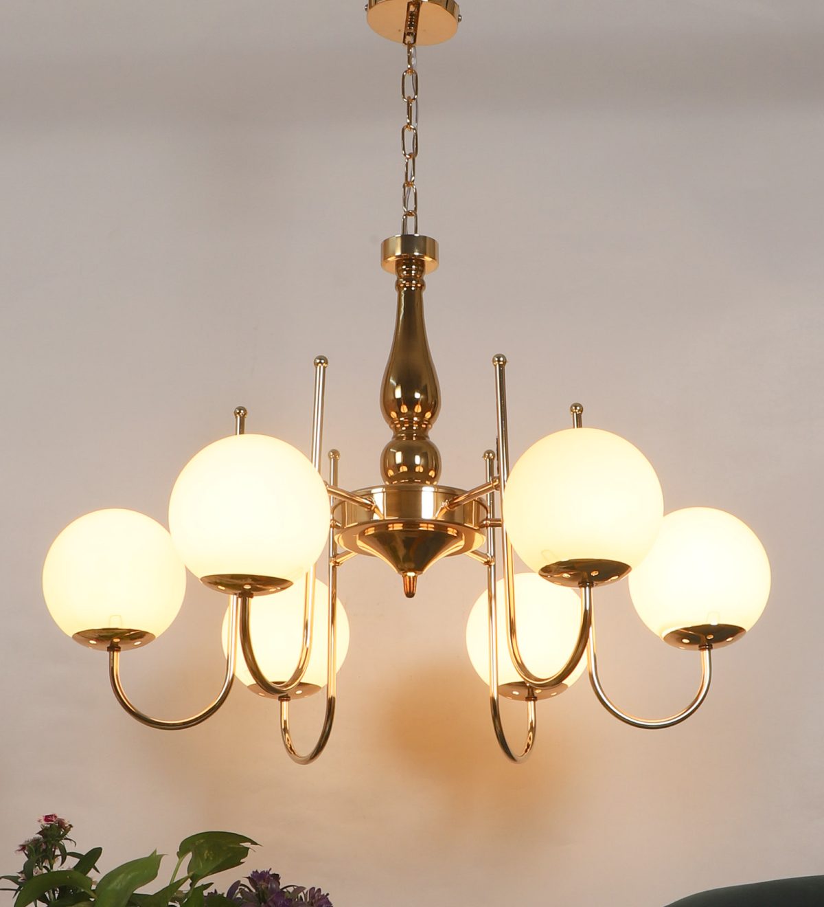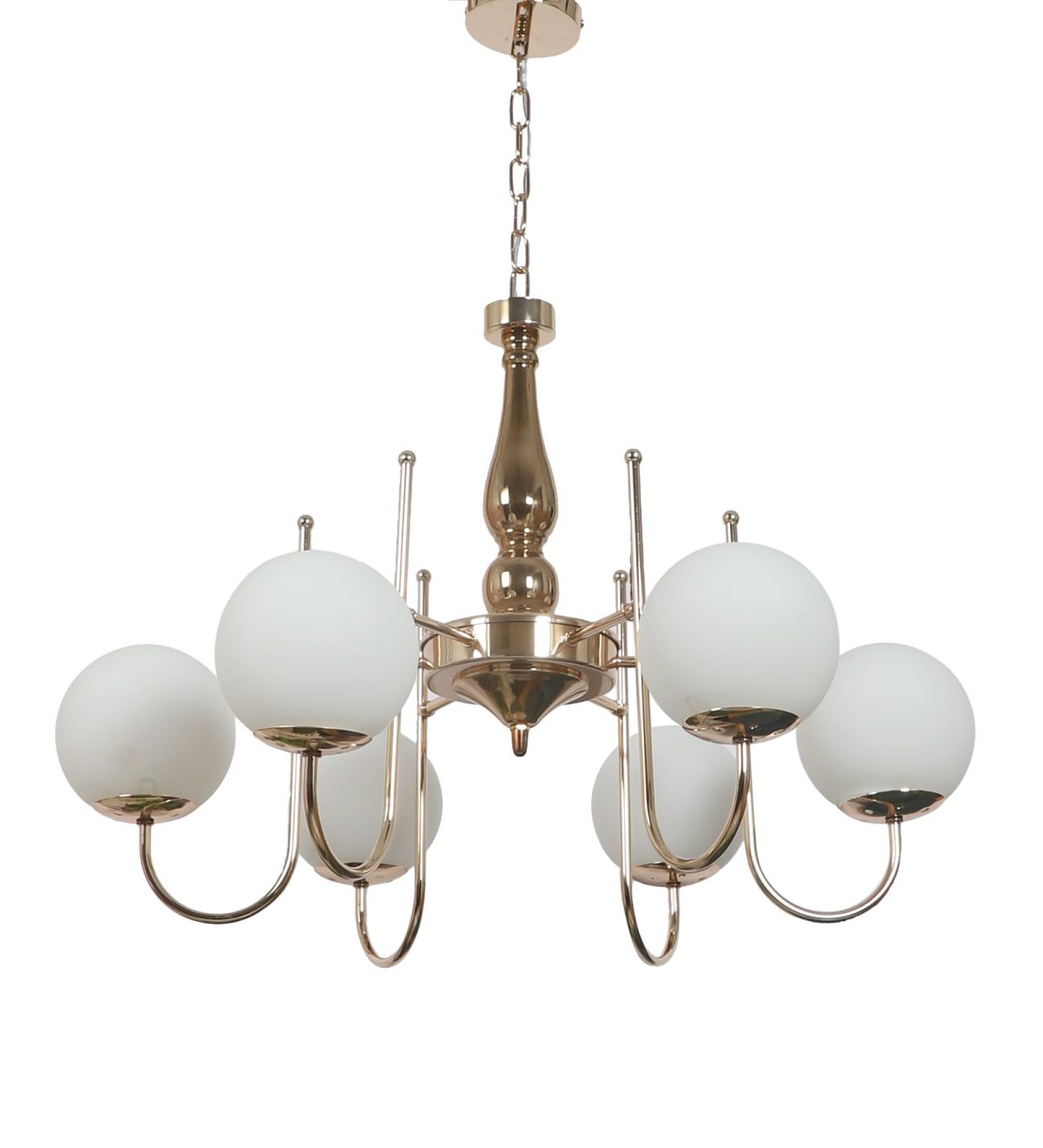 Gold finish chandellier having six lights.The suspension can be adjusted at time of installation to the desired height. It is maintenance free, it is easy to remove glasses and wash them. Comes with an E27 holder.Can be customized as per requirement even for small quantities. Other sizes can be made as per reruirement. LAMP NOT INCLUDED.