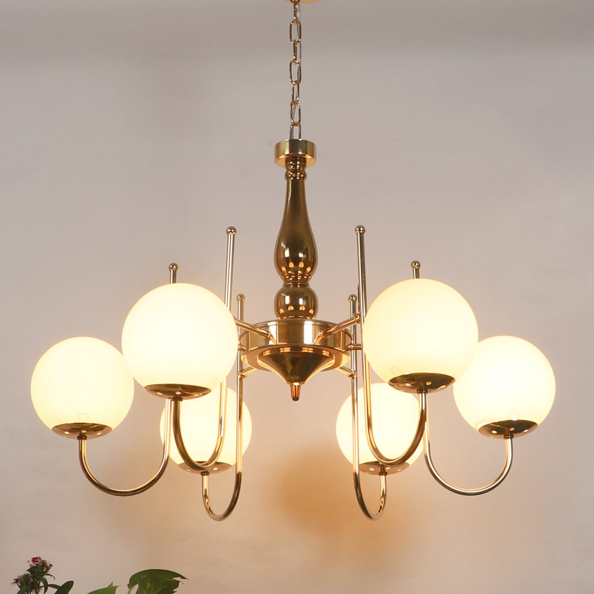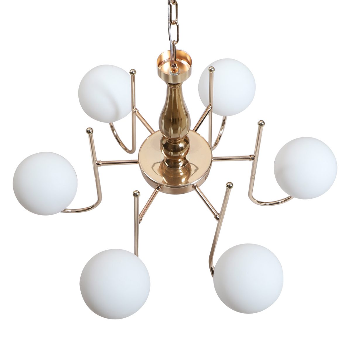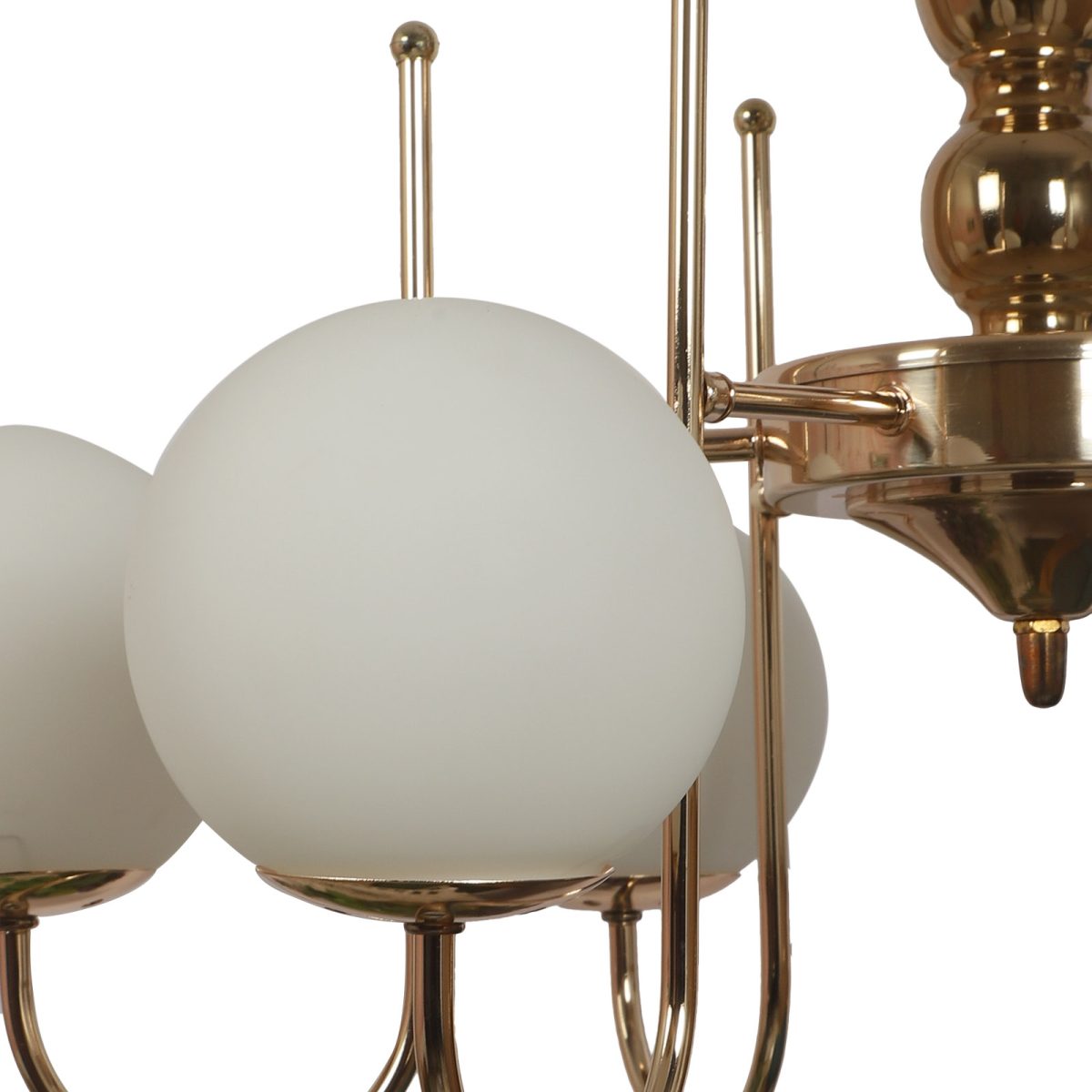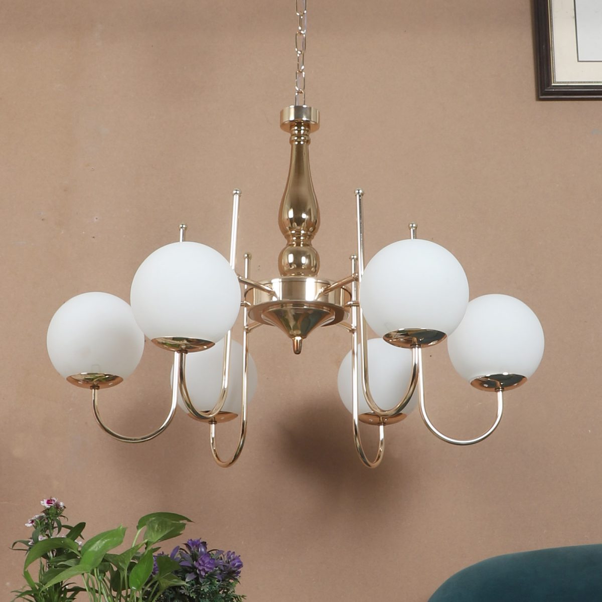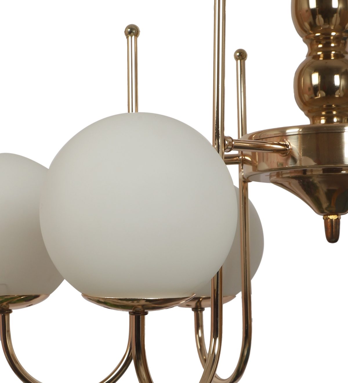 Gold finish chandellier having six lights.The suspension can be adjusted at time of installation to the desired height. It is maintenance free, it is easy to remove glasses and wash them. Comes with an E27 holder.Can be customized as per requirement even for small quantities. Other sizes can be made as per reruirement. LAMP NOT INCLUDED.