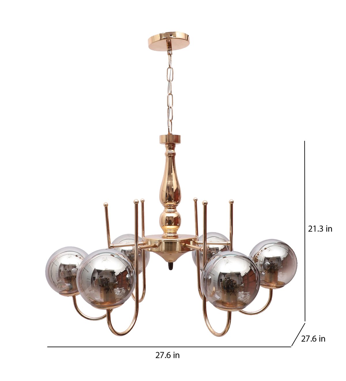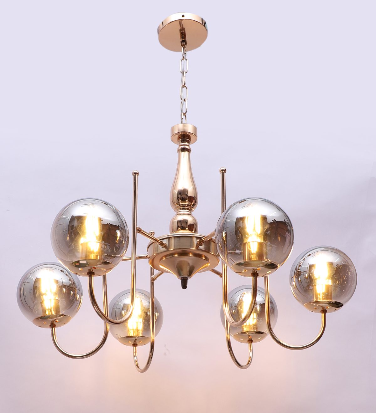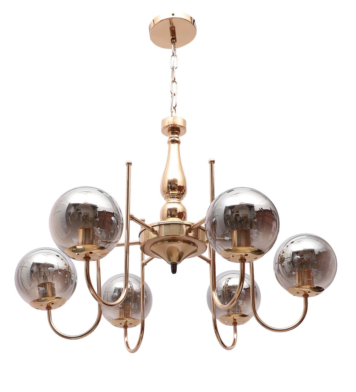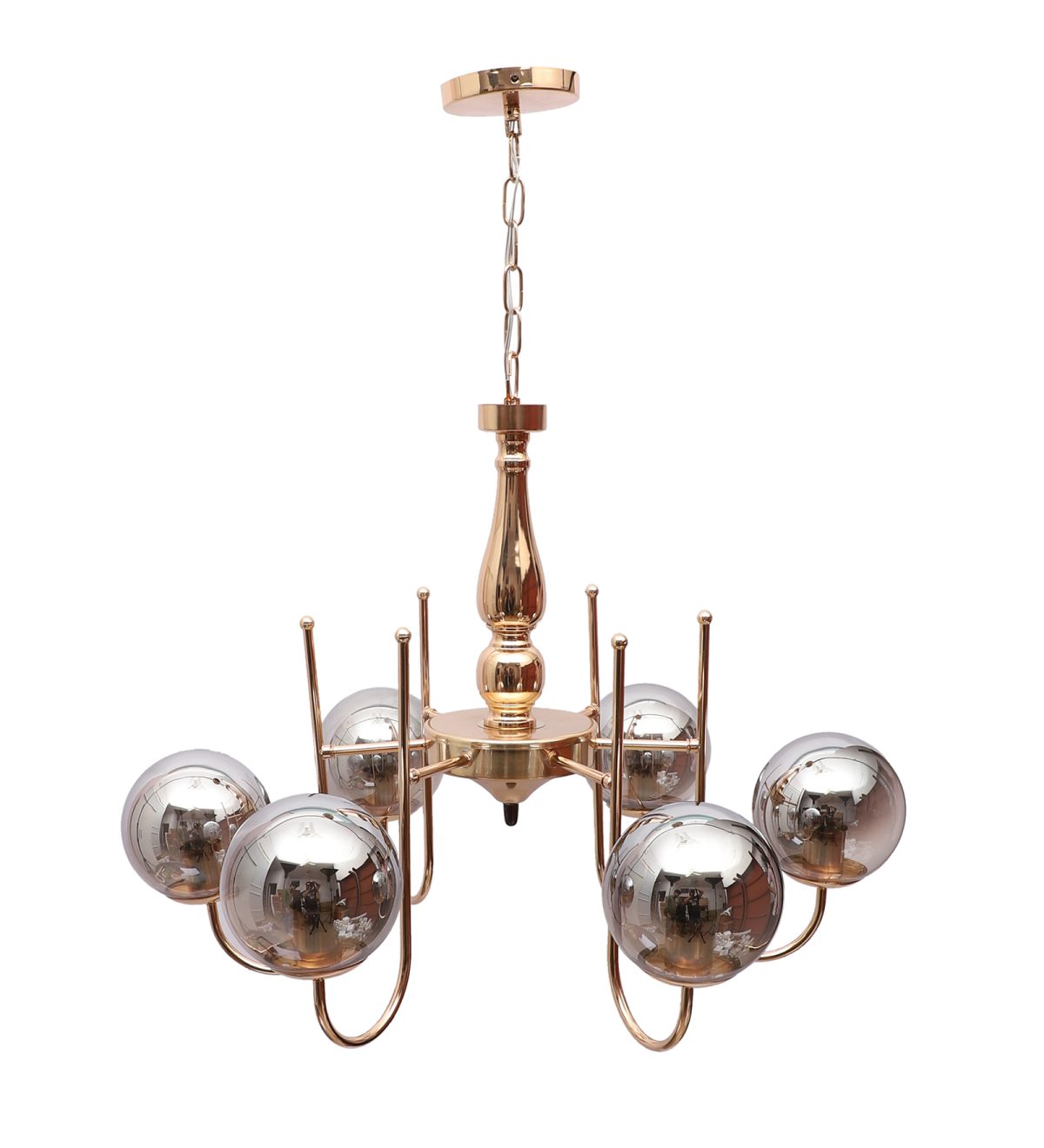 Gold finish chandellier having six lights.The suspension can be adjusted at time of installation to the desired height. It is maintenance free, it is easy to remove glasses and wash them. Comes with an E27 holder.Can be customized as per requirement even for small quantities. Other sizes can be made as per reruirement. LAMP NOT INCLUDED.