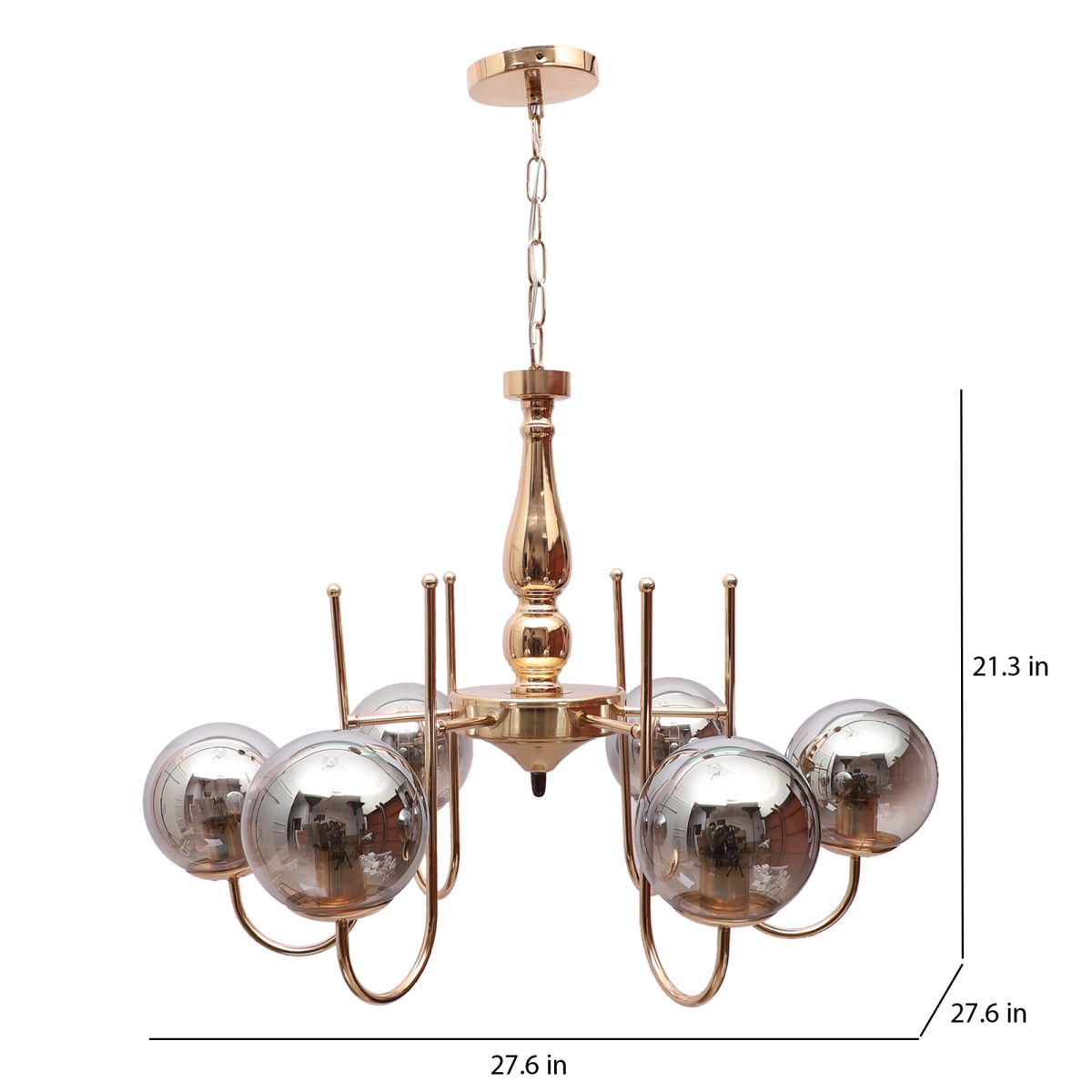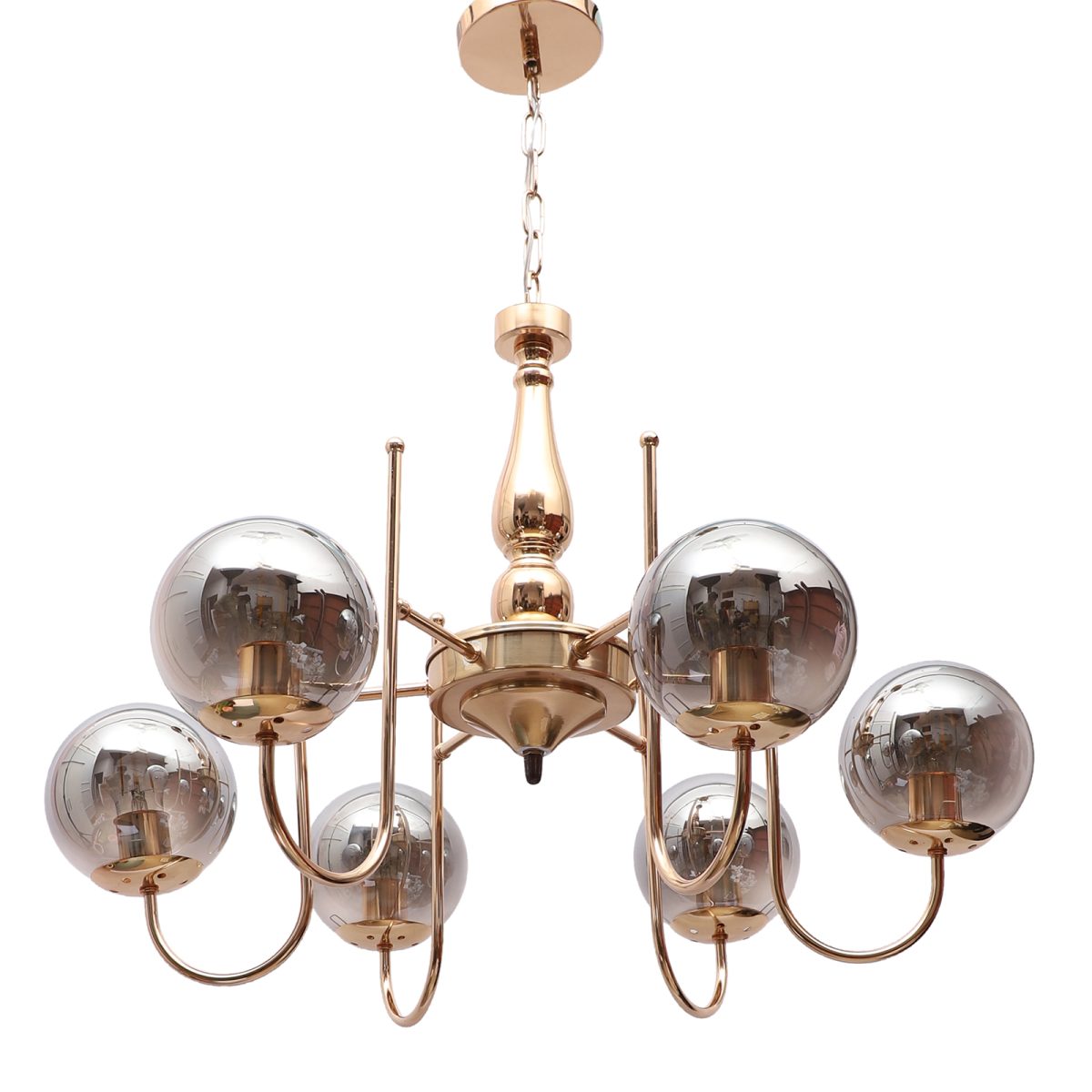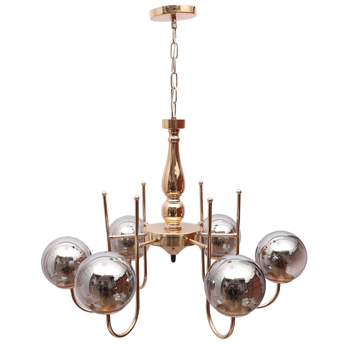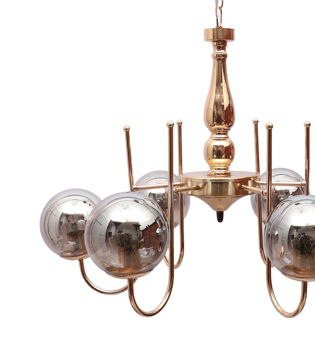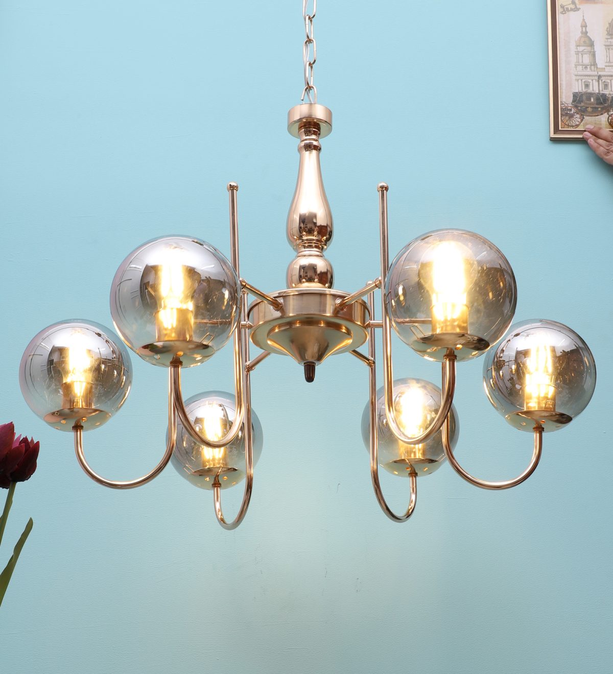 Gold finish chandellier having six lights.The suspension can be adjusted at time of installation to the desired height. It is maintenance free, it is easy to remove glasses and wash them. Comes with an E27 holder.Can be customized as per requirement even for small quantities. Other sizes can be made as per reruirement. LAMP NOT INCLUDED.