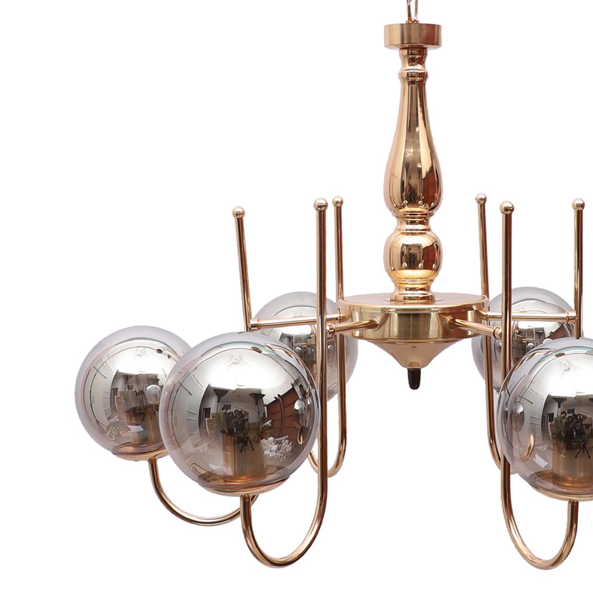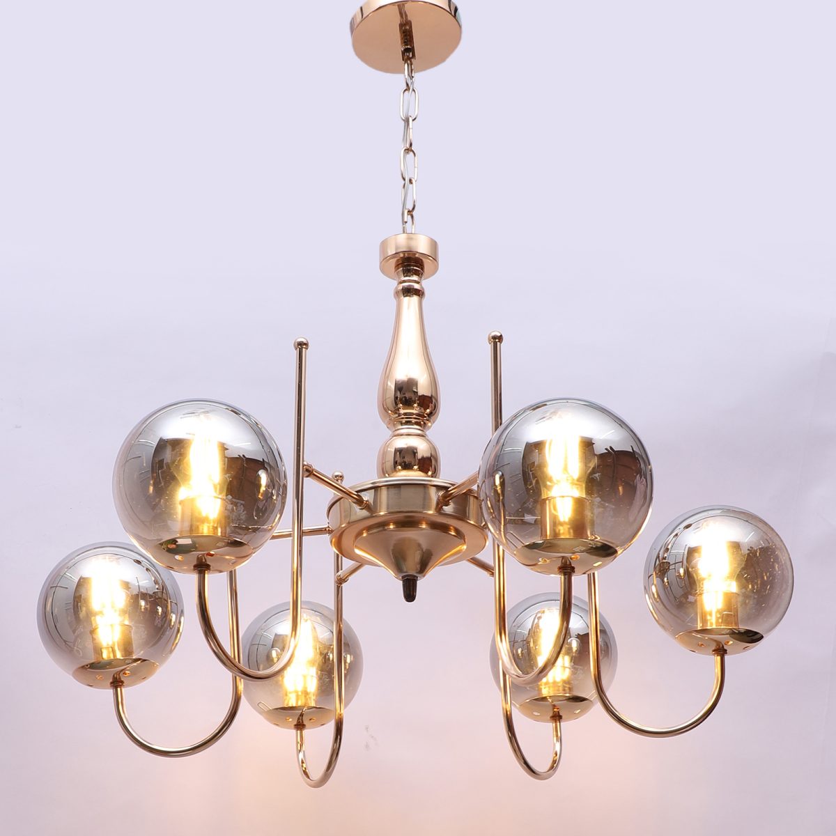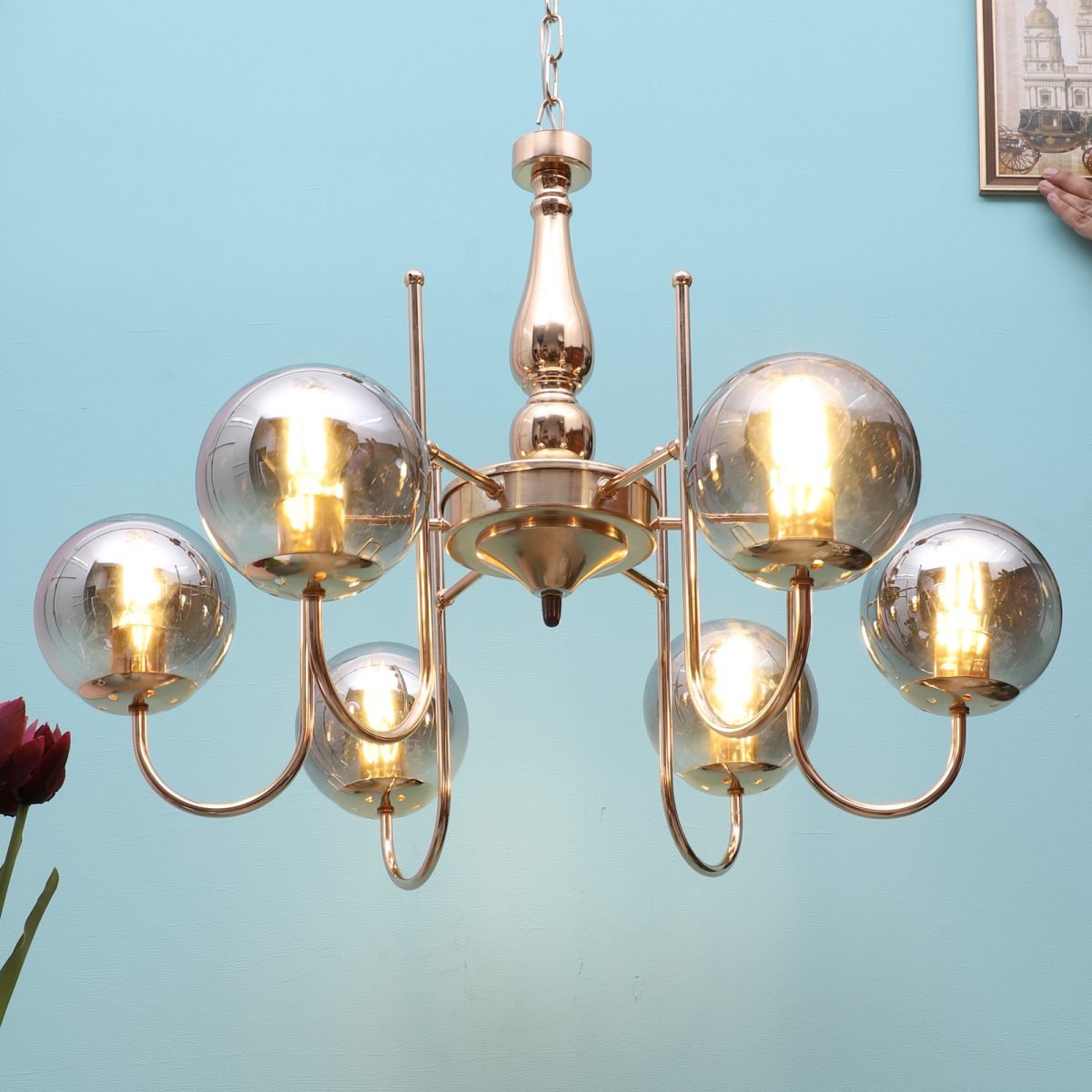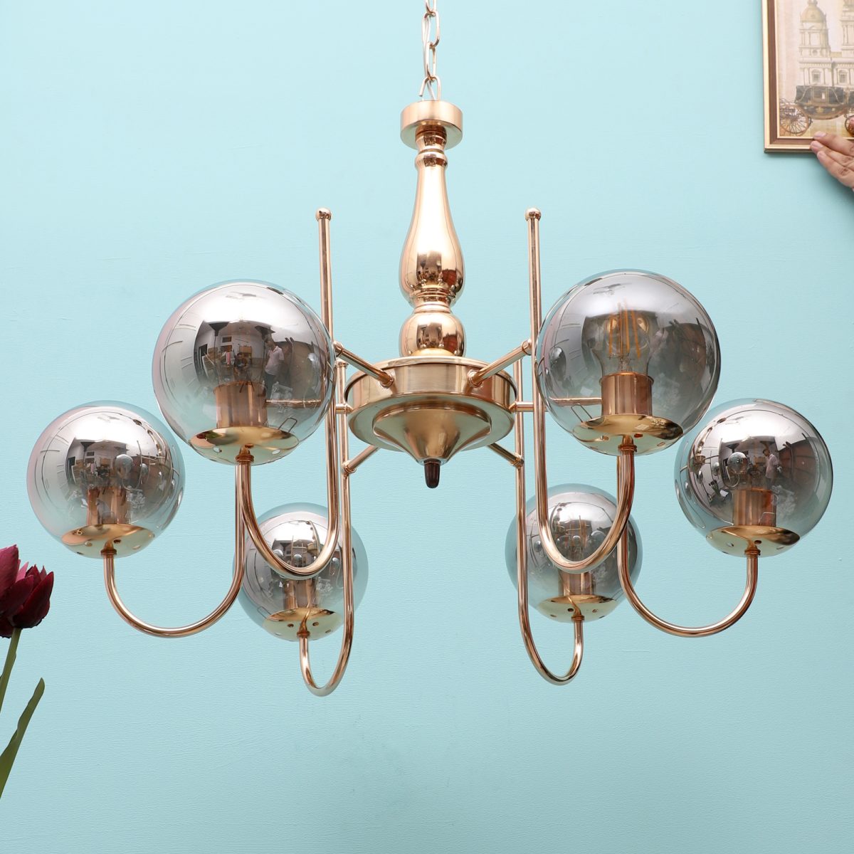 Gold finish chandellier having six lights.The suspension can be adjusted at time of installation to the desired height. It is maintenance free, it is easy to remove glasses and wash them. Comes with an E27 holder.Can be customized as per requirement even for small quantities. Other sizes can be made as per reruirement. LAMP NOT INCLUDED.