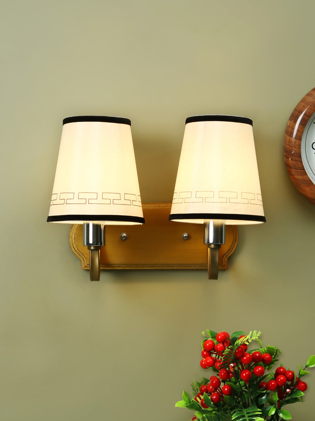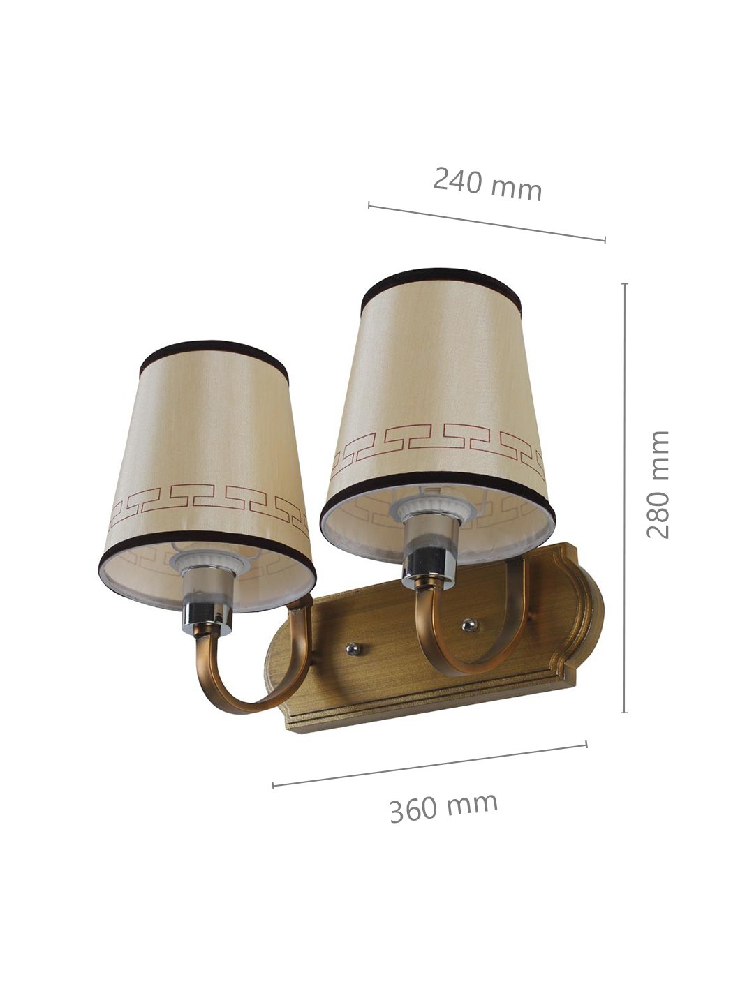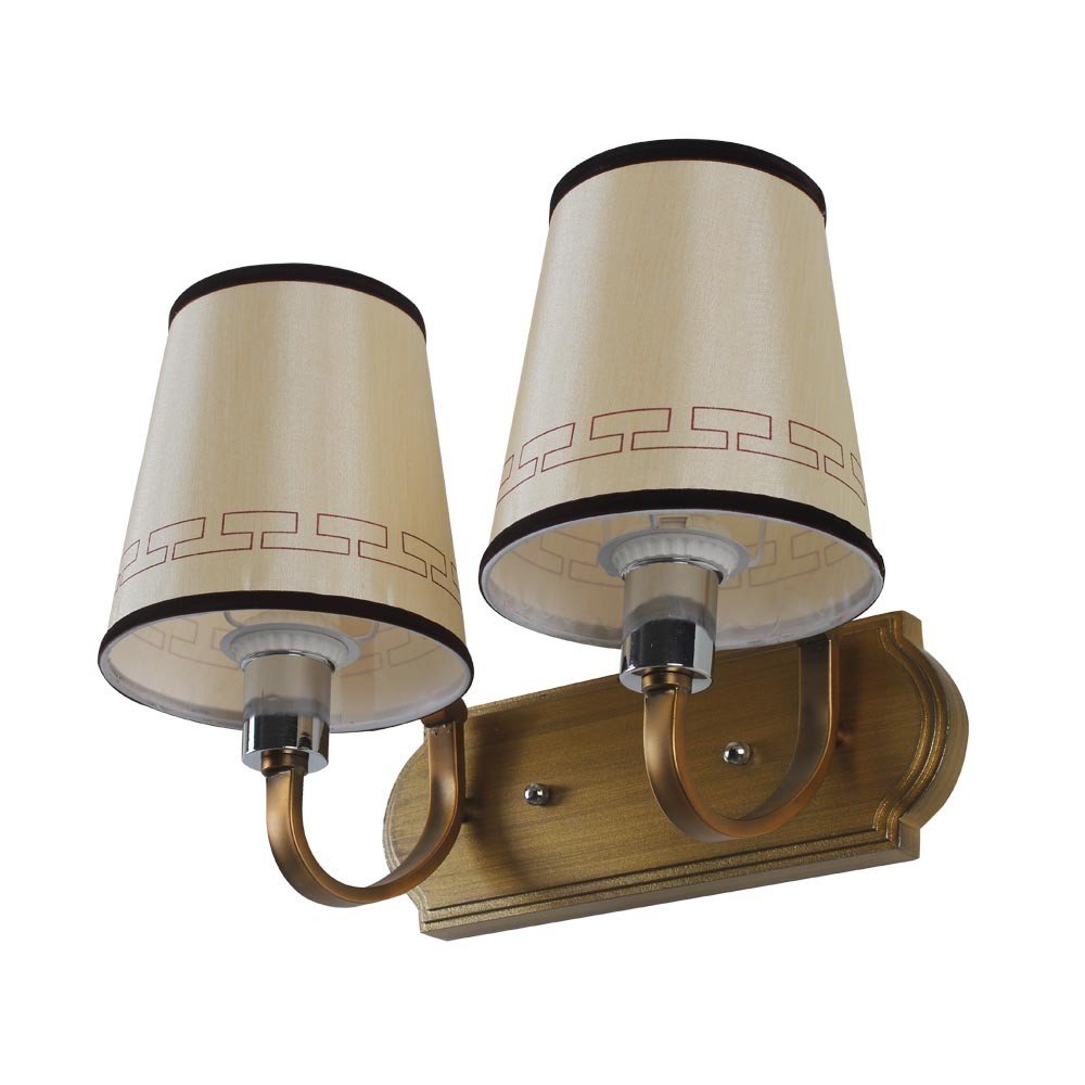 Antique brass, finish double wall light with taper fabric shade off white with a brown border, made of mild steel. It is maintenance free. Comes with an E27 holder, only the change of lamp is required, which is available locally everywhere. Application includes both residential and commercial premises wherever it matches with your interiors. Matching single wall light code – WL2185. Can be customized as per requirement in case of bulk quantities. Lamp not included.