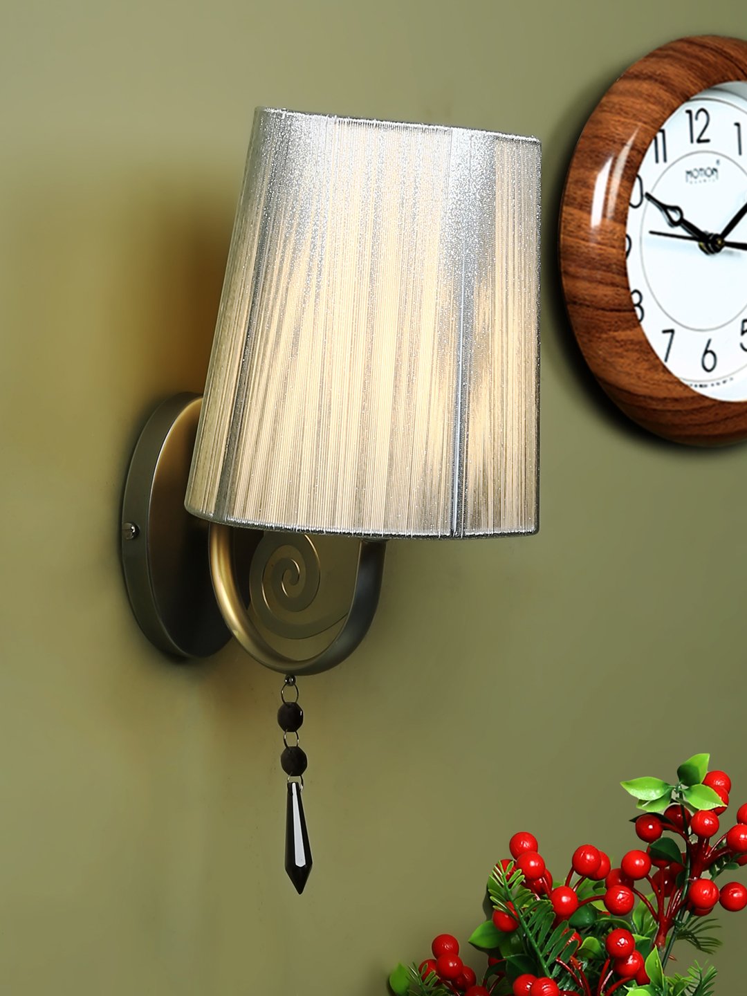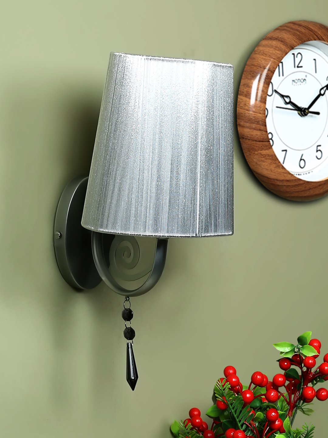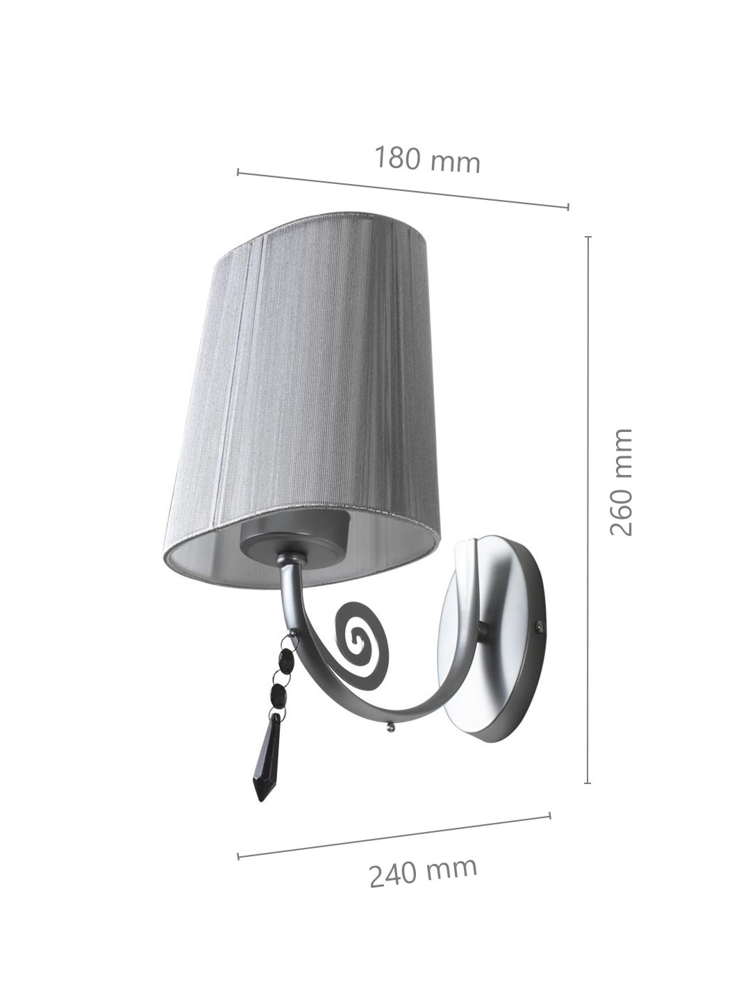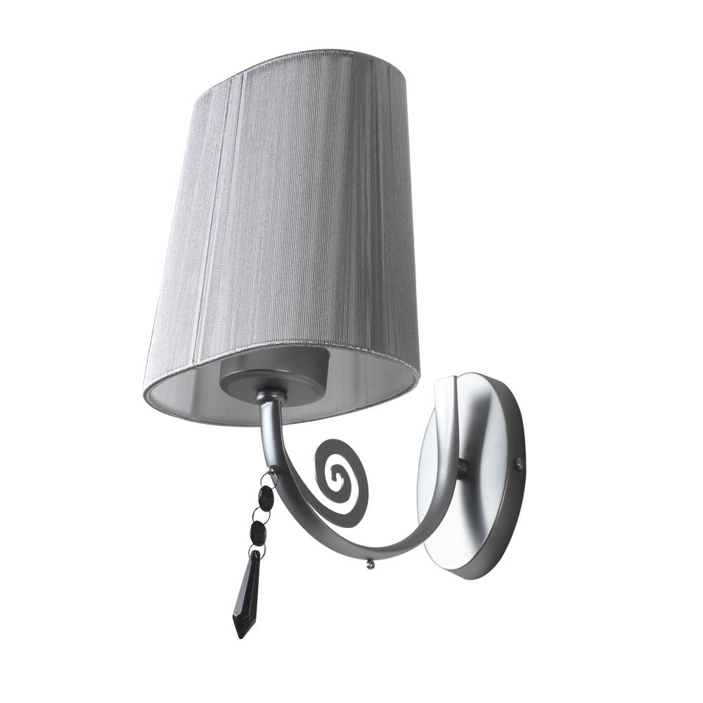 Silver (chrome) finish single wall light with crystal and taper silver fabric shade. It is maintenance free, comes with an E27 holder, only the change of lamp is required, which is available locally everywhere. Application includes both residential and commercial premises wherever it matches with your interiors. It is ideal for installing on both sides of the bed at a low height. Ideal for hotel or guest rooms. It is one of the best selling product in our catalogue. Lamp not included.