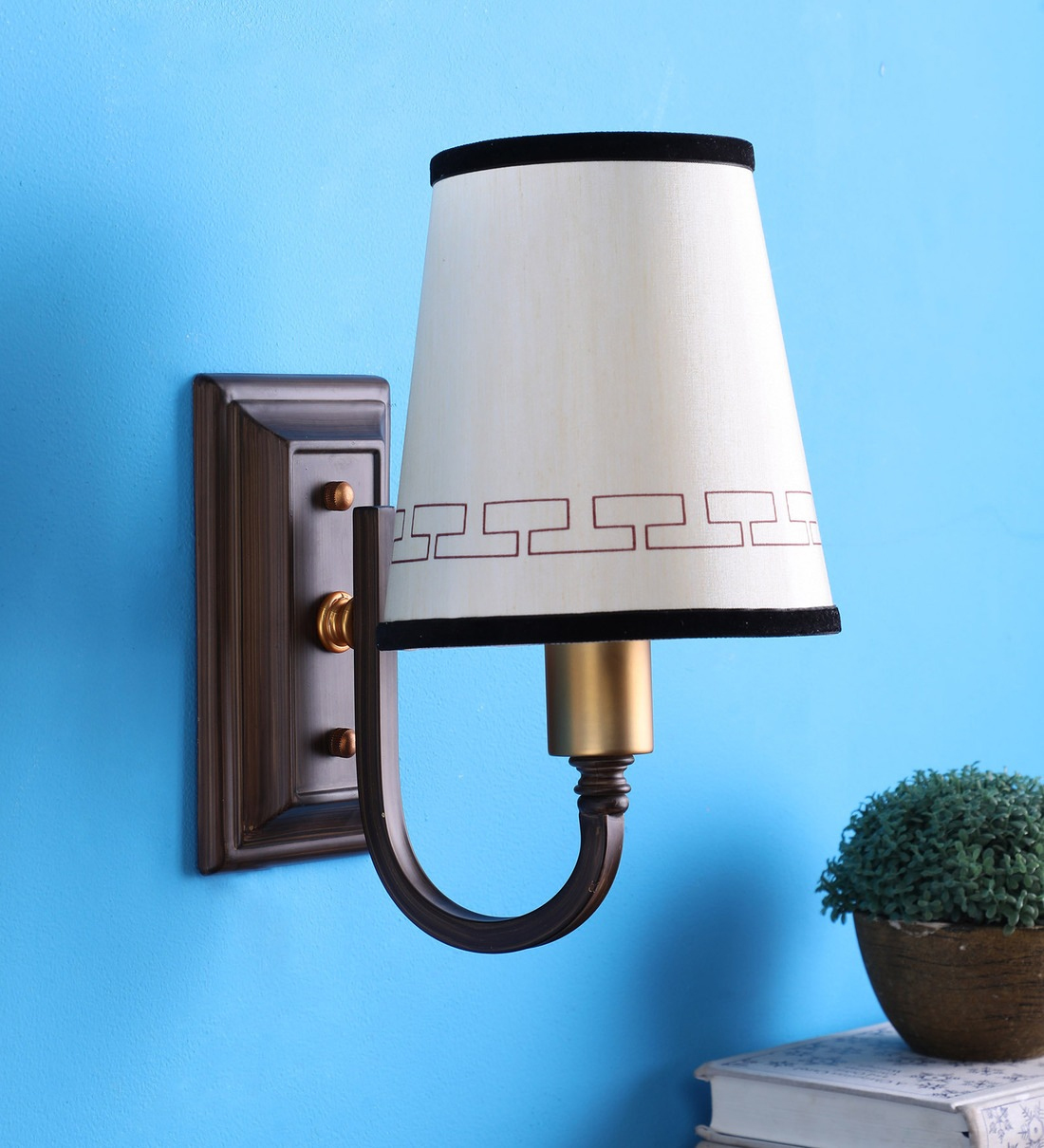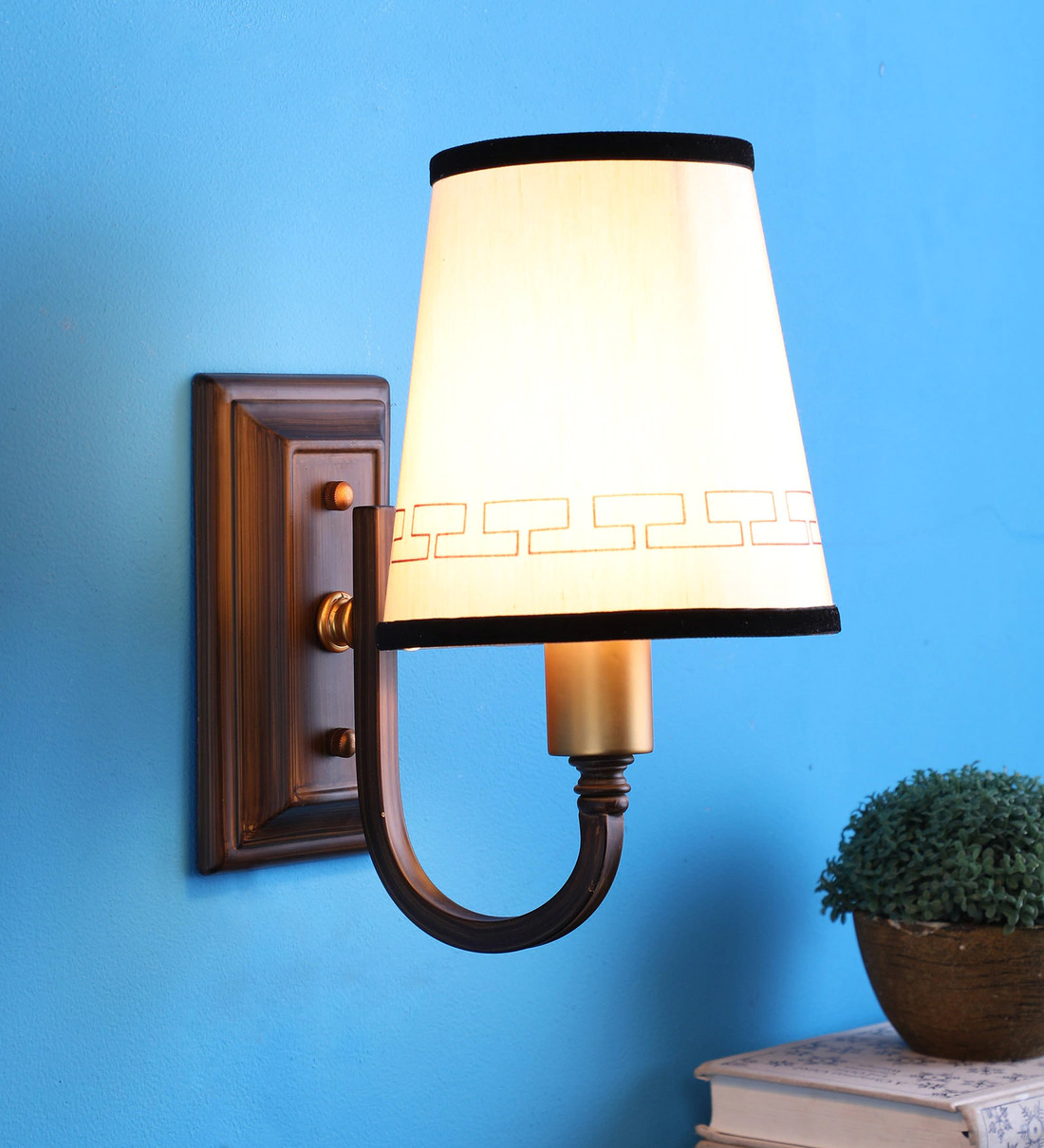 Dark brown, gold, (wood – gold), finish, taper off white fabric shade with brown border at both the edges, single wall light made of mild steel. It is maintenance free. Comes with an E27 holder, only the change of lamp is required, which is available locally everywhere. Application includes both residential and commercial premises wherever it matches with your interiors. Matching double wall light code WL2392. Matching chandelier code – CH408. Can be customized as per requirement in case of bulk quantities. Lamp not included.
