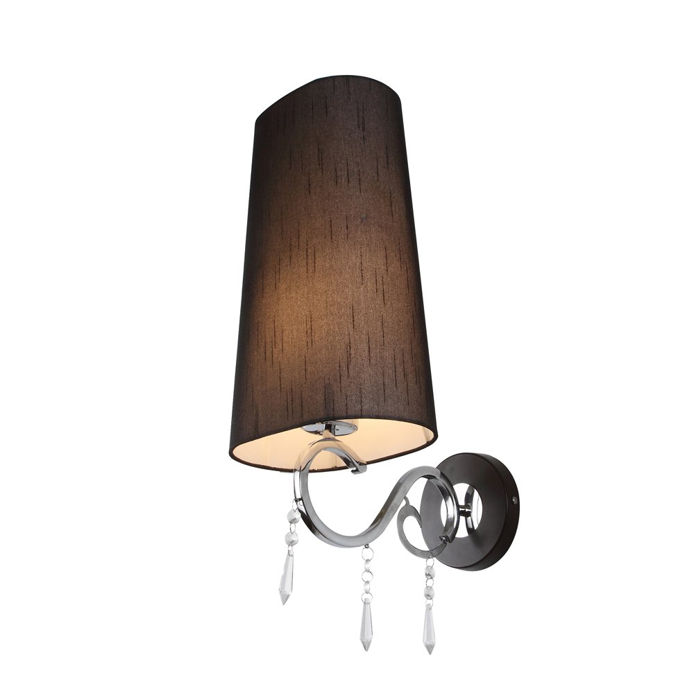 Dark brown (wood), silver (chrome), finish wall light with oval long black fabric shade and mild steel bracket having crystals. Extremely good for hotel rooms when installed with matching hanging lights. It is maintenance free, comes with an E27 holder, only the change of lamp is required, which is available locally everywhere. Application includes both residential and commercial premises wherever it matches with your interiors. Other variations with different color -HL5067, HL5068, HL5069, HL5070, HL5071, HL5072, HL5073. Matching wall lights – WL2415, WL2416, WL2418, WL2419, WL2420. Can be customized as per requirement in case of bulk quantities. Lamp not included.