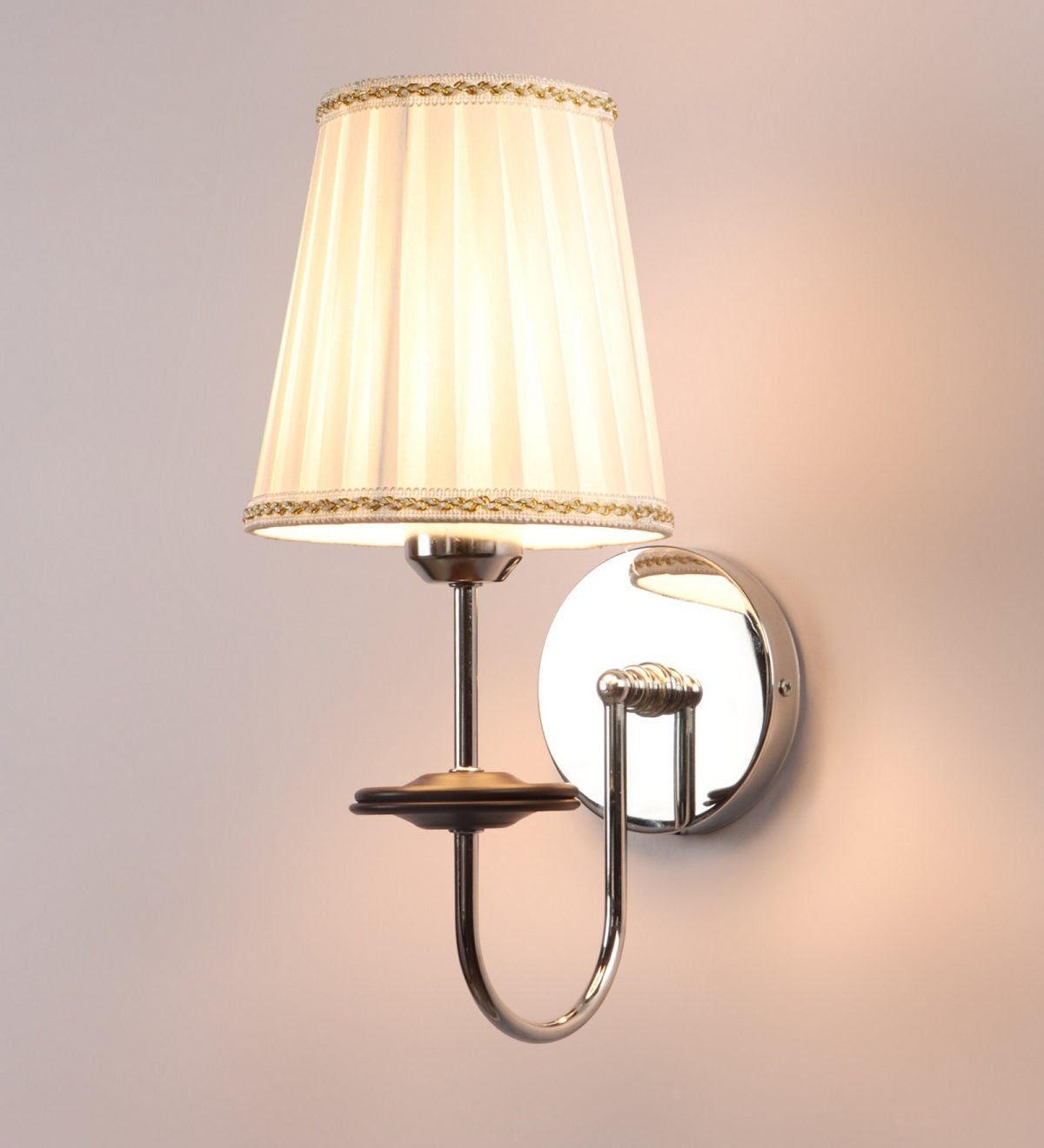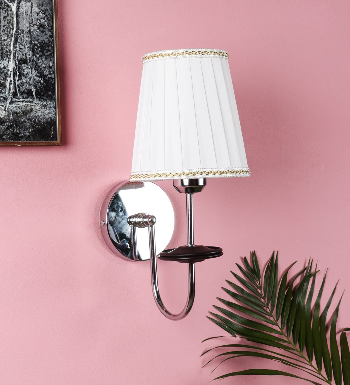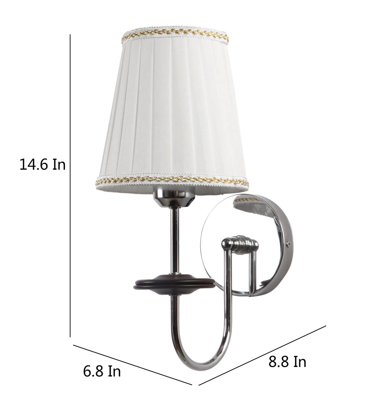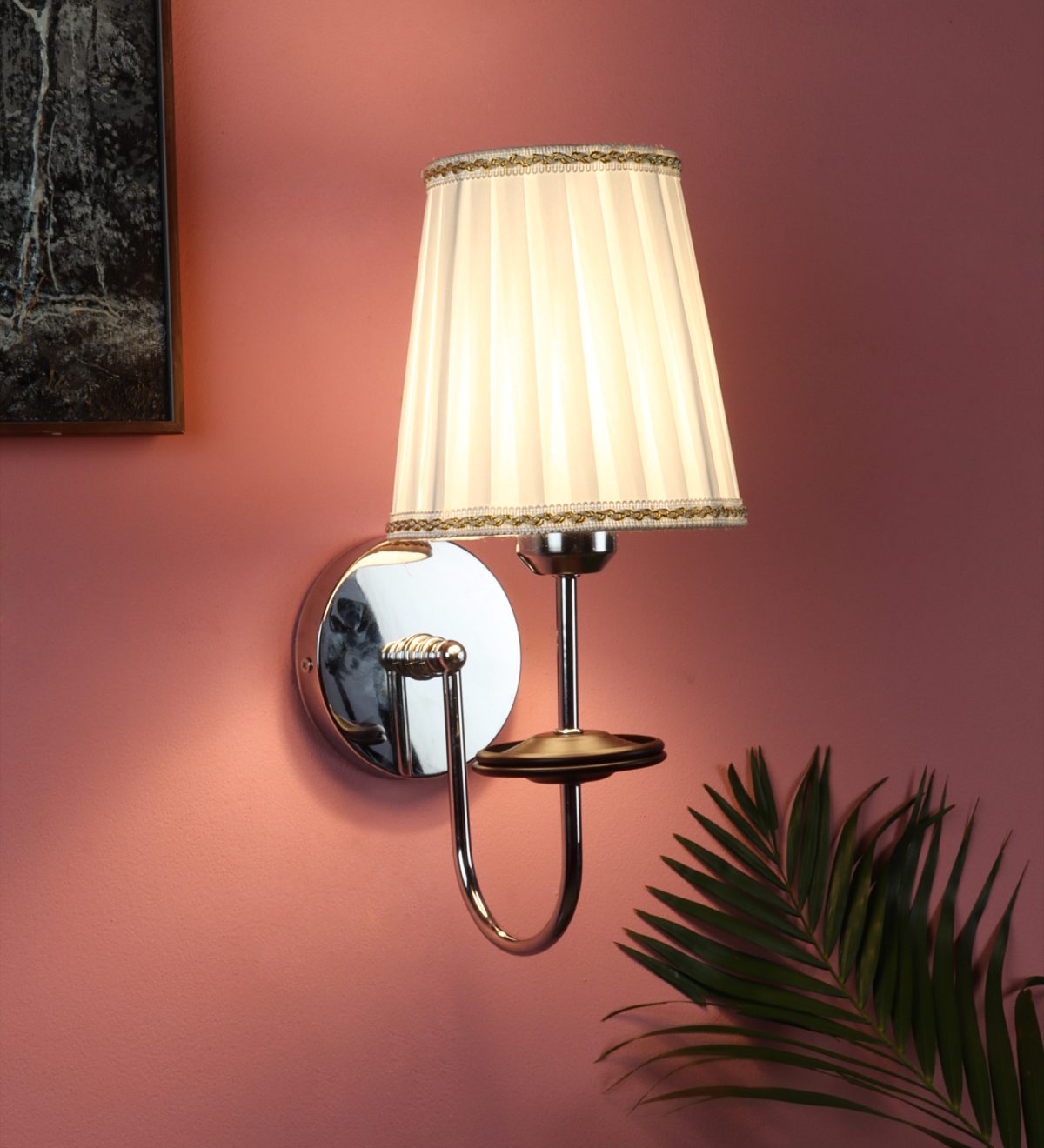 Silver (chrome) finish single wall light with taper off white fabric shade. It is maintenance free, comes with an E27 holder, only the change of lamp is required, which is available locally everywhere. Application includes both residential and commercial premises wherever it matches with your interiors. It is ideal for installing on both sides of the bed at a low height. Ideal for hotel or guest rooms.Matching double wall light code – WL2682. LAMP NOT INCLUDED.
