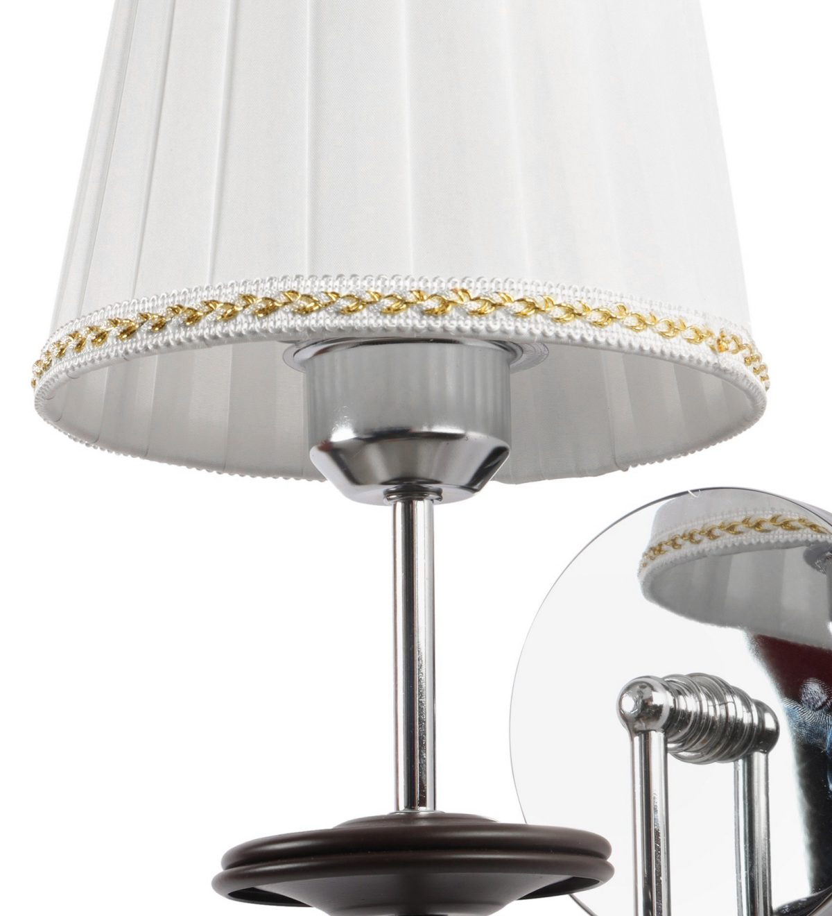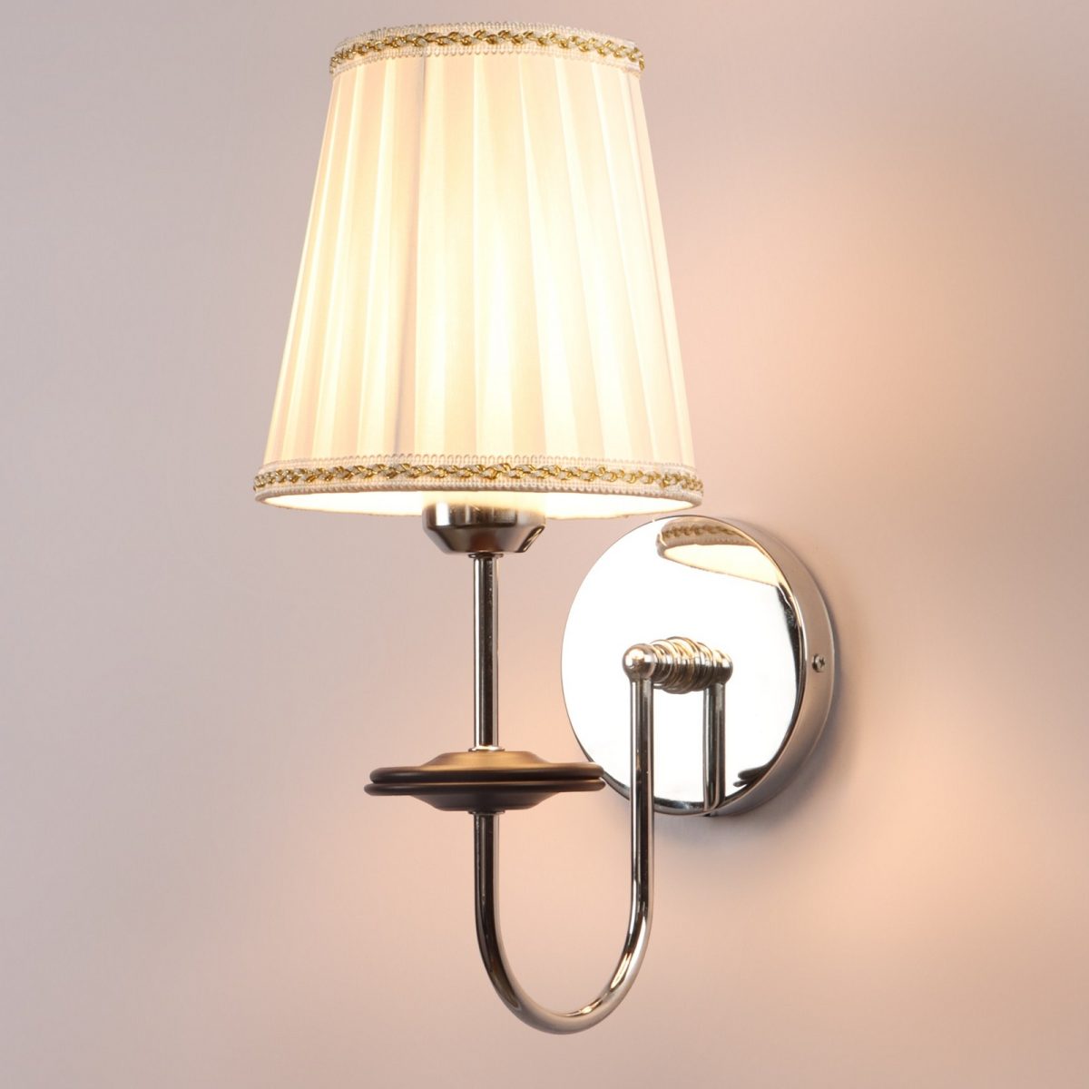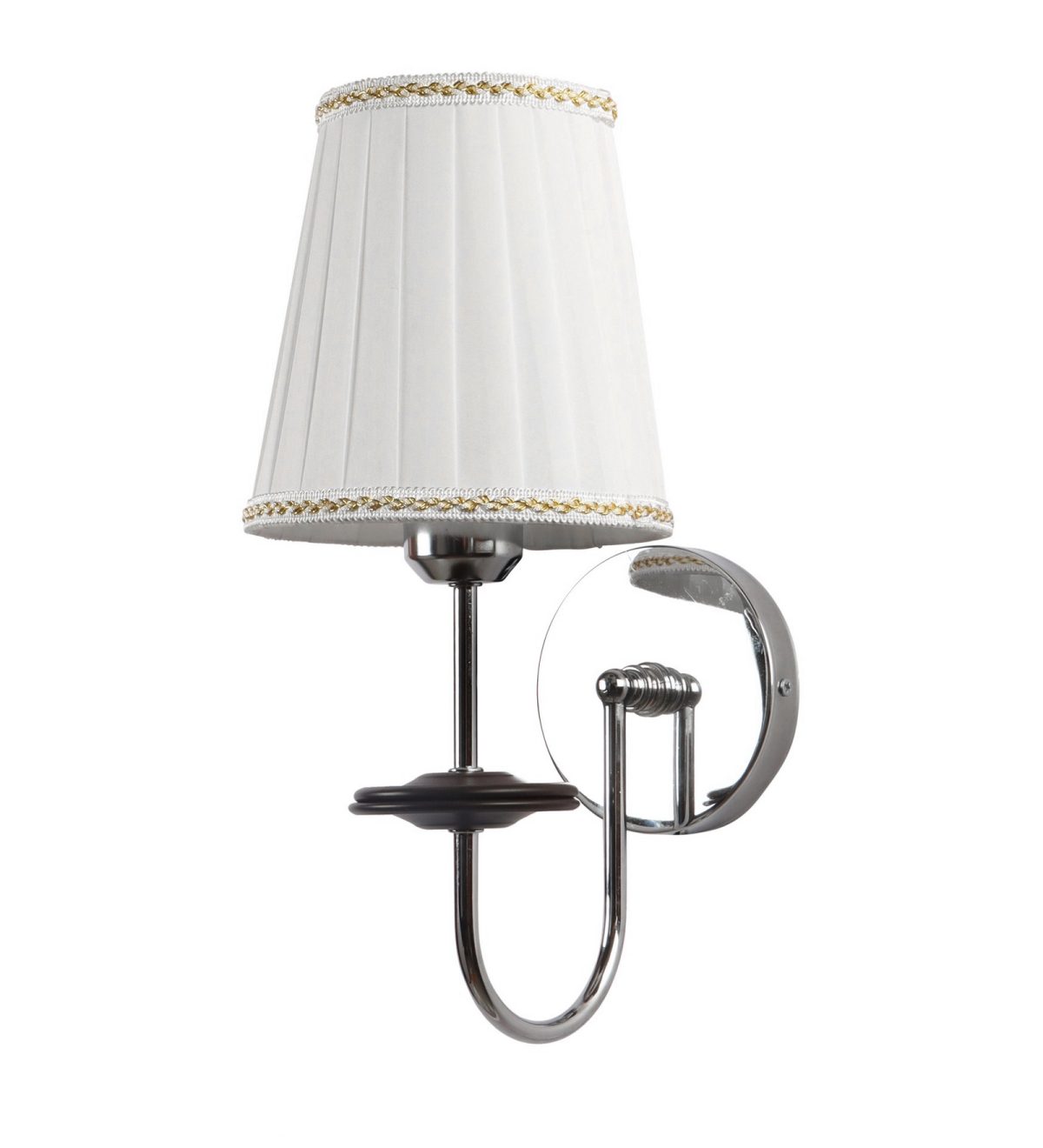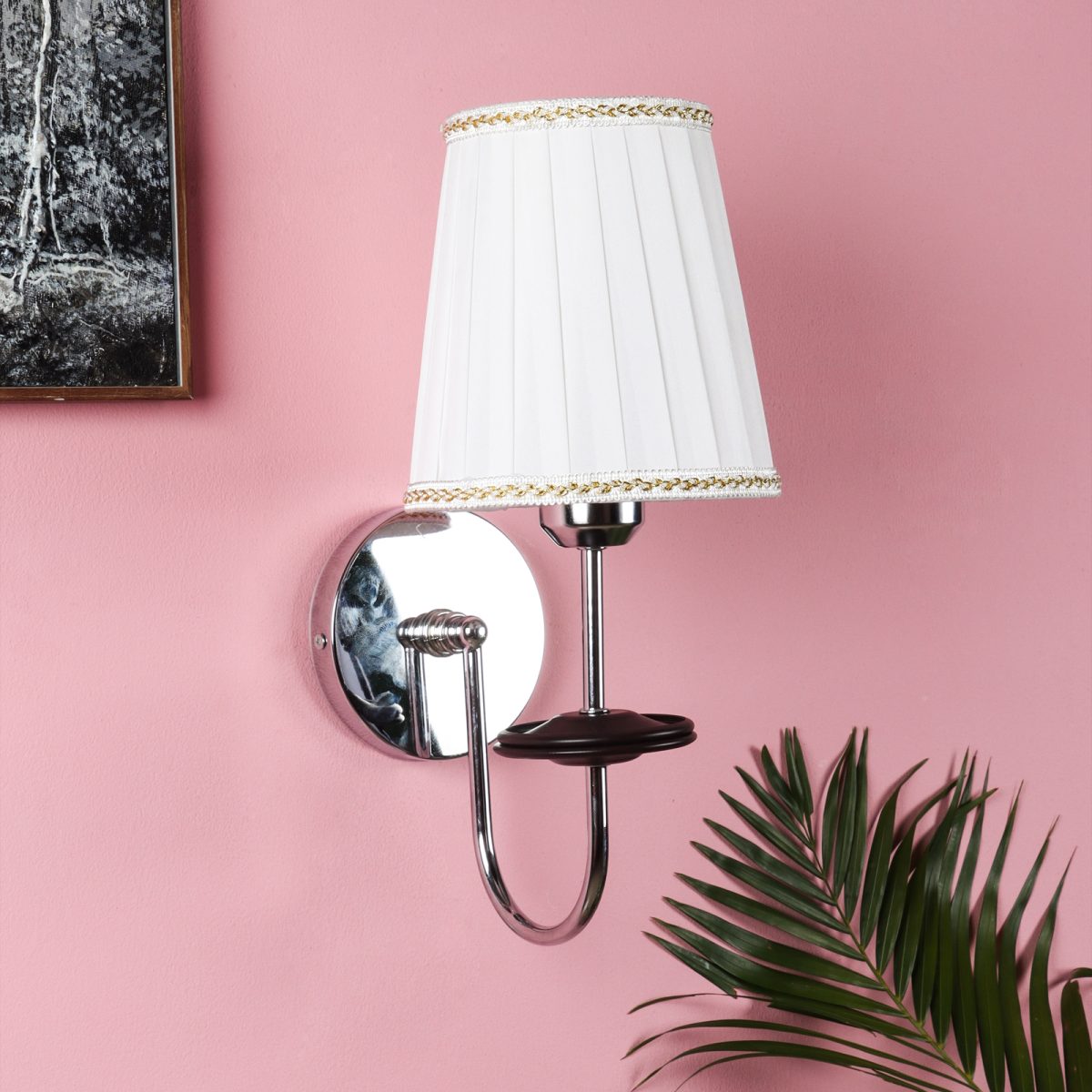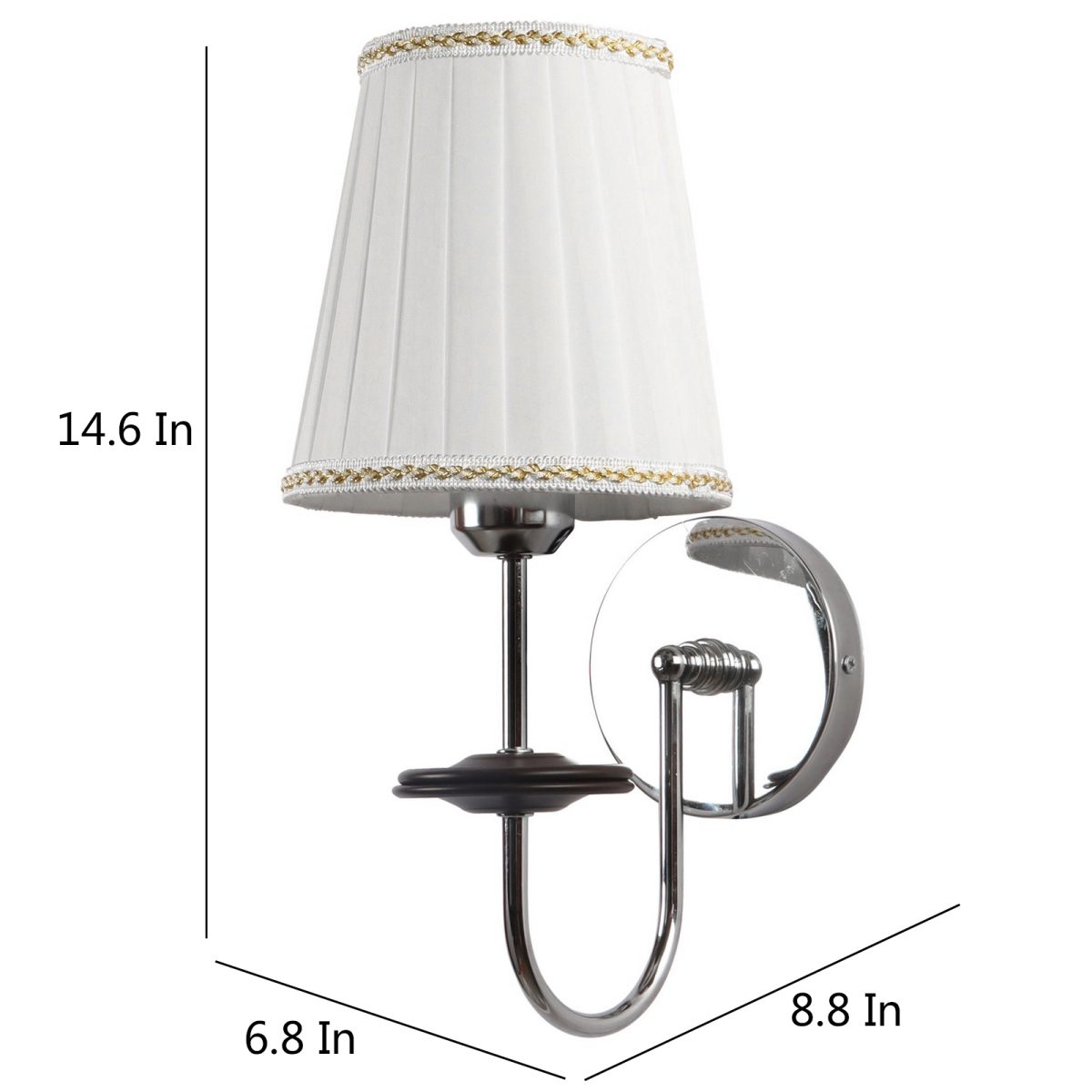 Silver (chrome) finish single wall light with taper off white fabric shade. It is maintenance free, comes with an E27 holder, only the change of lamp is required, which is available locally everywhere. Application includes both residential and commercial premises wherever it matches with your interiors. It is ideal for installing on both sides of the bed at a low height. Ideal for hotel or guest rooms.Matching double wall light code – WL2682. LAMP NOT INCLUDED.