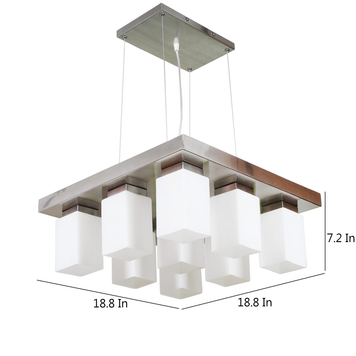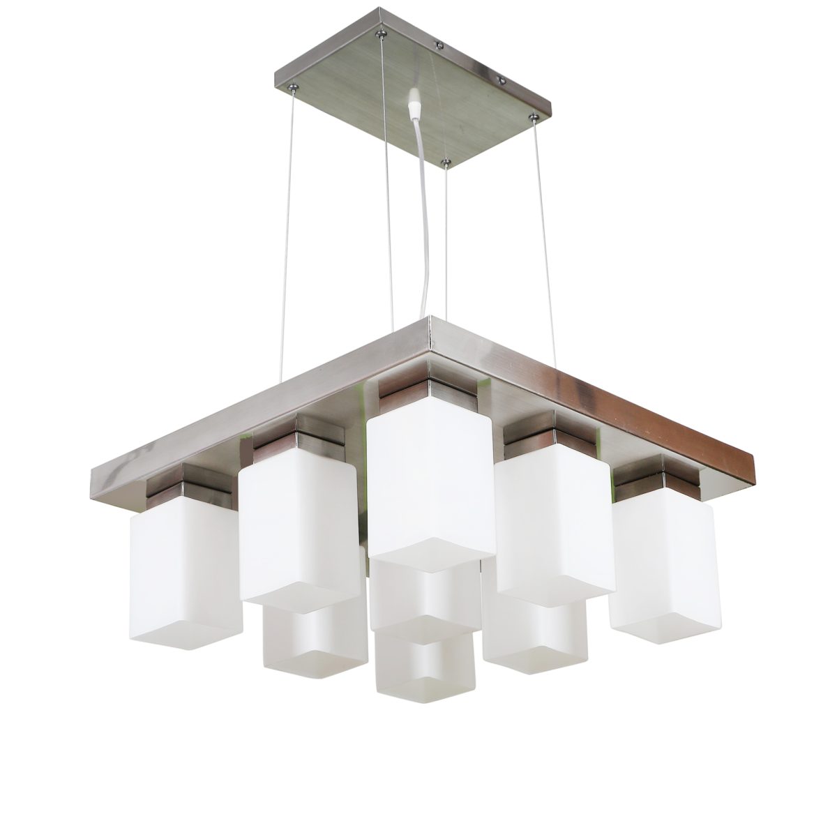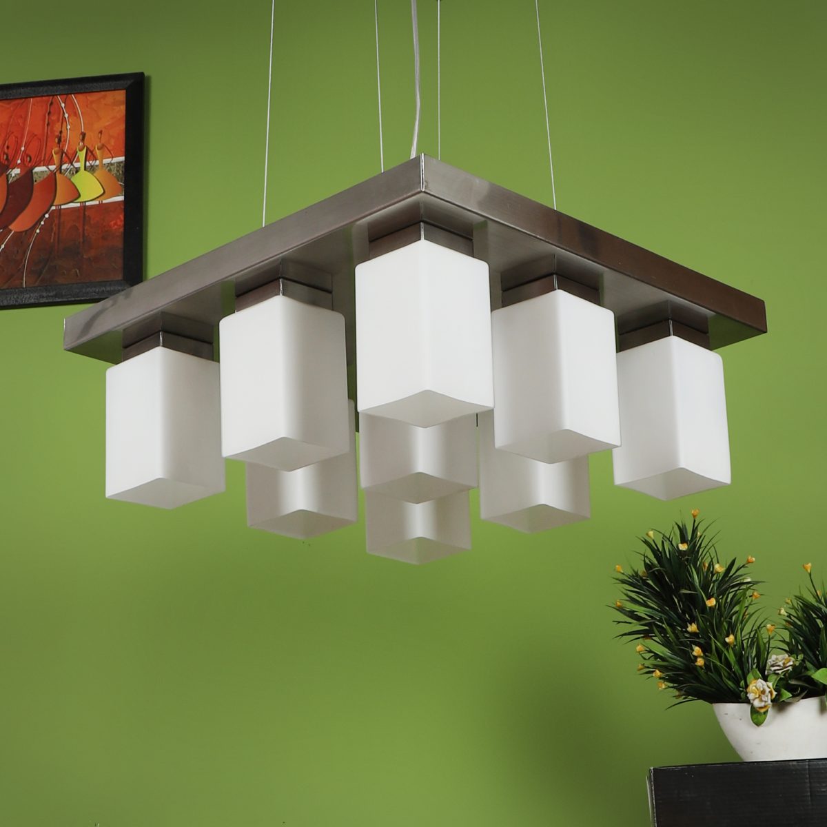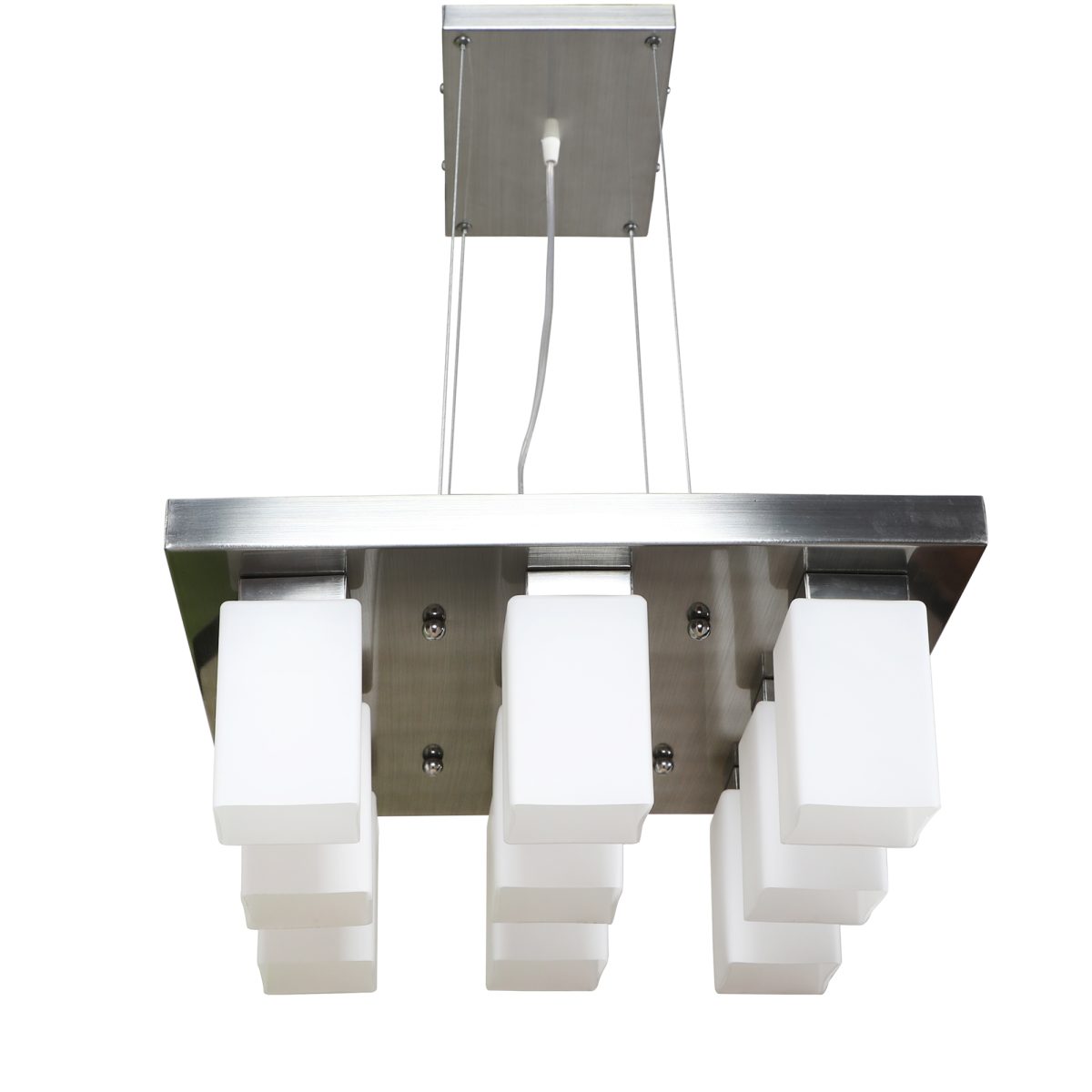 Silver (satin nickel) finish, modern square long glass mounted on a mild steel plate having nine lamps made of mild steel and glass. It is one of the regular design which is never out of trend and is among one of the best sellers. The suspension can be adjusted at time of installation to the desired height. It is maintenance free, easy to remove glass and wash them, comes with an E27 holder, only the change of lamp is required, which is available locally everywhere. Application includes both residential and commercial premises wherever it matches with your interiors. Other variations (color and size) in hanging light – HL3678, HL3651, HL3652. Related chandeliers – CH188, CH189, CH172, CH173. Matching wall light code – Wl1894, WL1895, WL1896, WL1897, WL1898, WL1899. Lamp not included.