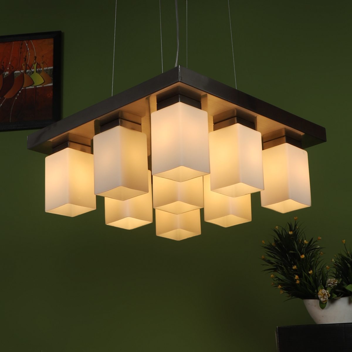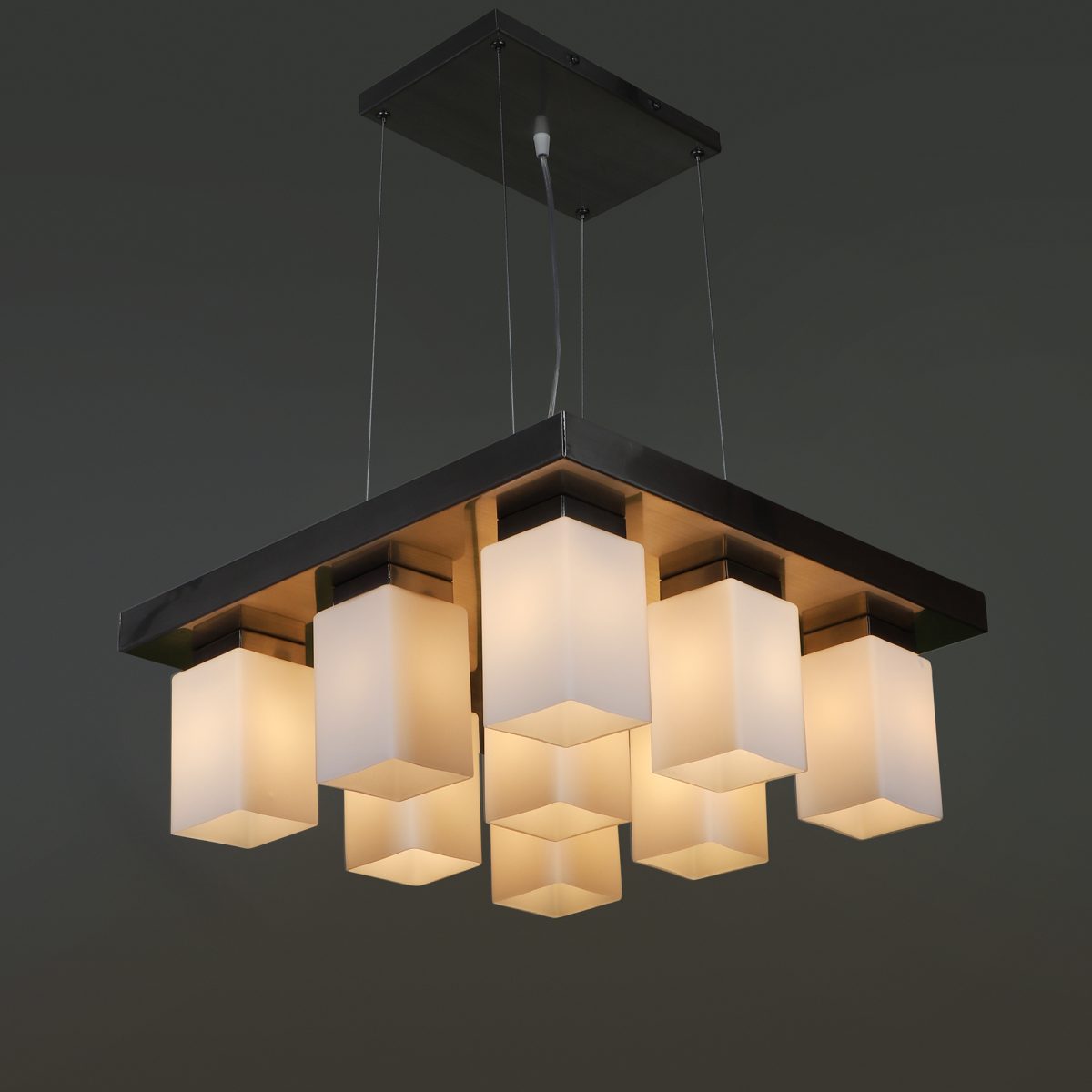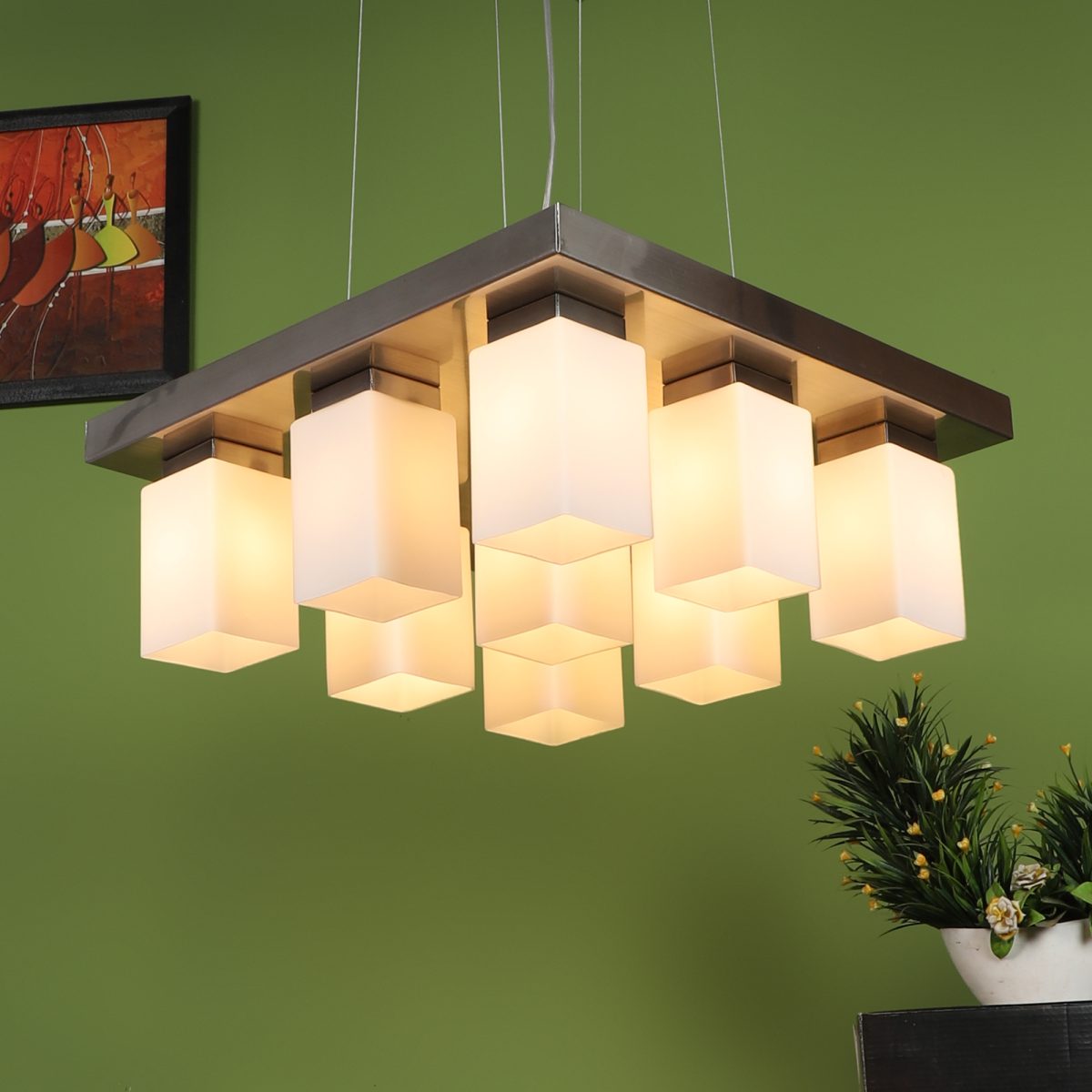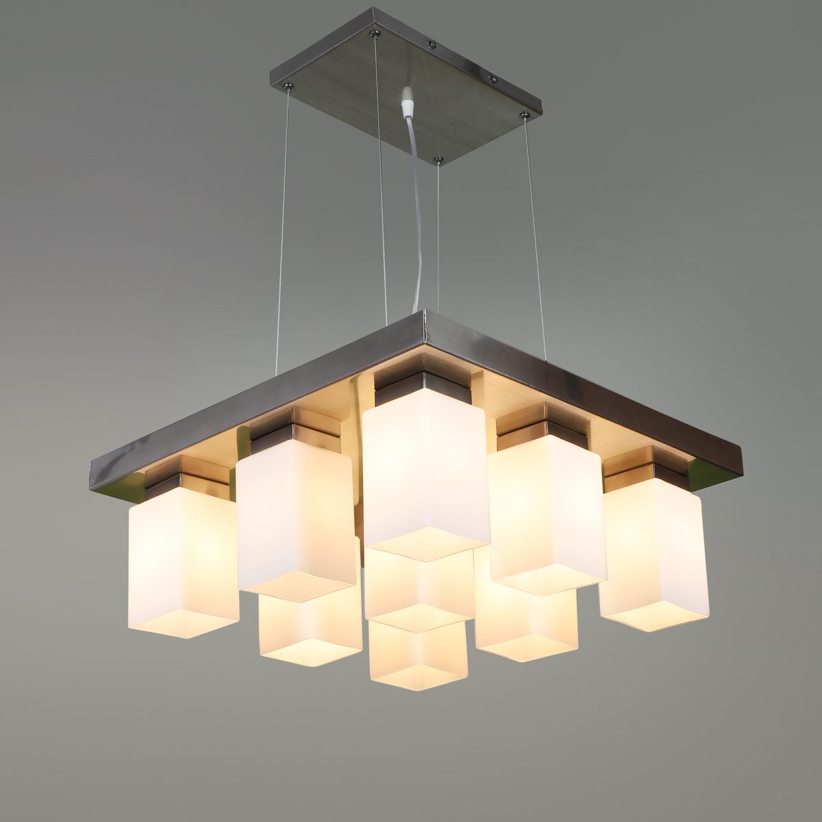 Silver (satin nickel) finish, modern square long glass mounted on a mild steel plate having nine lamps made of mild steel and glass. It is one of the regular design which is never out of trend and is among one of the best sellers. The suspension can be adjusted at time of installation to the desired height. It is maintenance free, easy to remove glass and wash them, comes with an E27 holder, only the change of lamp is required, which is available locally everywhere. Application includes both residential and commercial premises wherever it matches with your interiors. Other variations (color and size) in hanging light – HL3678, HL3651, HL3652. Related chandeliers – CH188, CH189, CH172, CH173. Matching wall light code – Wl1894, WL1895, WL1896, WL1897, WL1898, WL1899. Lamp not included.