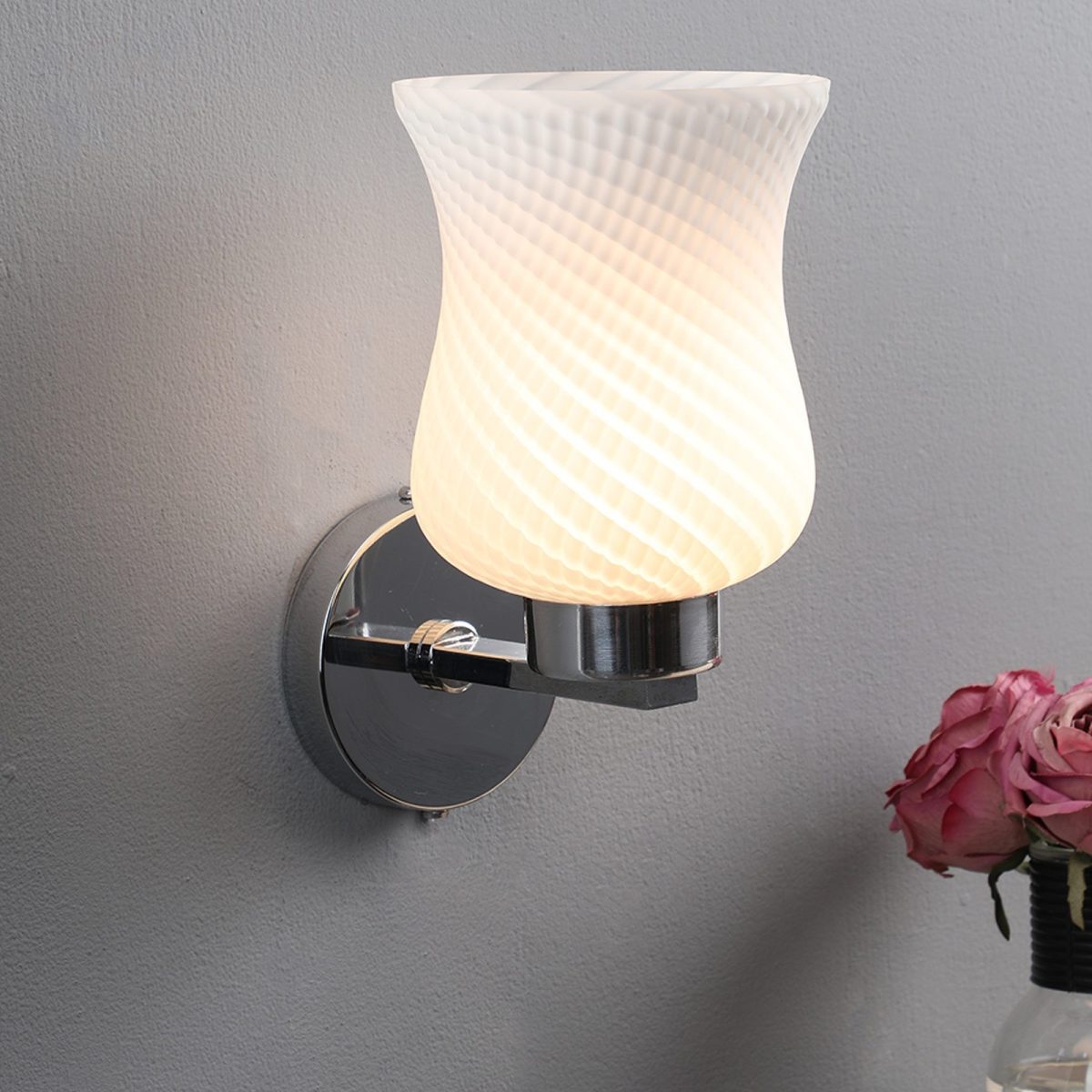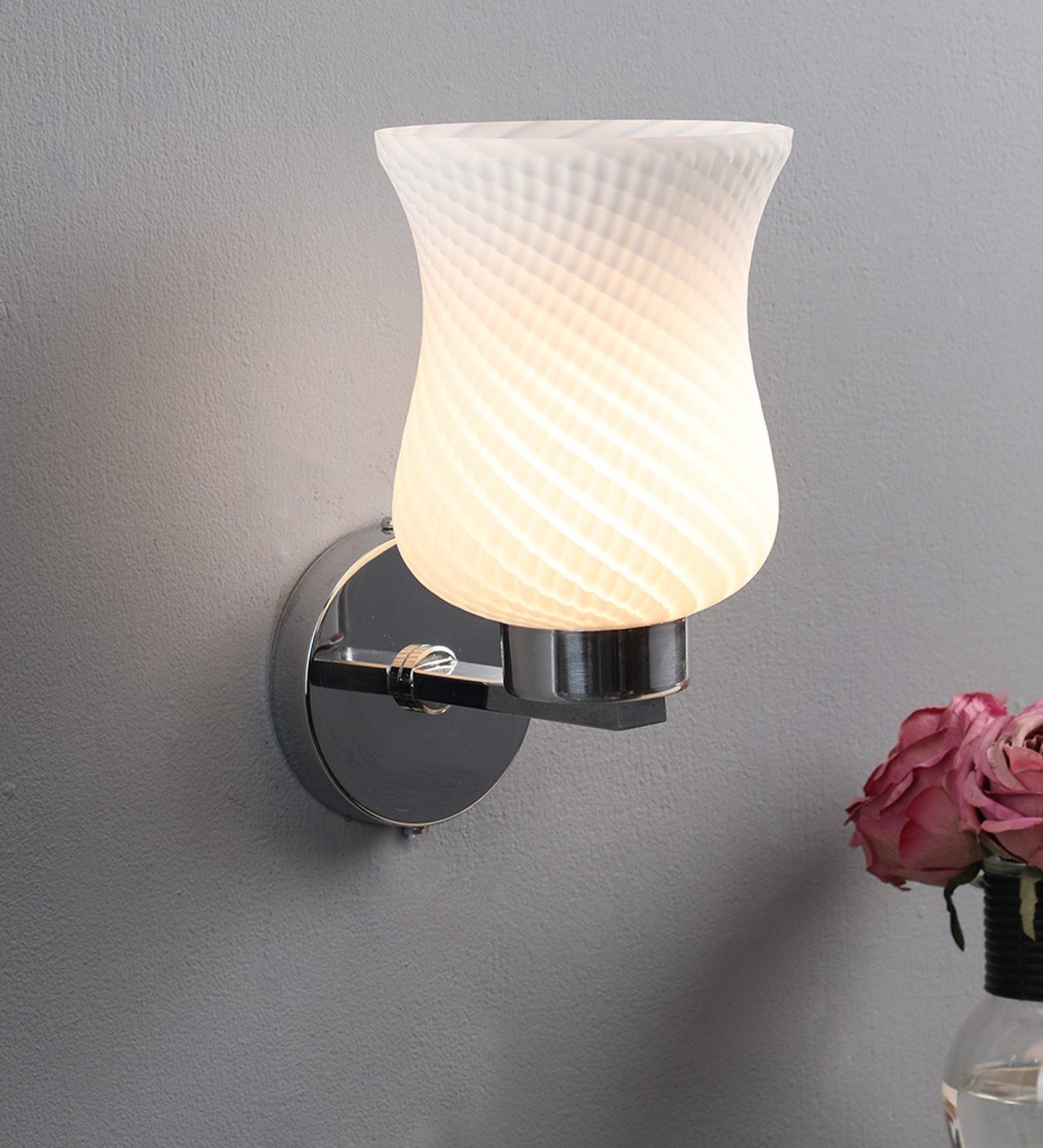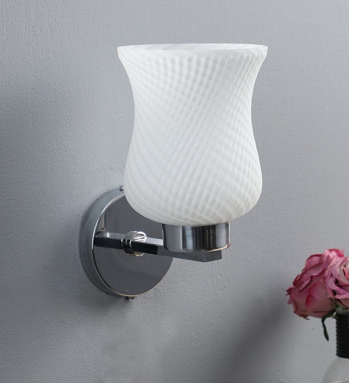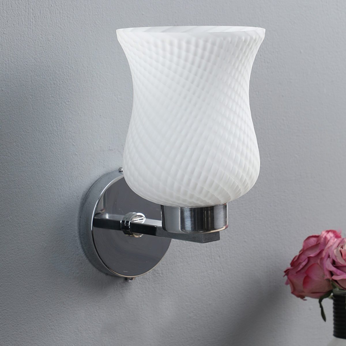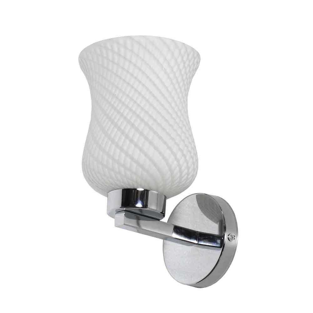 Modern silver (chrome) single wall light made of mild steel, with a bell shaped white glass having self design which looks amazing when lit. It is maintenance free, easy to remove glass and wash it, comes with an E27 holder, only the change of lamp is required, which is available locally everywhere. You can of course swap out the bulb for one that is dimmable, has a higher light output or a different color temperature. Application includes both residential and commercial premises wherever it matches with your interiors. Matching double wall light code – WL1285. Matching hanging light code – HL3841-1, HL3841-3. Matching ceiling light code – CL413. Can be customized as per requirement in case of bulk quantities. Lamp not included.