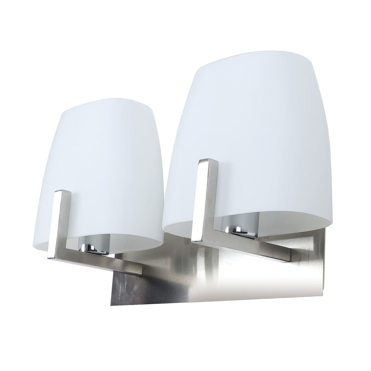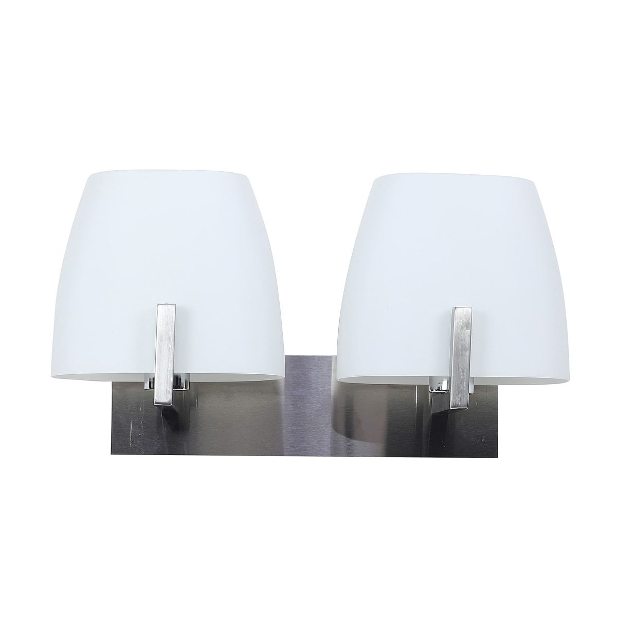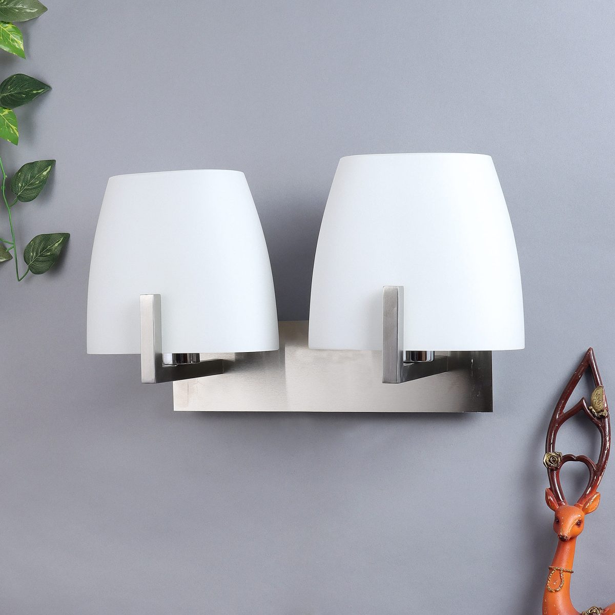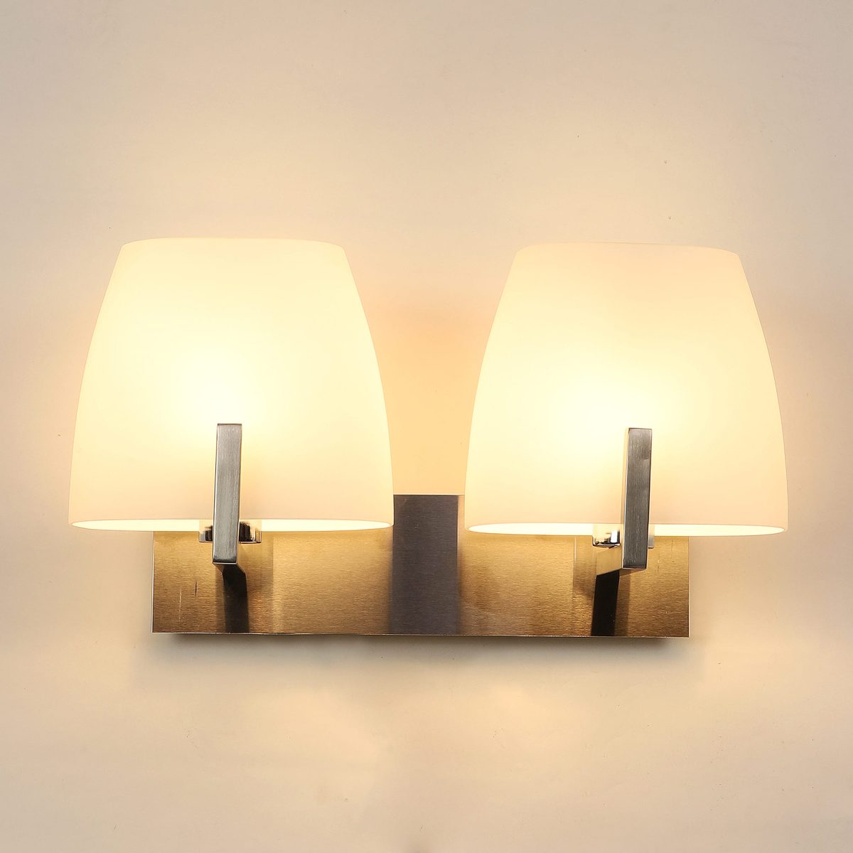 Modern silver (satin nickel) double wall light made of mild steel, with two big taper white glasses. It is maintenance free, glass is open from both the sides that prevents any dust collection, easy to remove glass and wash it, comes with an E27 holder, only the change of lamp is required, which is available locally everywhere. You can of course swap out the bulb for one that is dimmable, has a higher light output or a different color temperature. Application includes both residential and commercial premises wherever it matches with your interiors. Matching variations (number of lights and color) in wall light code – WL1218, WL1321, WL1322. Can be customized as per requirement in case of bulk quantities. It is one of the top selling product in our catalogue. Lamp not included.