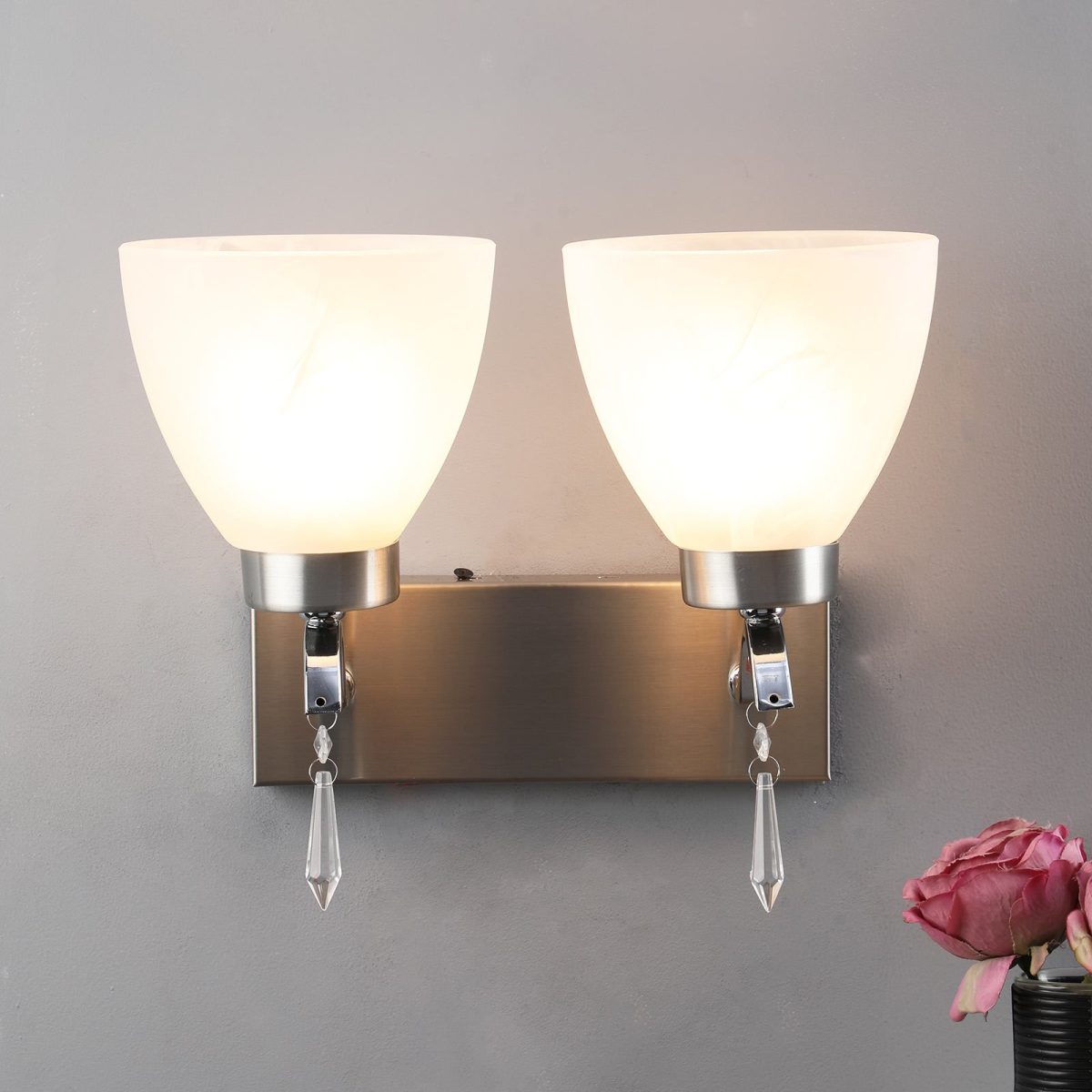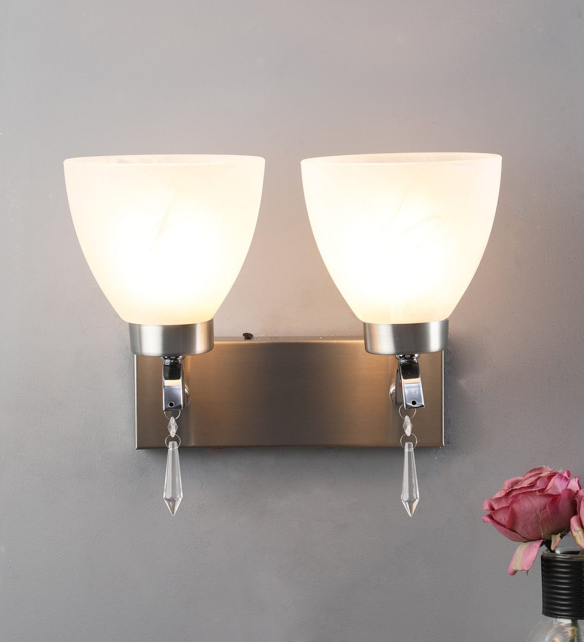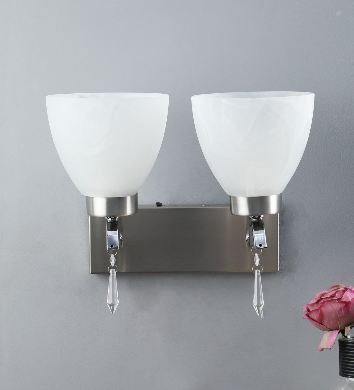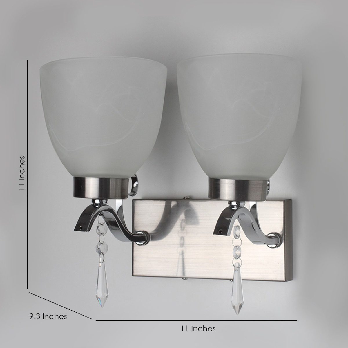 Modern silver (satin nickel,chrome) double wall light made of mild steel having crystals with tapered heavy glasses with self design which looks amazing when lit. It is maintenance free, easy to remove glass and wash it, comes with an E27 holder, only the change of lamp is required, which is available locally everywhere. You can of course swap out the bulb for one that is dimmable, has a higher light output or a different color temperature. Application includes both residential and commercial premises wherever it matches with your interiors. Matching single wall light code – WL1791. Can be customized as per requirement in case of bulk quantities. Lamp not included.