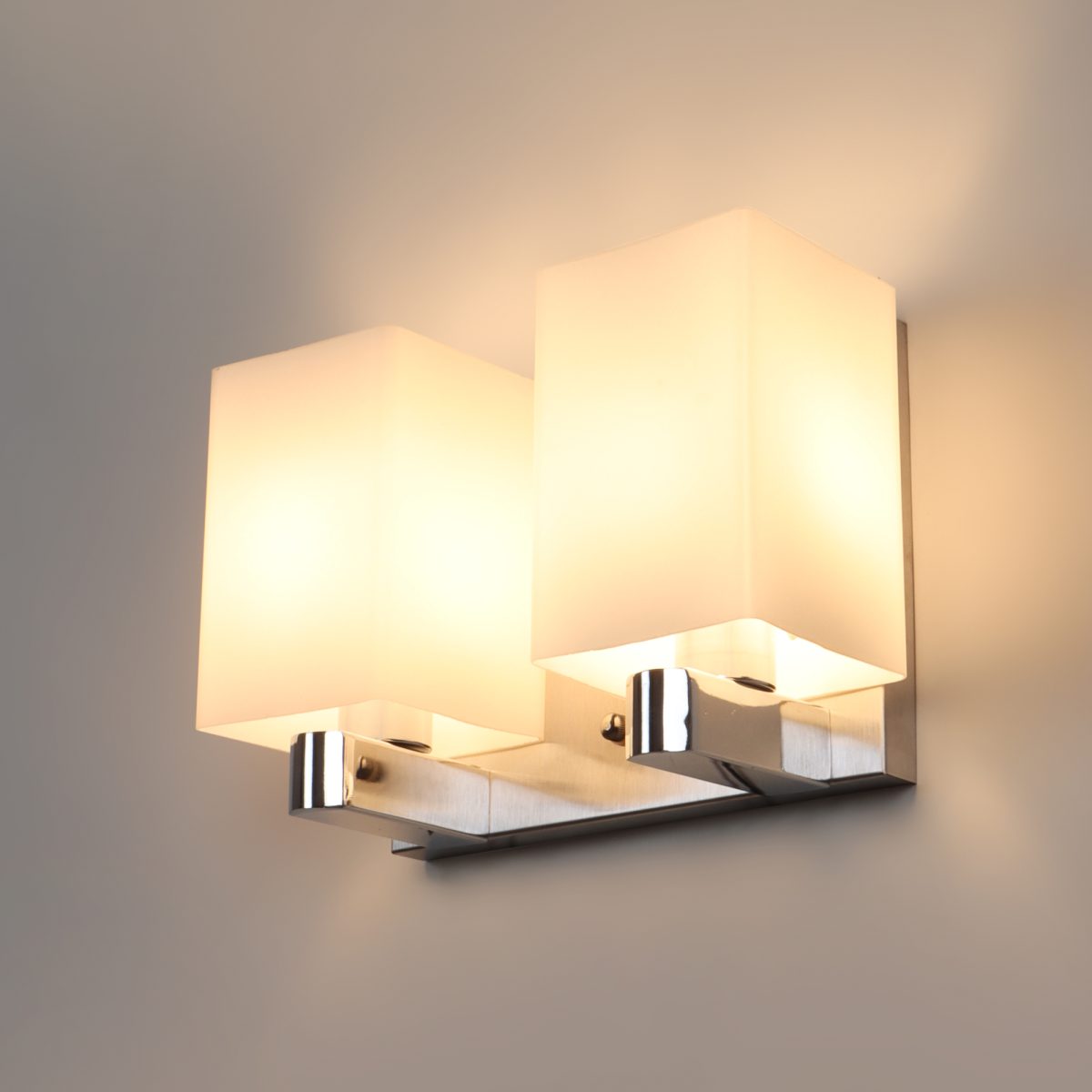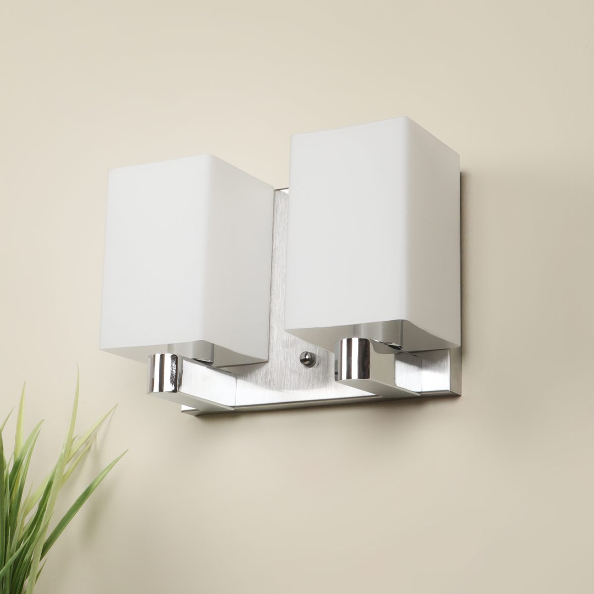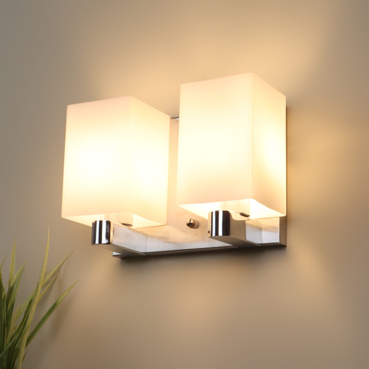 Modern silver (chrome) double wall light made of mild steel, with two big square long white glasses. It is maintenance free, glass is open from both the sides that prevents any dust collection, easy to remove glass and wash it, comes with an E27 holder, only the change of lamp is required, which is available locally everywhere. You can of course swap out the bulb for one that is dimmable, has a higher light output or a different color temperature. Application includes both residential and commercial premises wherever it matches with your interiors. Can be customized as per requirement. LAMP NOT INCLUDED.