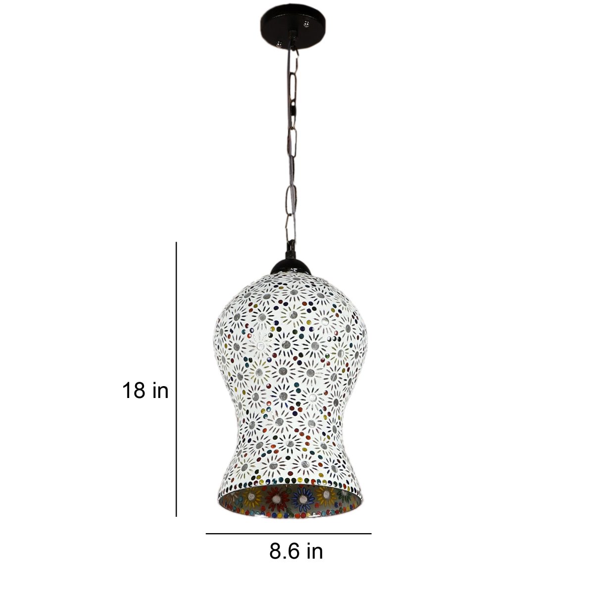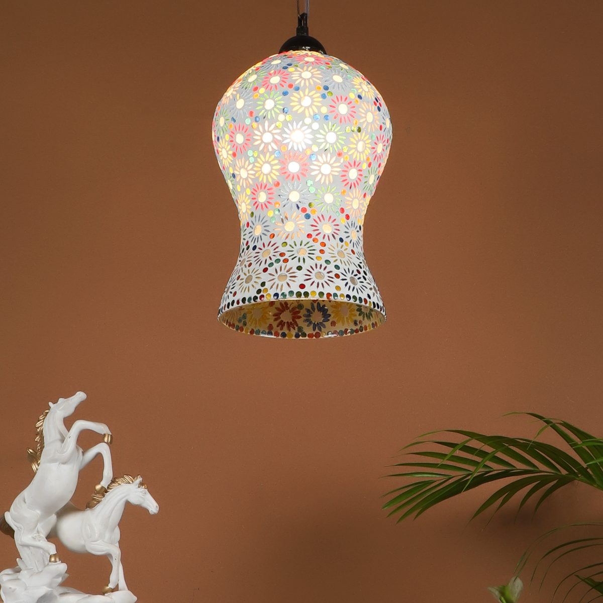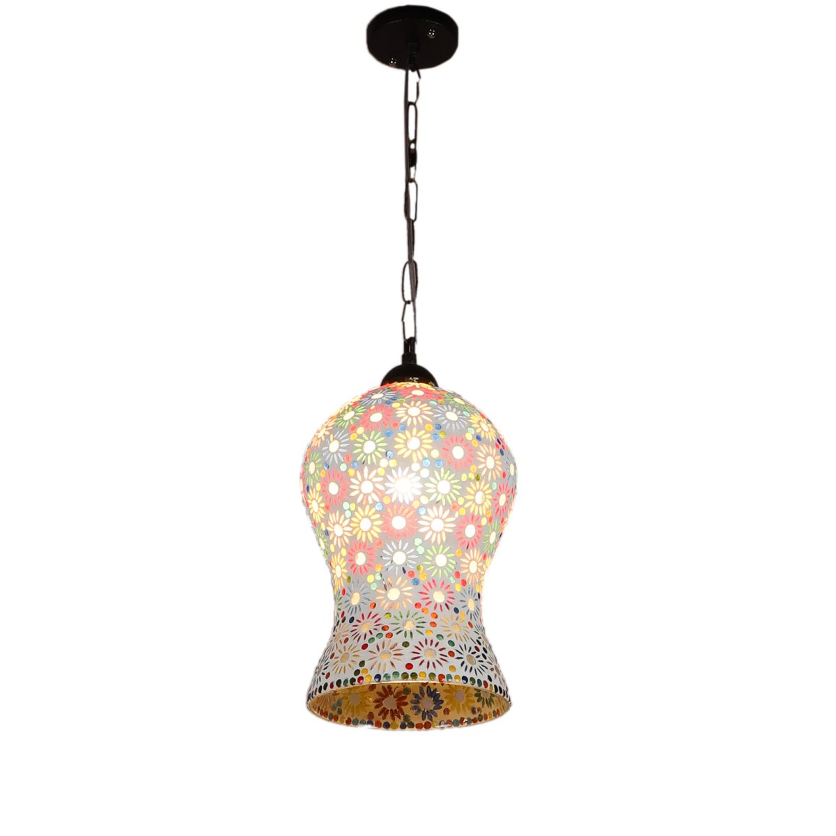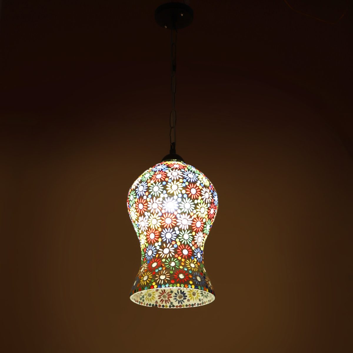 Dark brown (wood) finish, multi colored bell shaped glass, single hanging light made of mild steel and glass. When lit it highlights a colorful floral design. The suspension can be adjusted at time of installation to the desired height. It is maintenance free, easy to remove glass and wash them, comes with an E27 holder, only the change of lamp is required, which is available locally everywhere. Application includes both residential and commercial premises wherever it matches with your interiors. Also available in small size with code HL3843. Can be customized as per requirement in case of bulk quantities. Lamp not included.