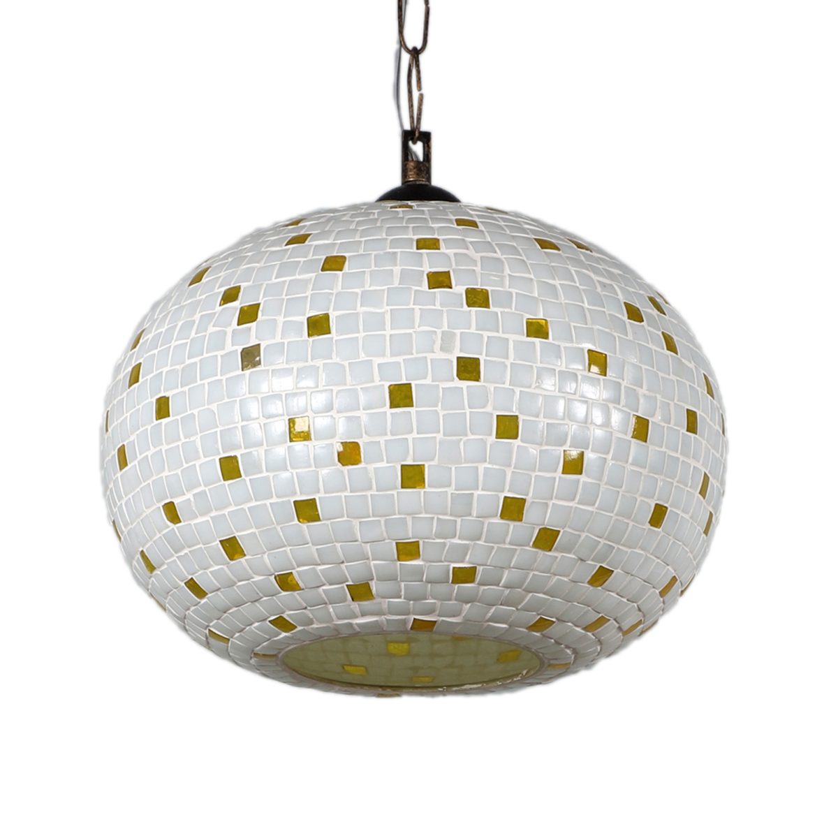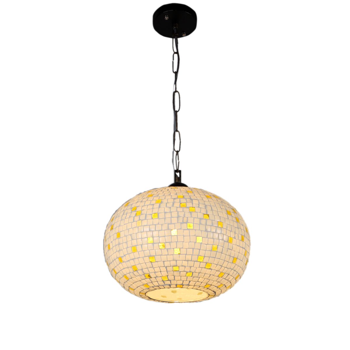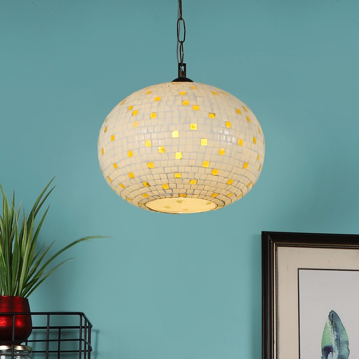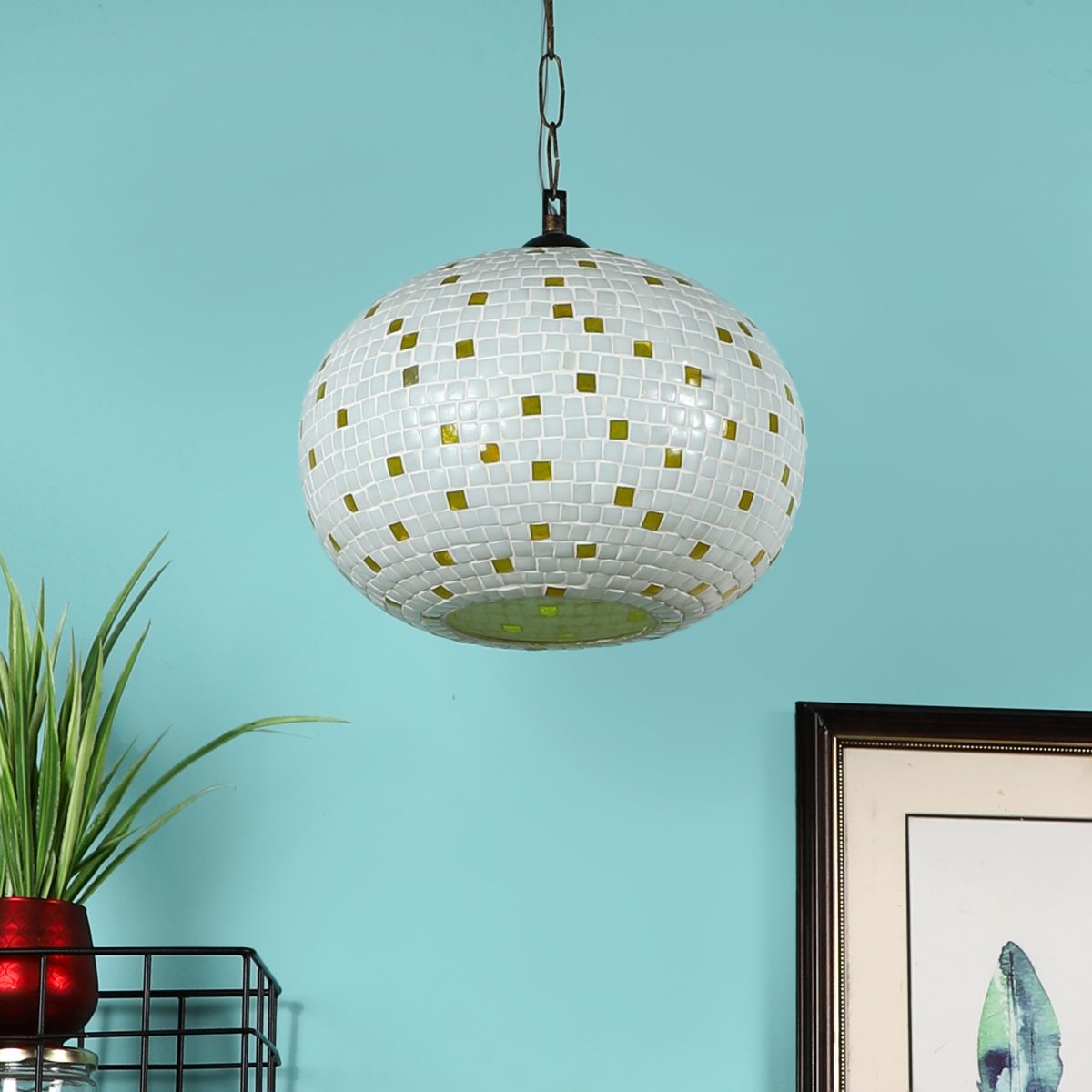Dark brown (wood) finish, multi colored big doom shaped glass, single hanging light made of mild steel and glass. When lit it highlights a colorful geometric / floral check design. The suspension can be adjusted at time of installation to the desired height. It is maintenance free, easy to remove glass and wash them, comes with an E27 holder, only the change of lamp is required, which is available locally everywhere. Application includes both residential and commercial premises wherever it matches with your interiors. Can be customized as per requirement in case of bulk quantities. Lamp not included.